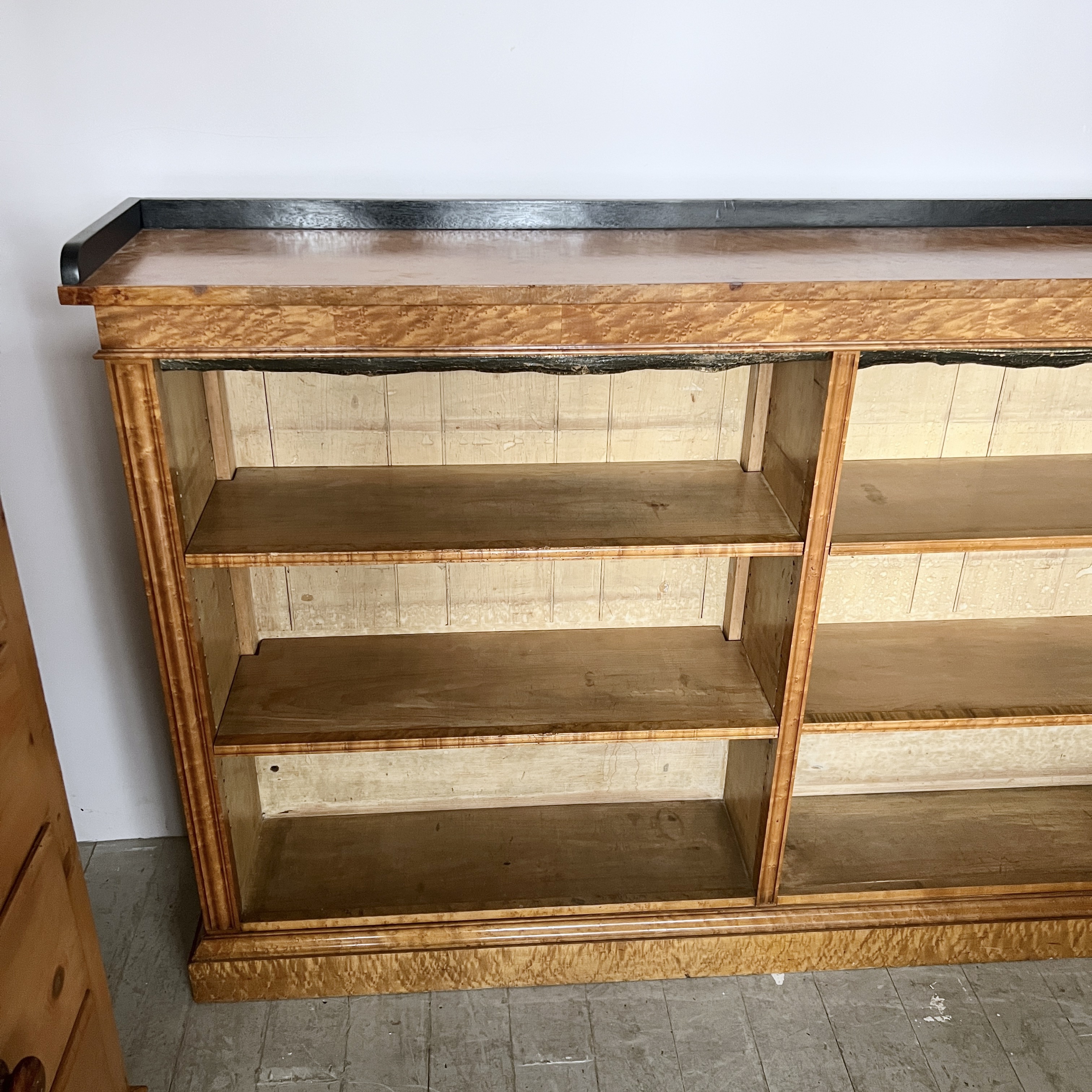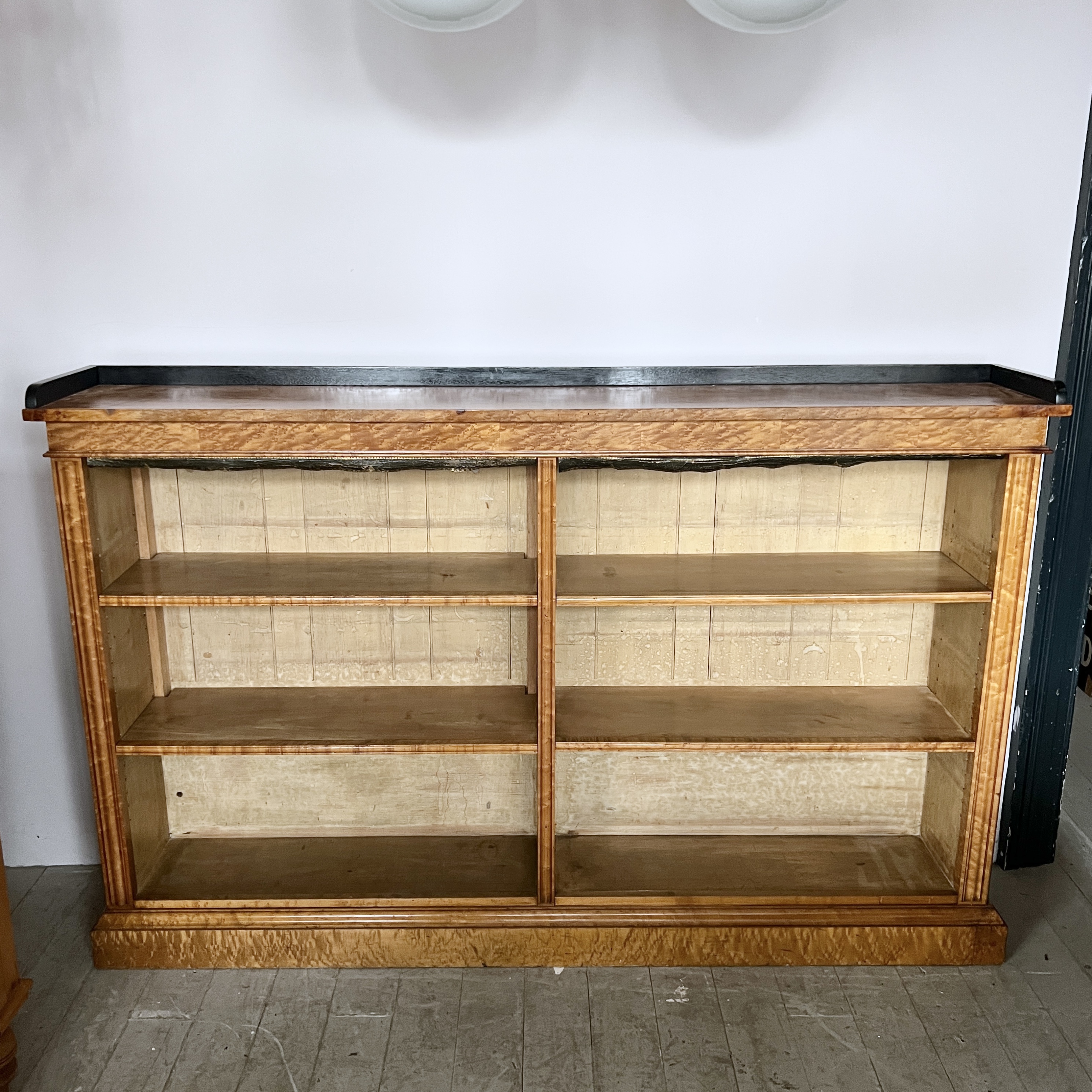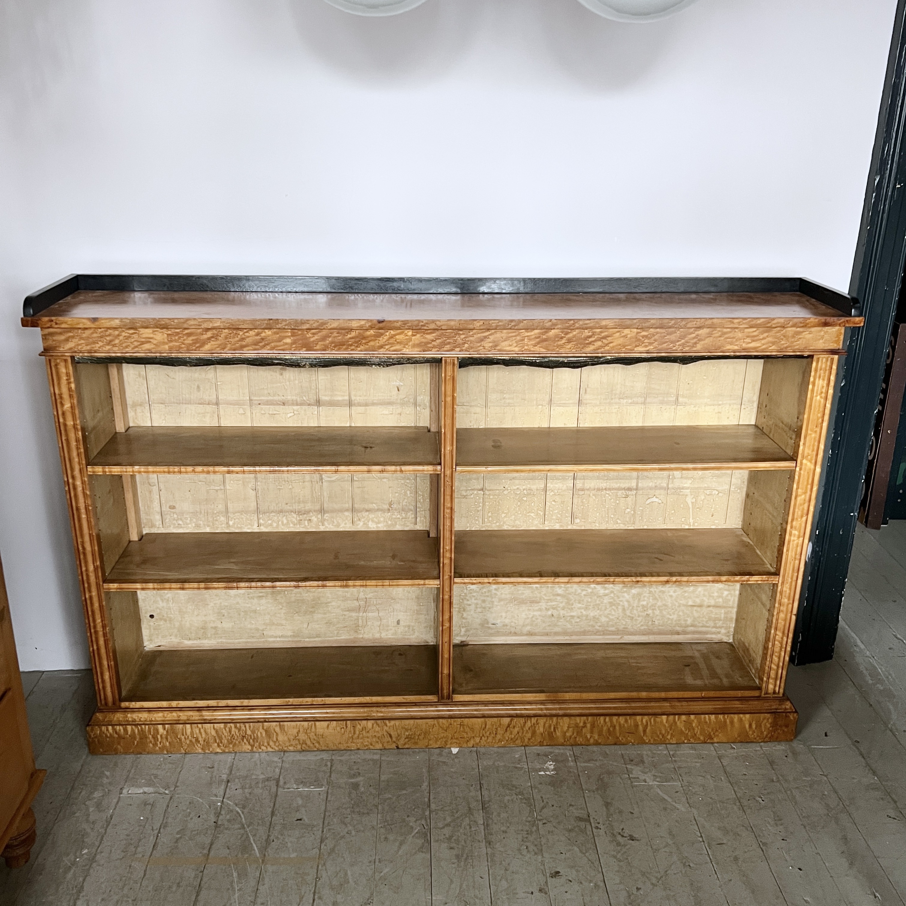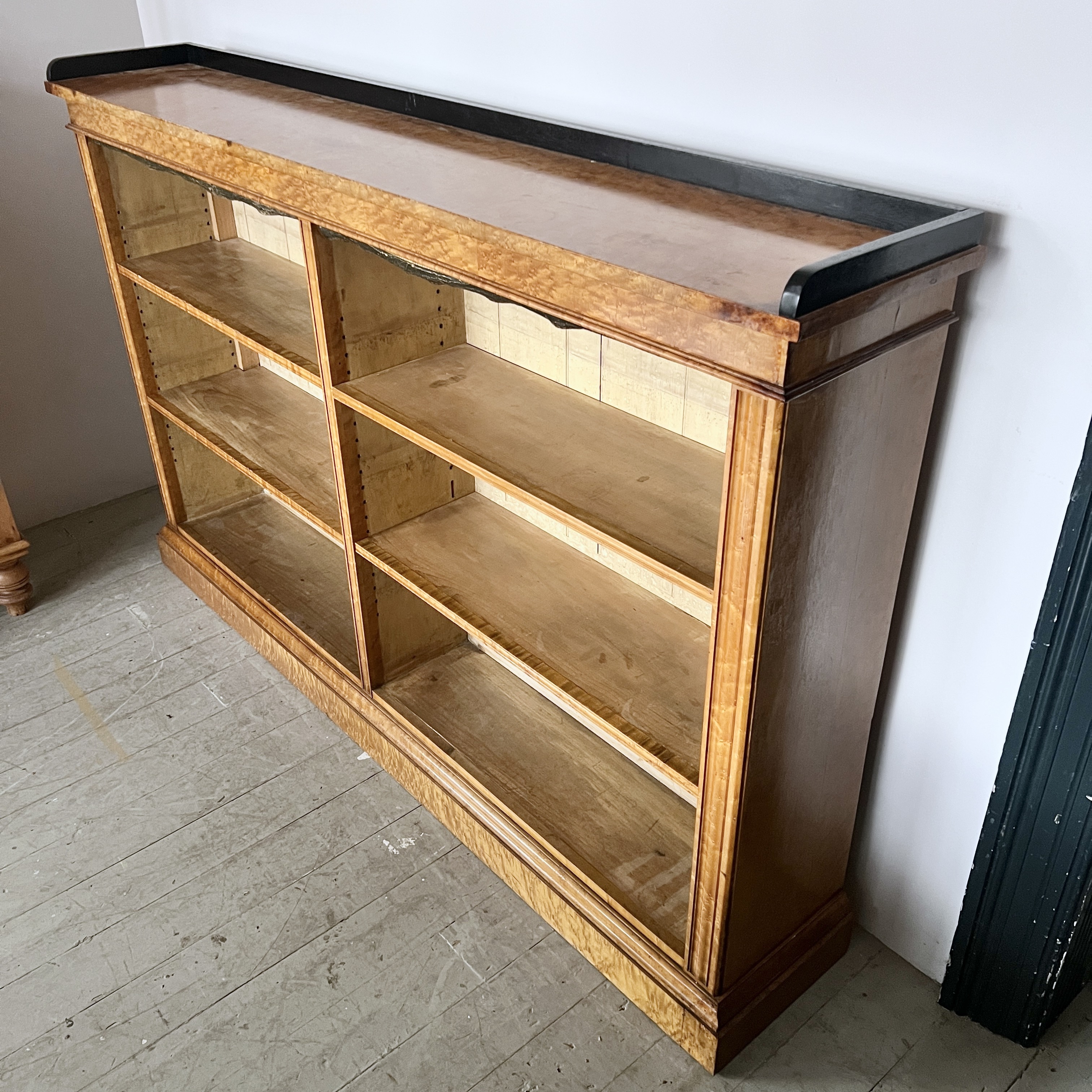 High quality 19th Century Golden Burr Walnut Victorian Bookcase has a rectangular moulded top finished with a contrasting ebonised gallery above four adjustable shelves. The bookcase retains the original tooled leather shelf frieze and stands on a plinth. The walnut has aged to a golden shade with a striking grain, good patina, is in very good condition. There are signs of historic woodworm in the piece.