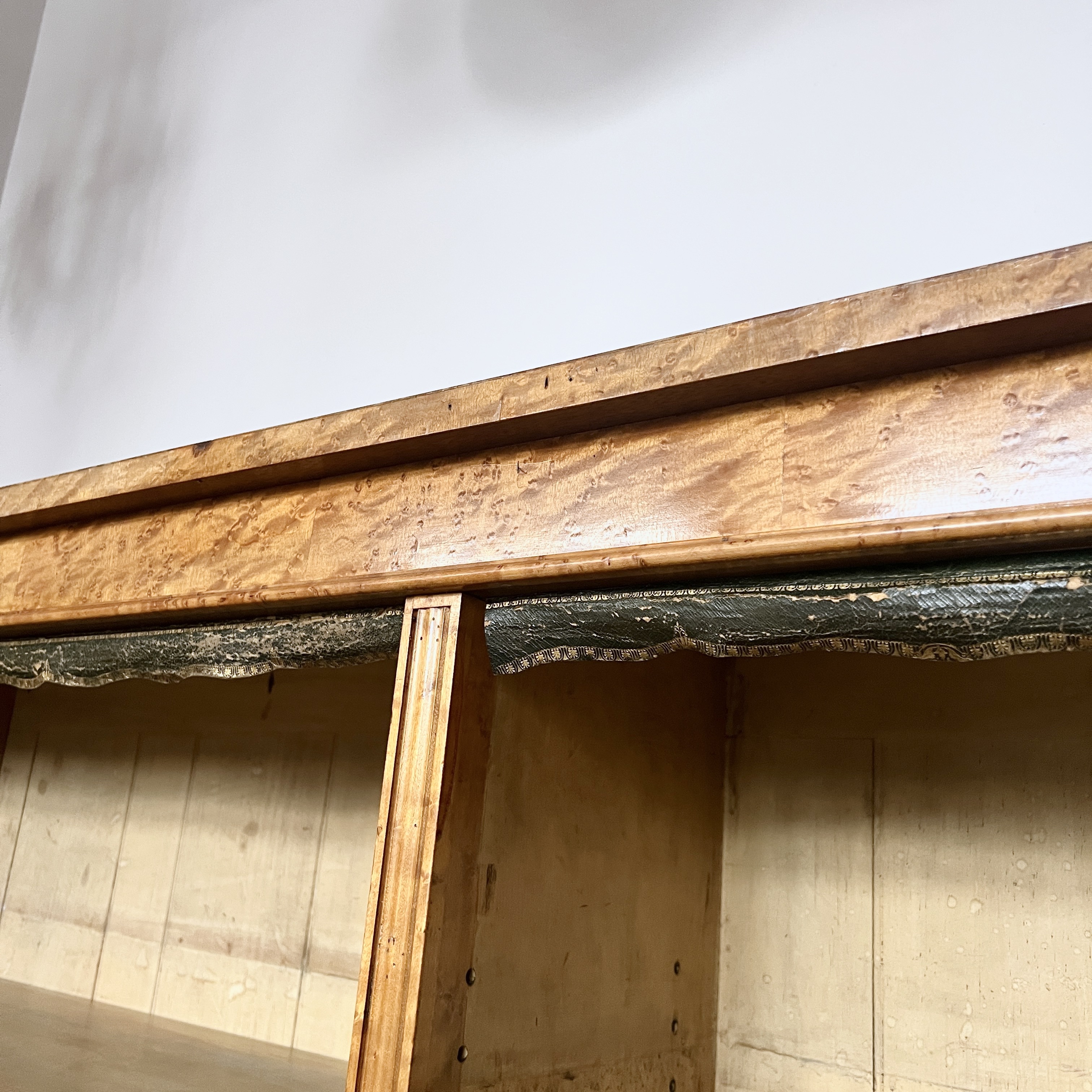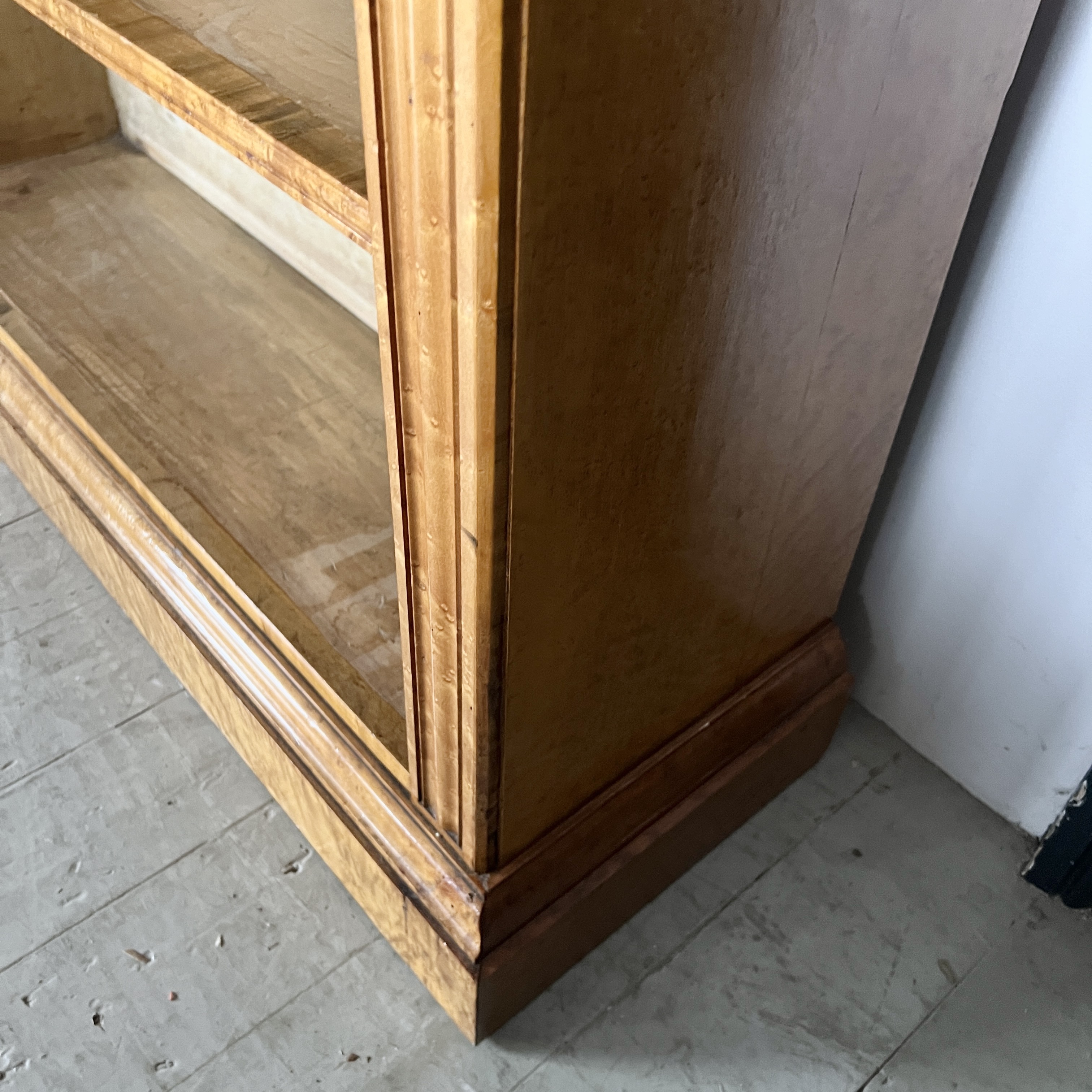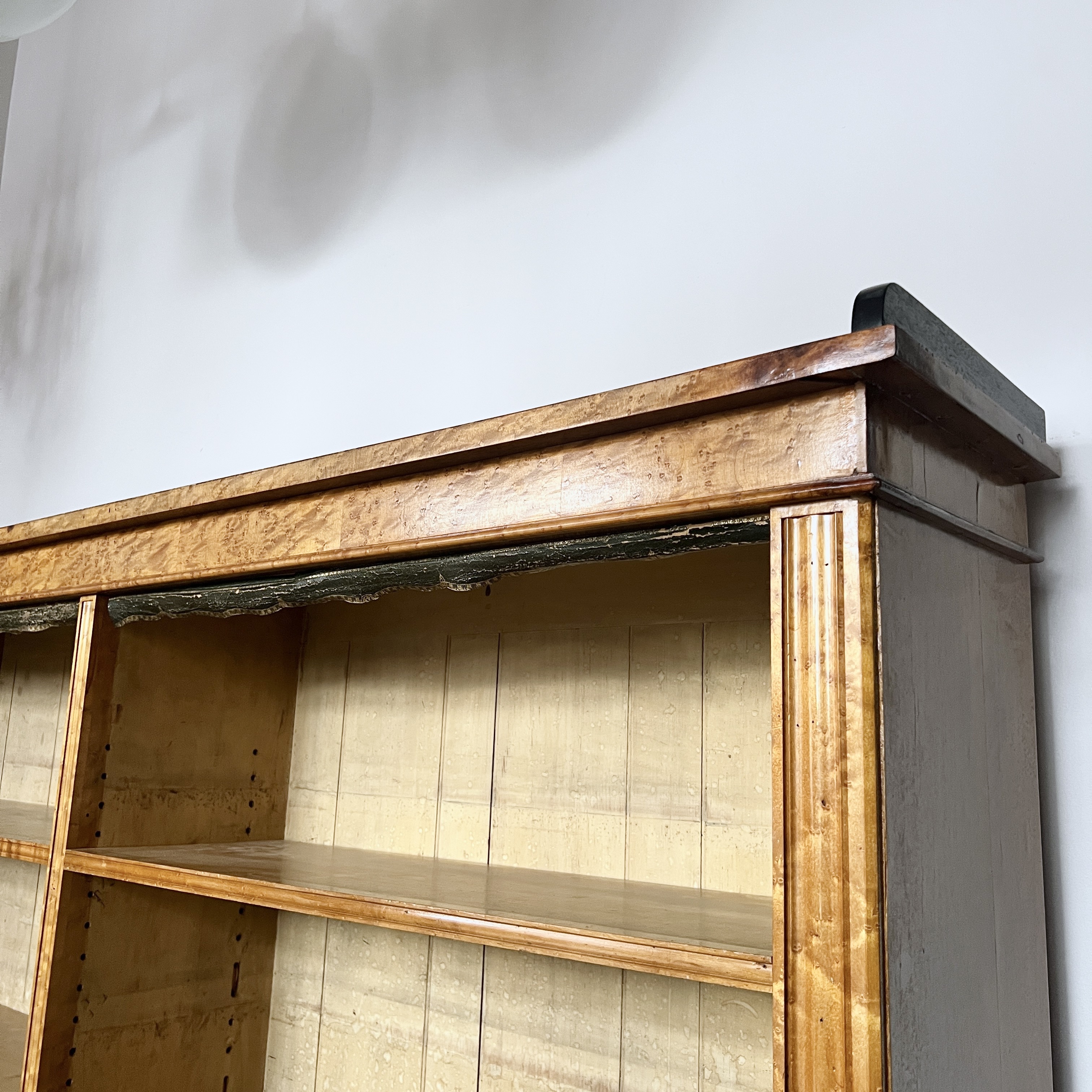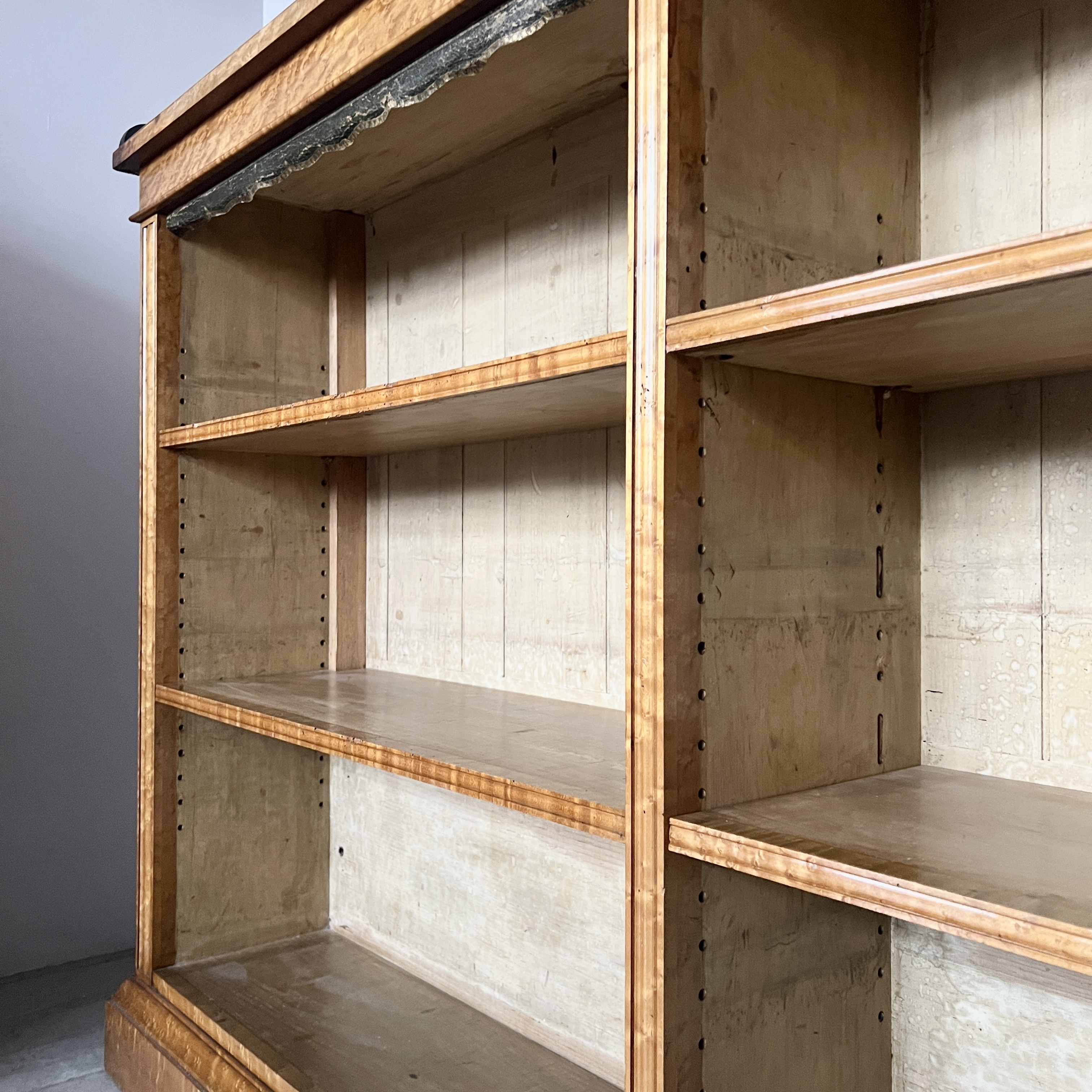 High quality 19th Century Golden Burr Walnut Victorian Bookcase has a rectangular moulded top finished with a contrasting ebonised gallery above four adjustable shelves. The bookcase retains the original tooled leather shelf frieze and stands on a plinth. The walnut has aged to a golden shade with a striking grain, good patina, is in very good condition. There are signs of historic woodworm in the piece.