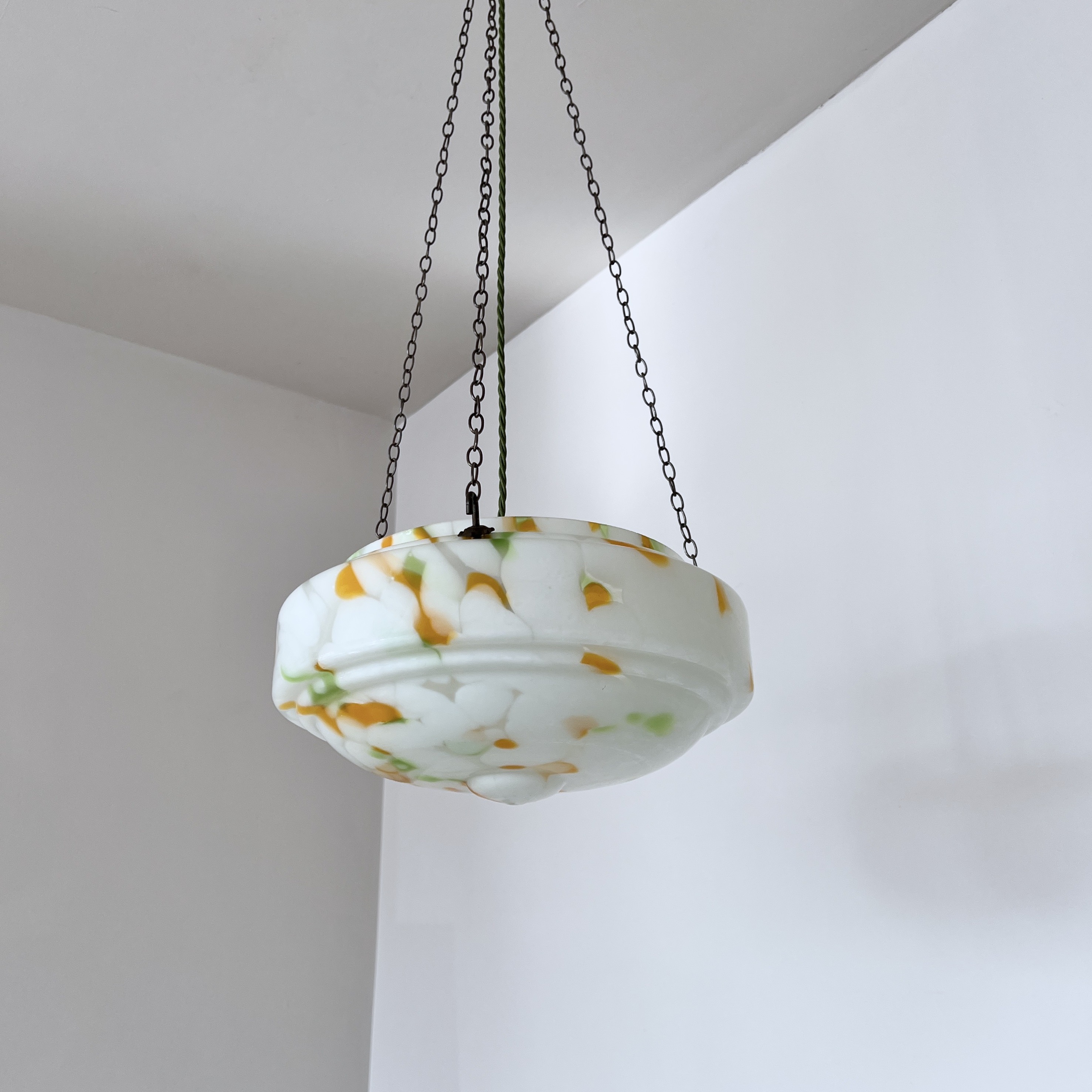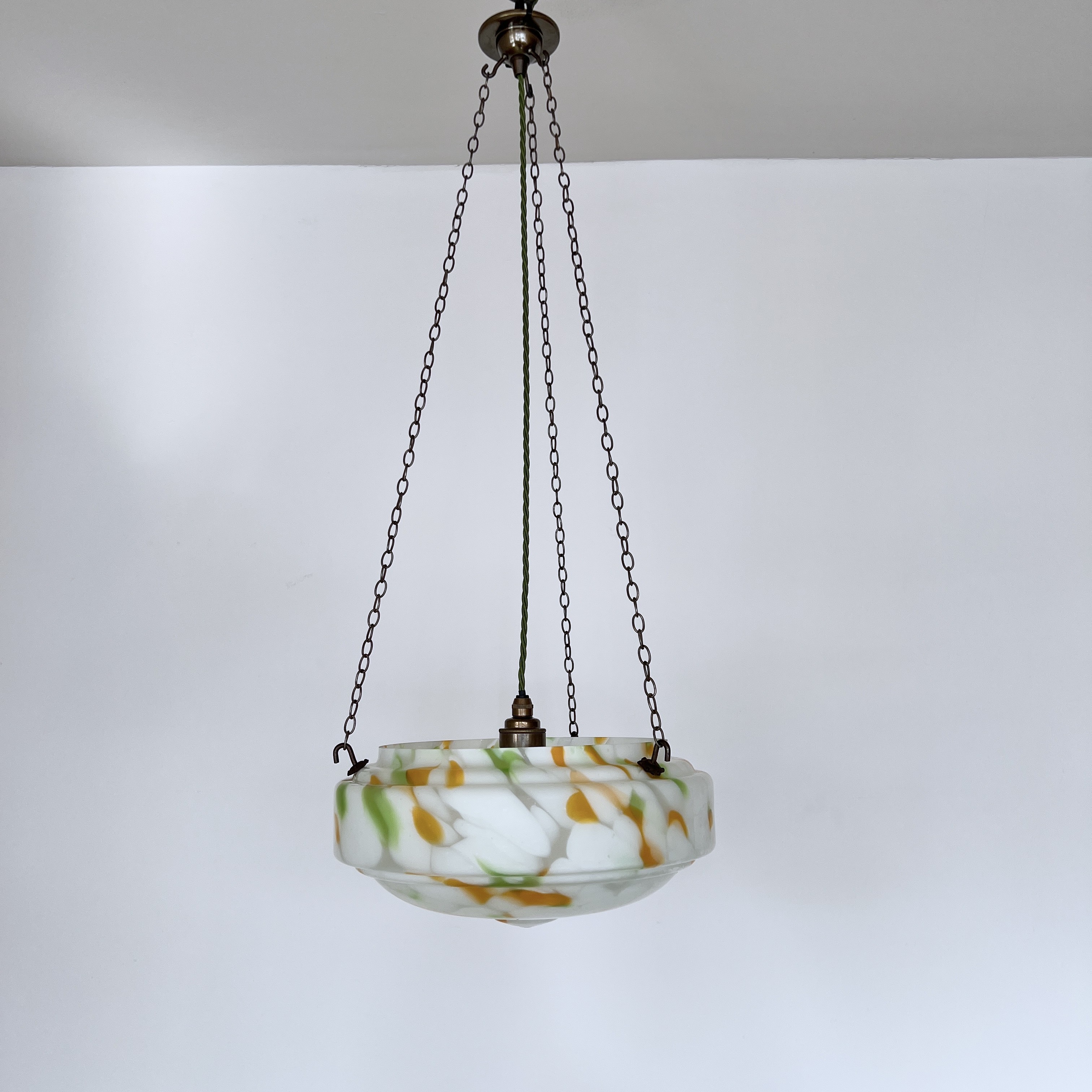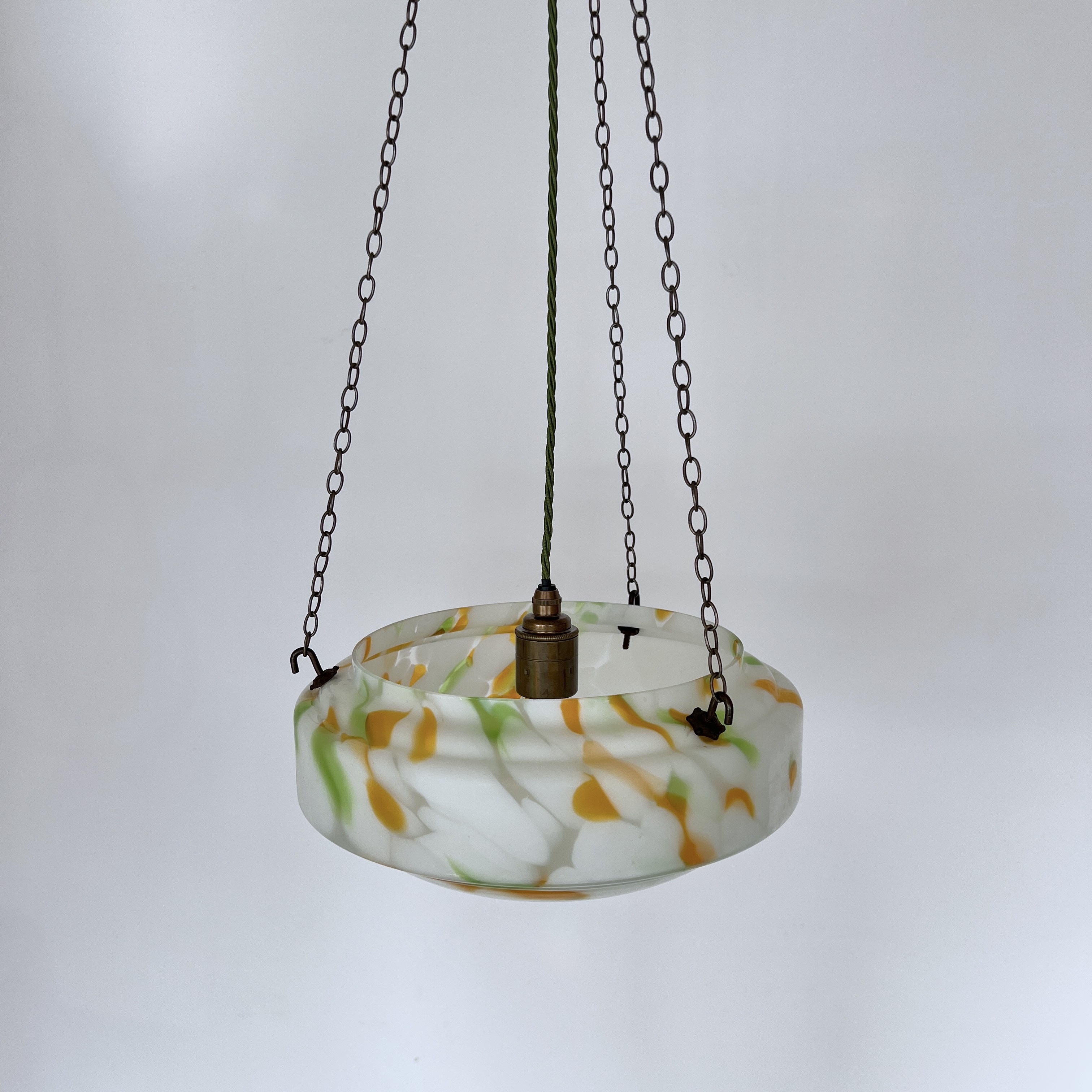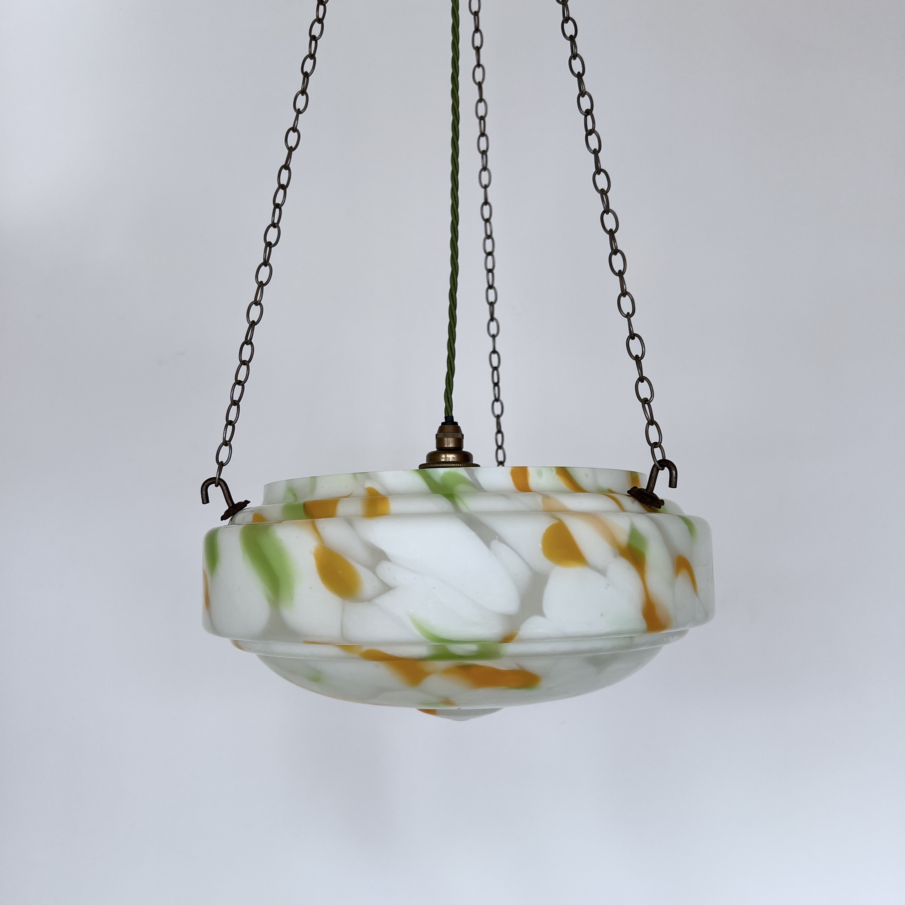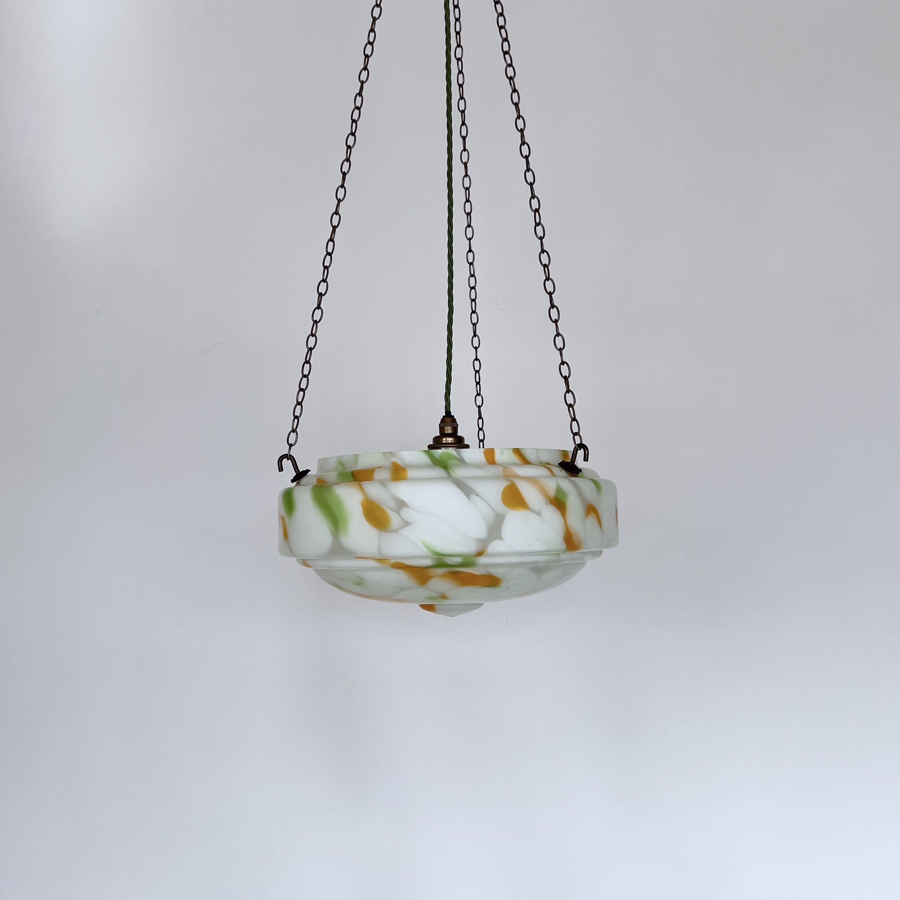 Art Deco matte white glass ‘Fly Catcher’ pendant with orange and green mottled glass details. Rewired with Olive Green braided flex the pendant comes with delicate chain and a three hook ceiling fitting. E27 lamp required. This is not included but can be supplied. Total drop easily adjustable.