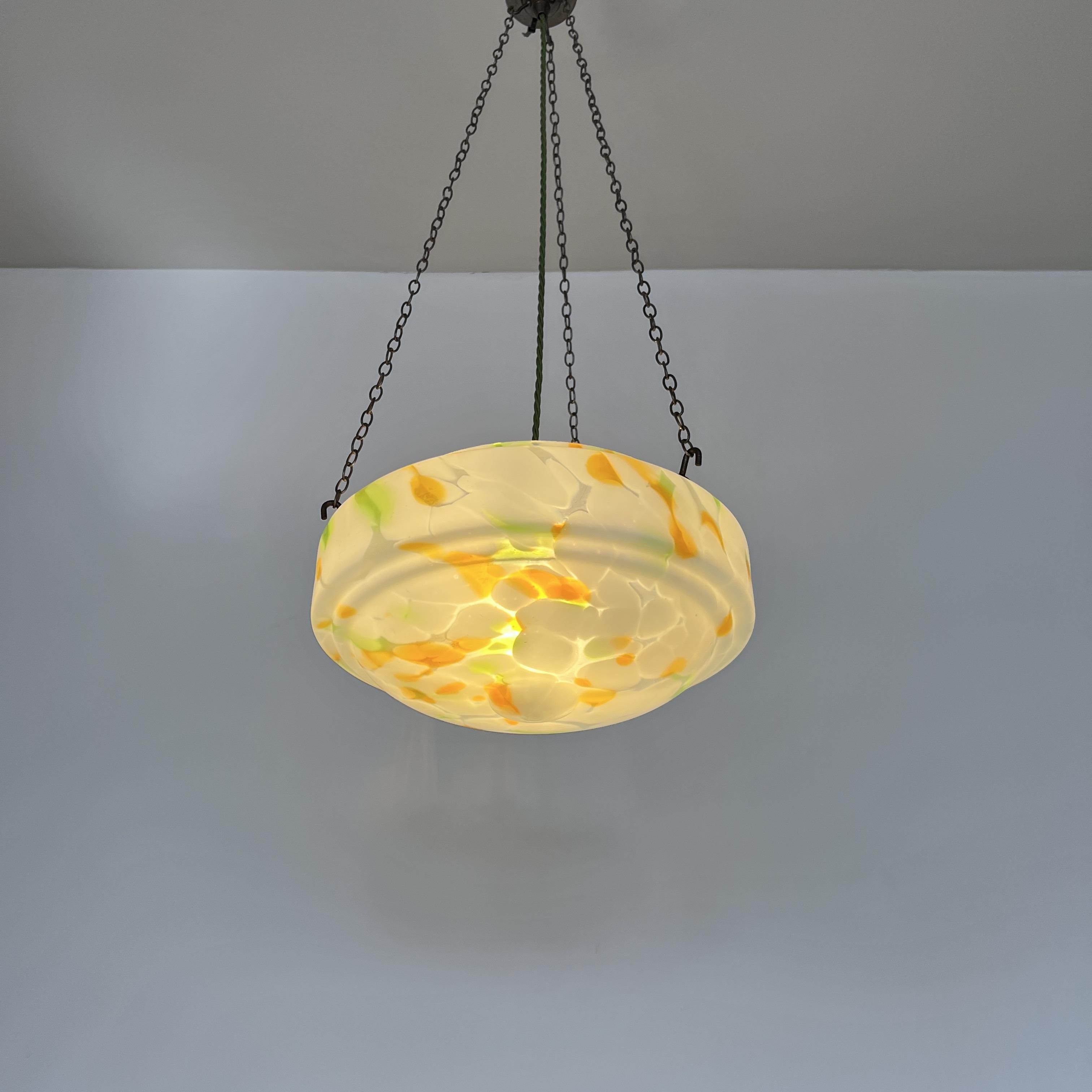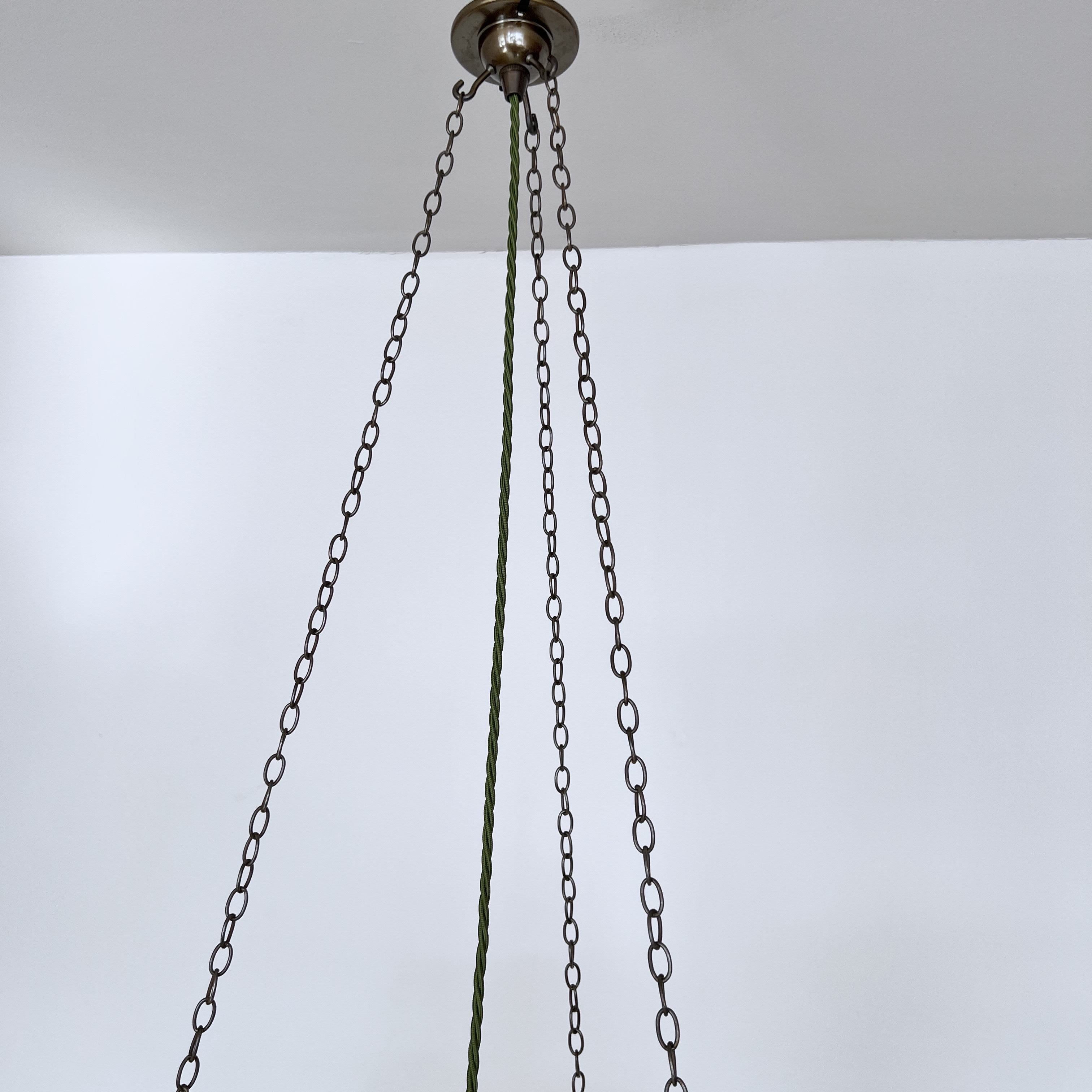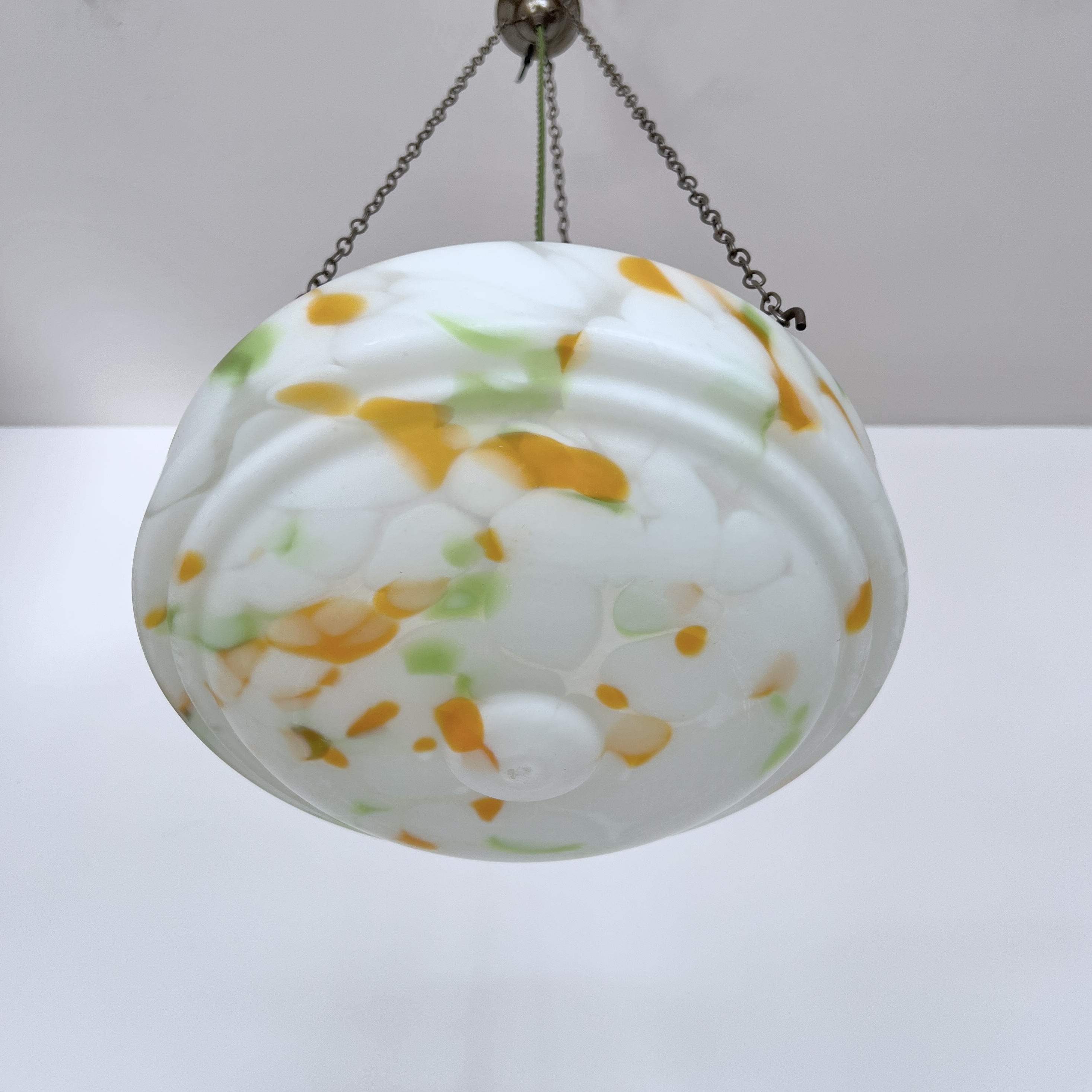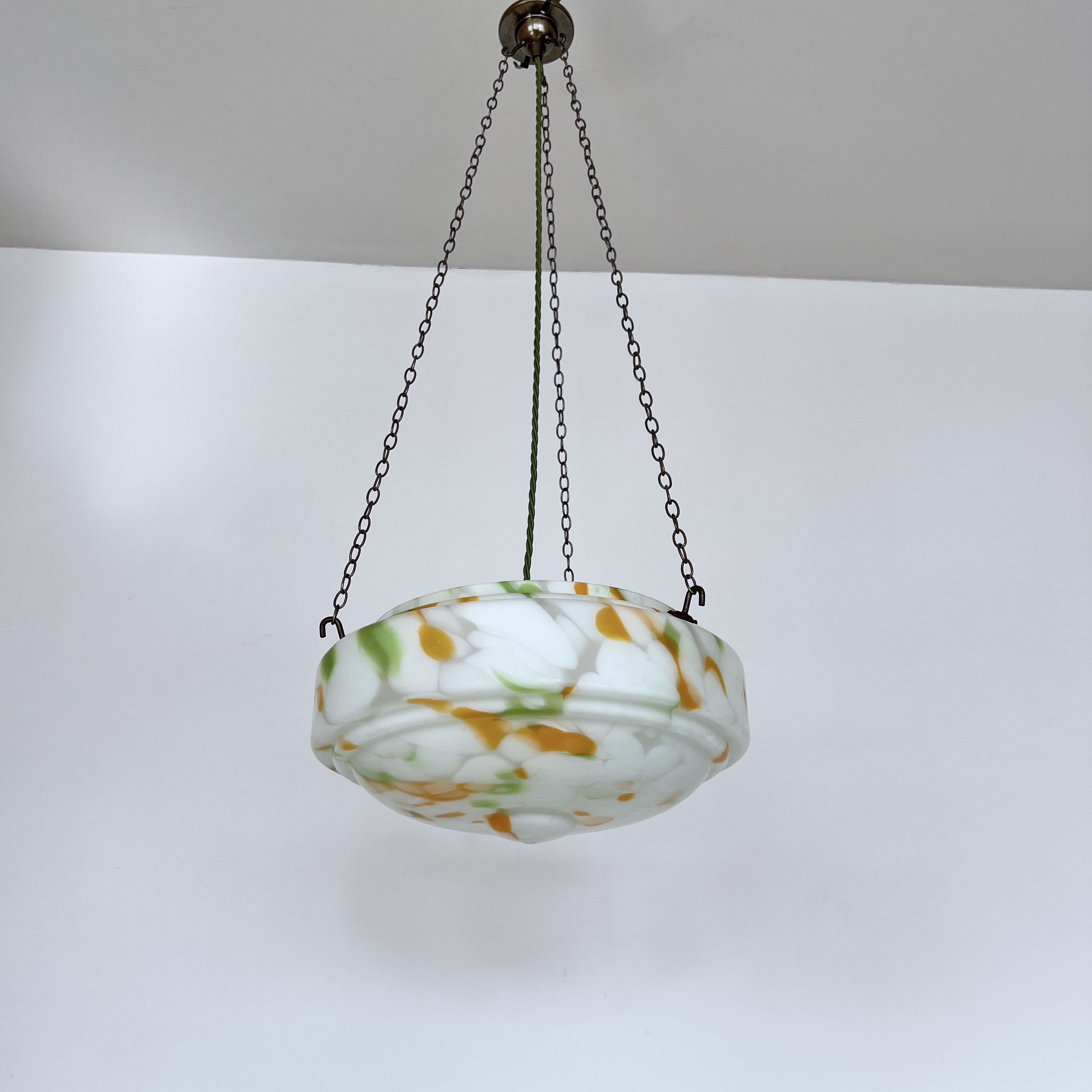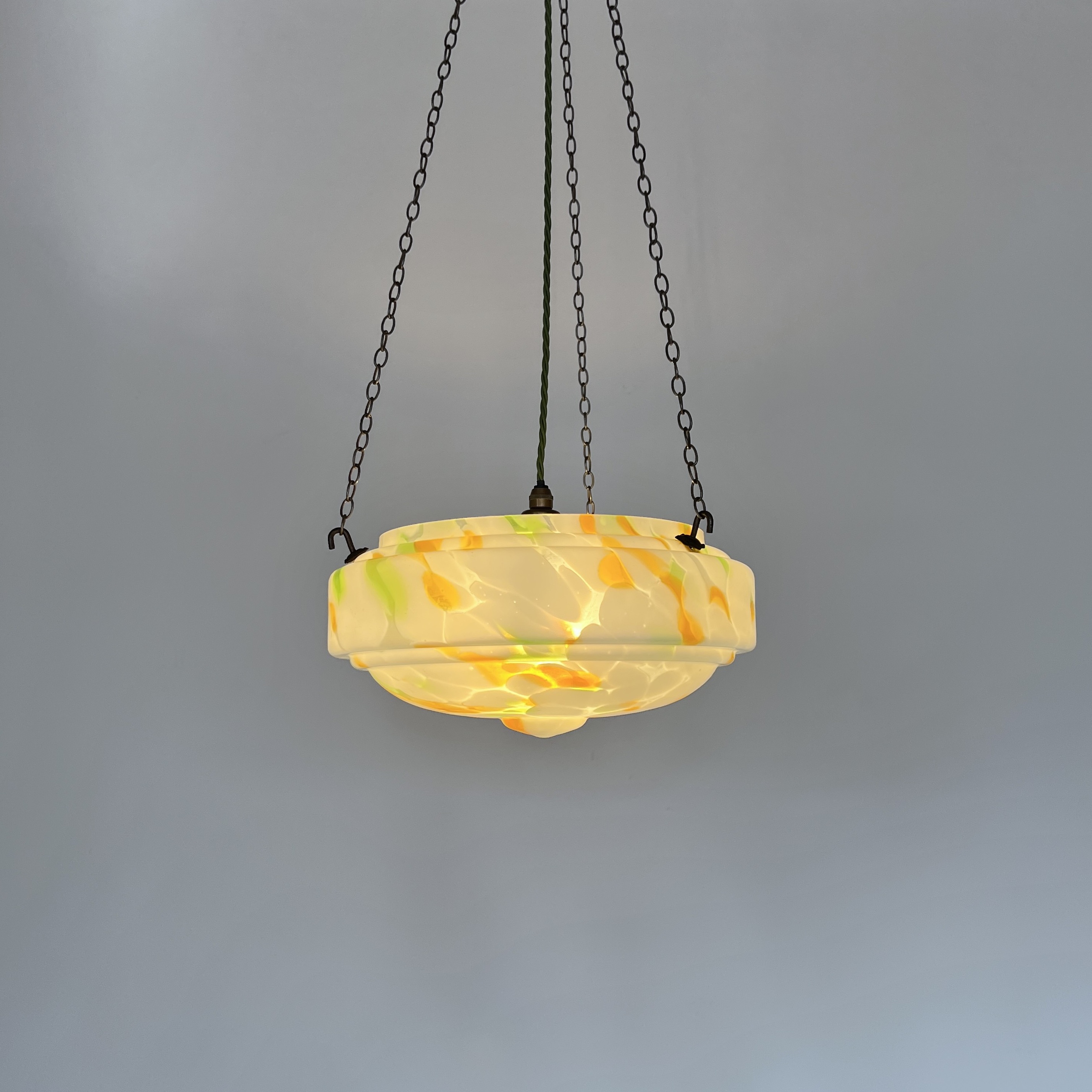 Art Deco matte white glass ‘Fly Catcher’ pendant with orange and green mottled glass details. Rewired with Olive Green braided flex the pendant comes with delicate chain and a three hook ceiling fitting. E27 lamp required. This is not included but can be supplied. Total drop easily adjustable.