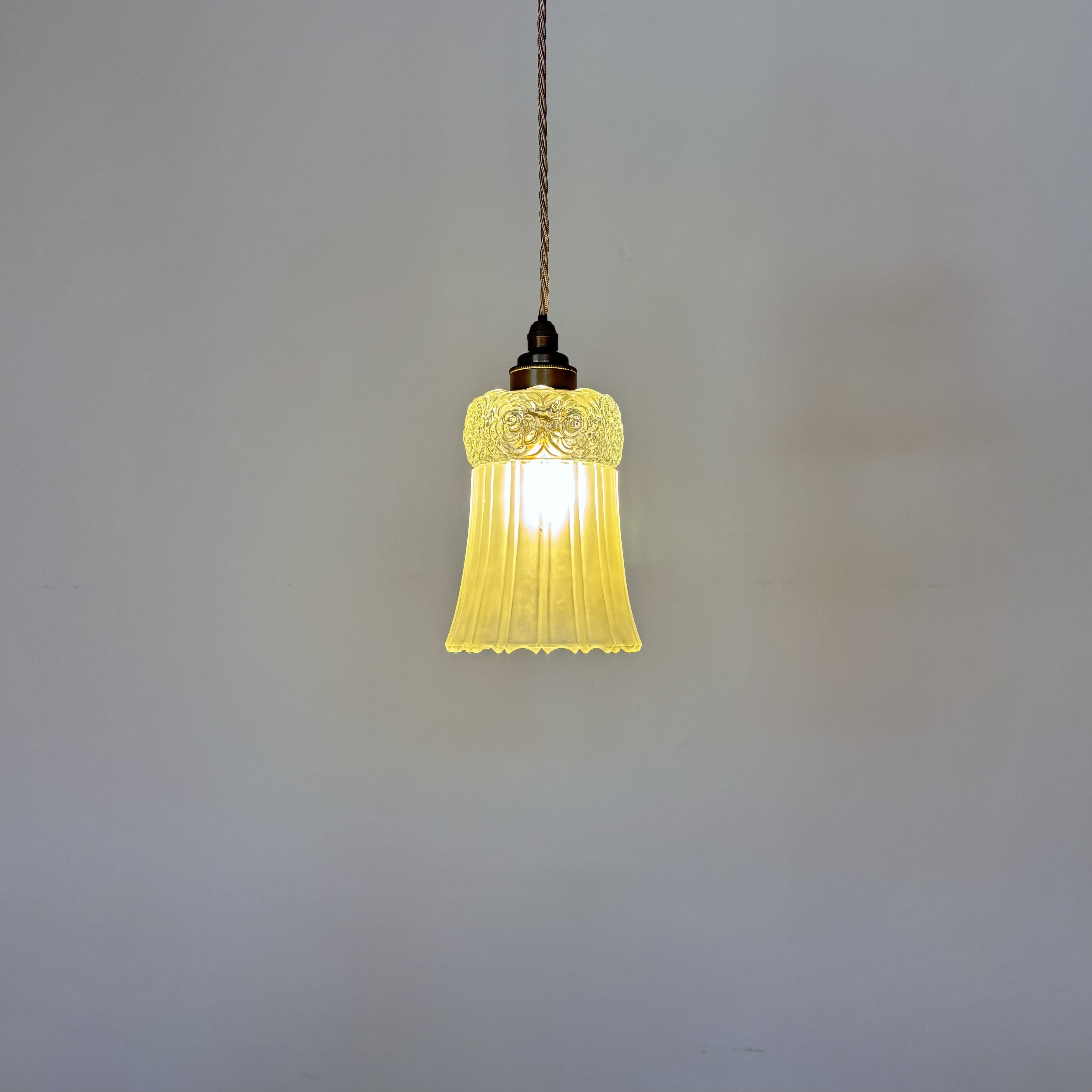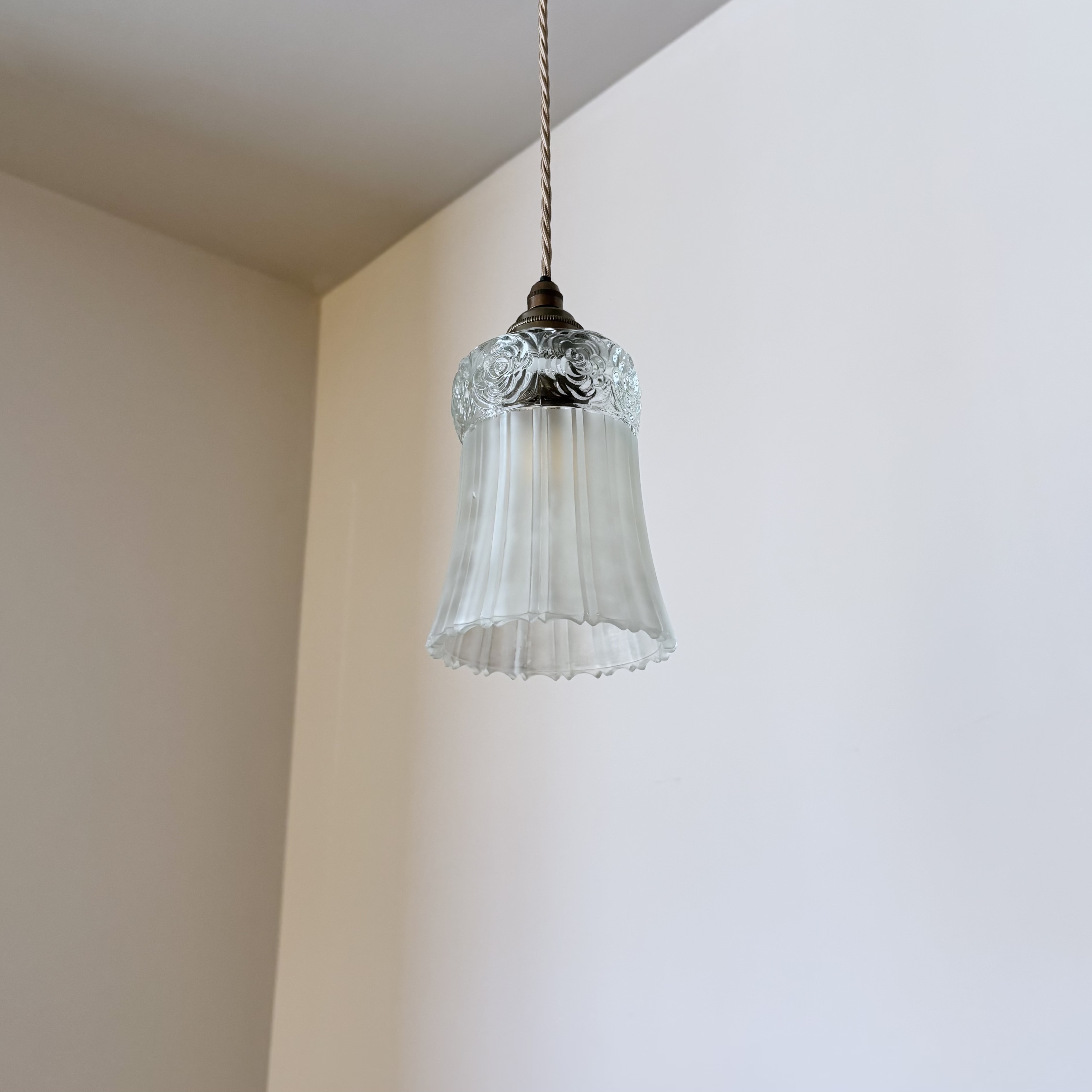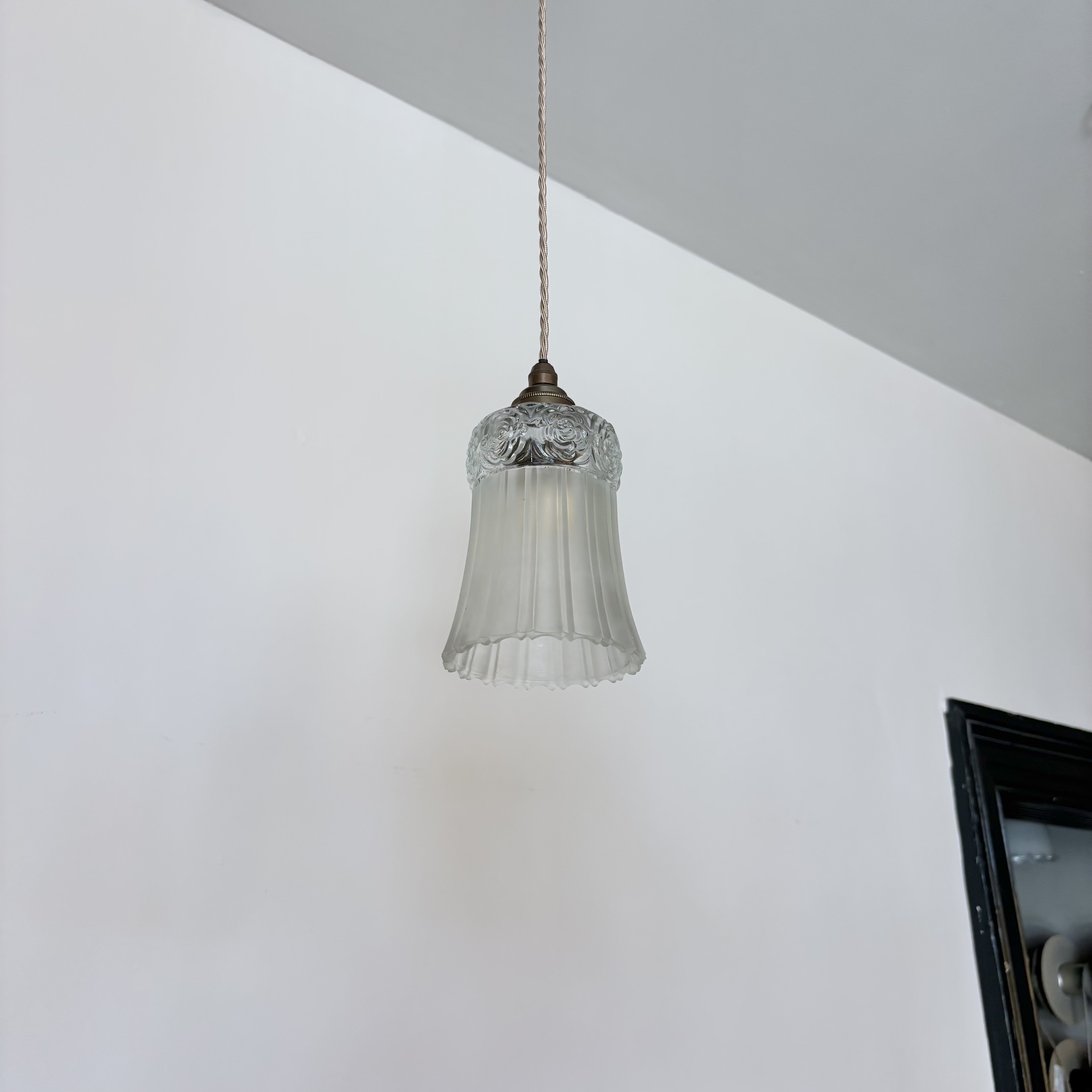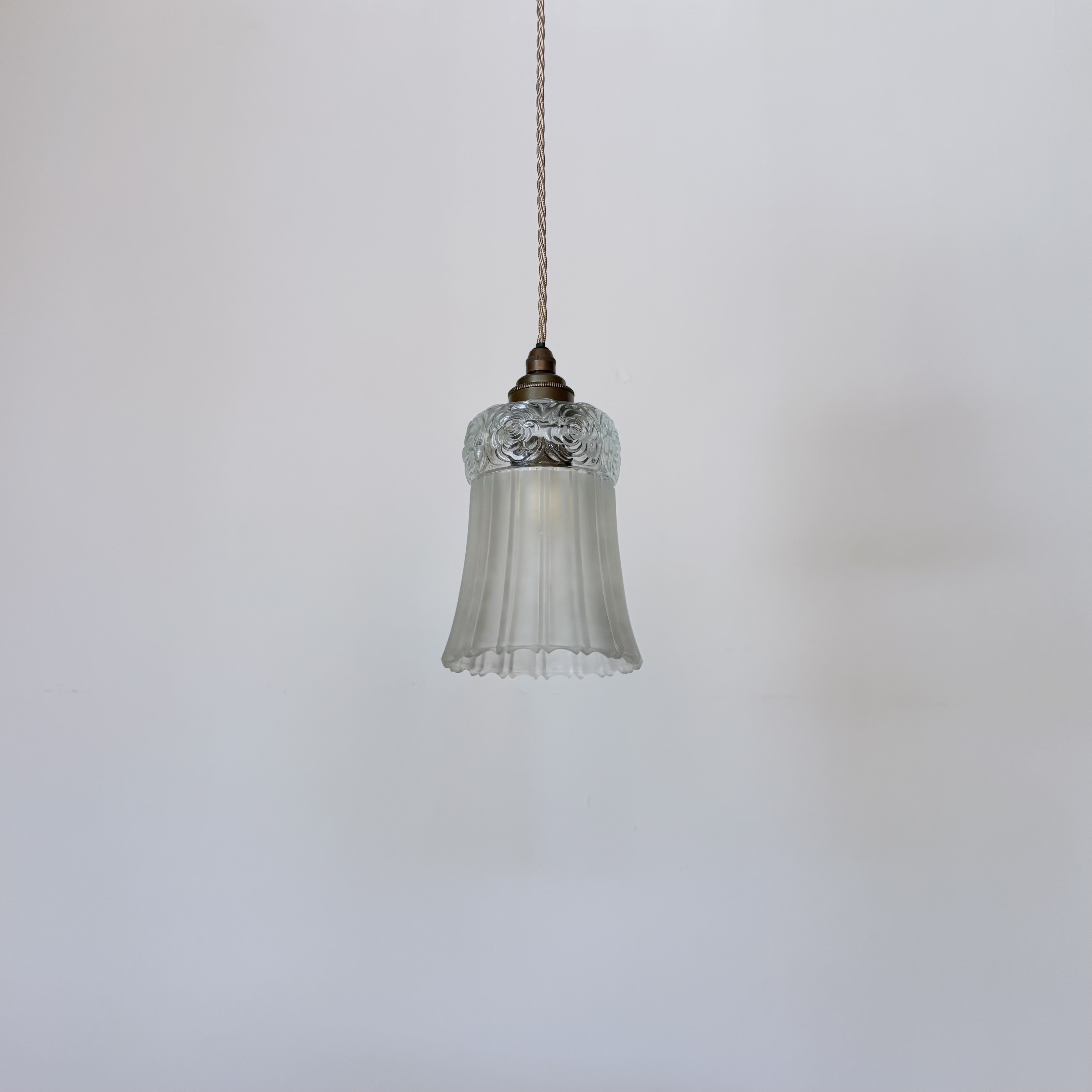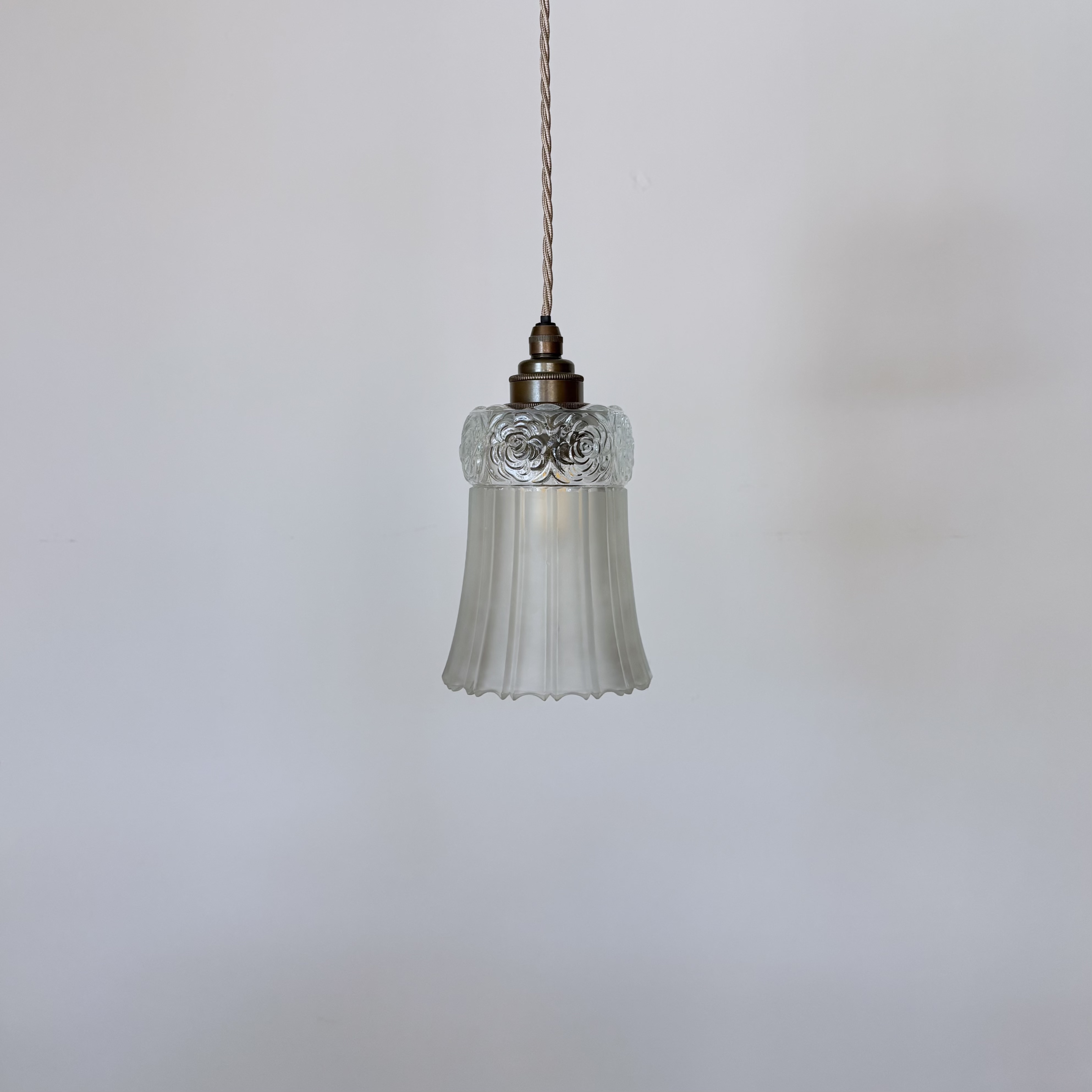 Four frosted fluted shades with clear floral detail. Each rewired with an antique brass finish fitting and pigeon pink braided flex. These shades require one E27 lamp in each. These are not included but they can be supplied. The braided flex can be changed to your preference and a matching ceiling fitting is supplied for each piece. Sold as a set or separately.