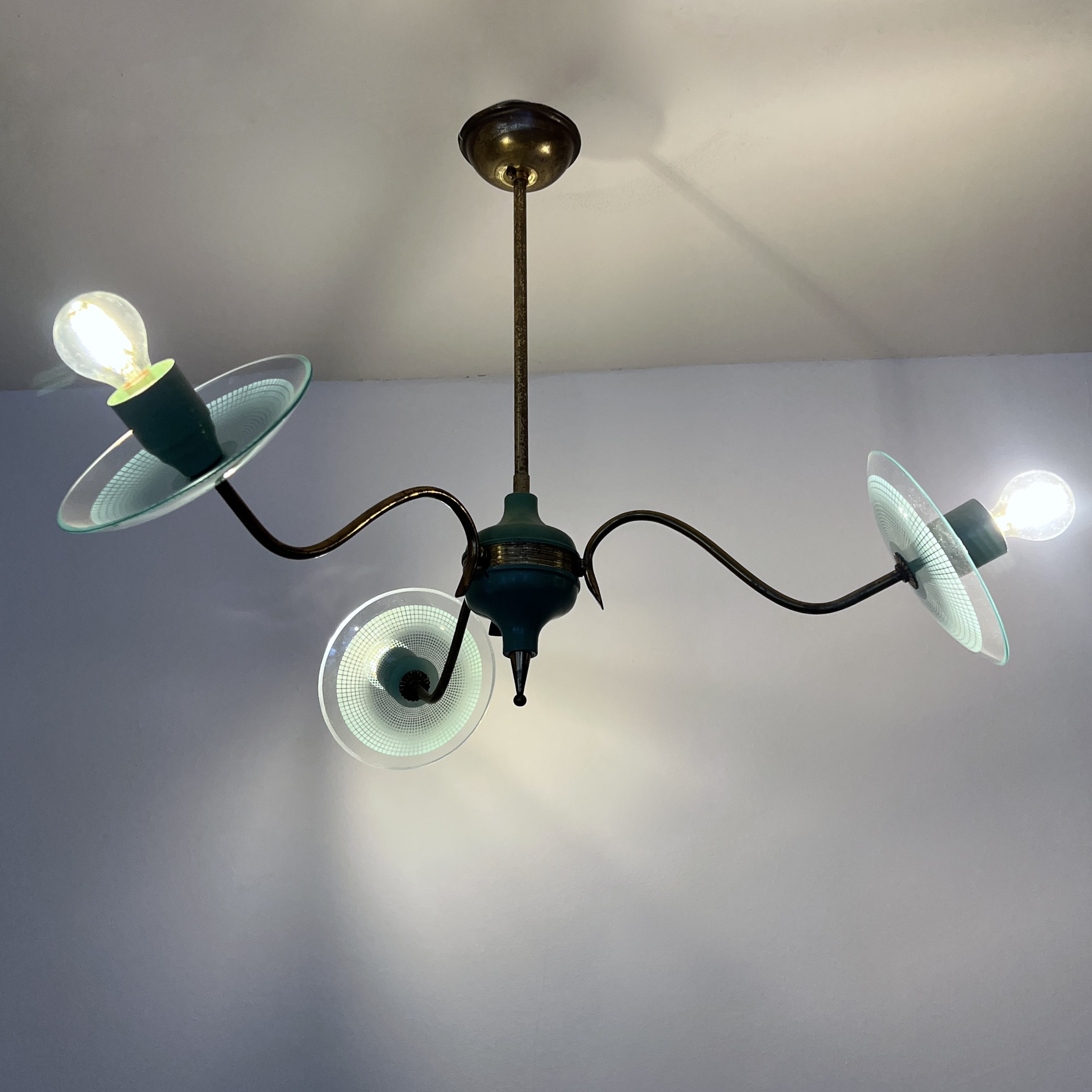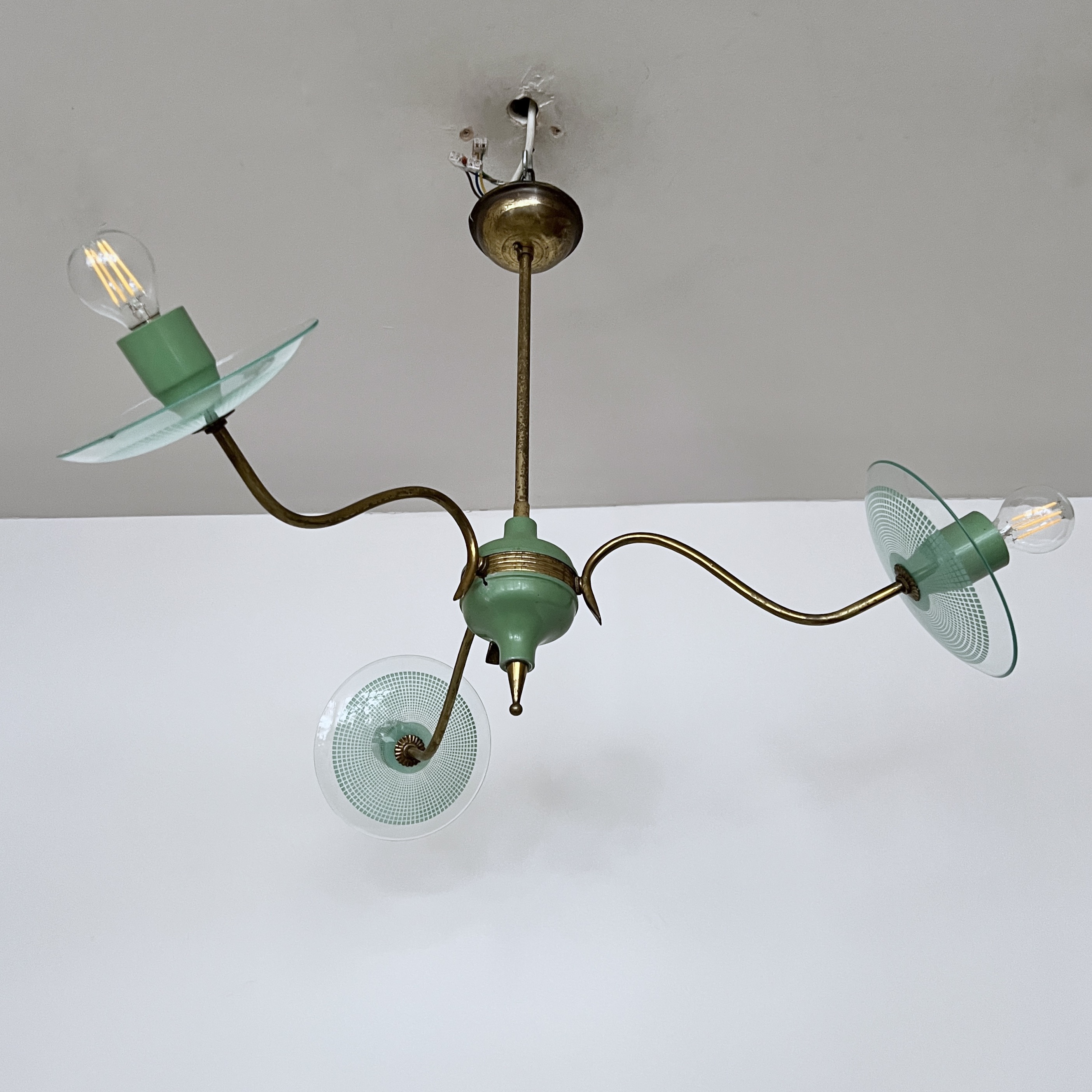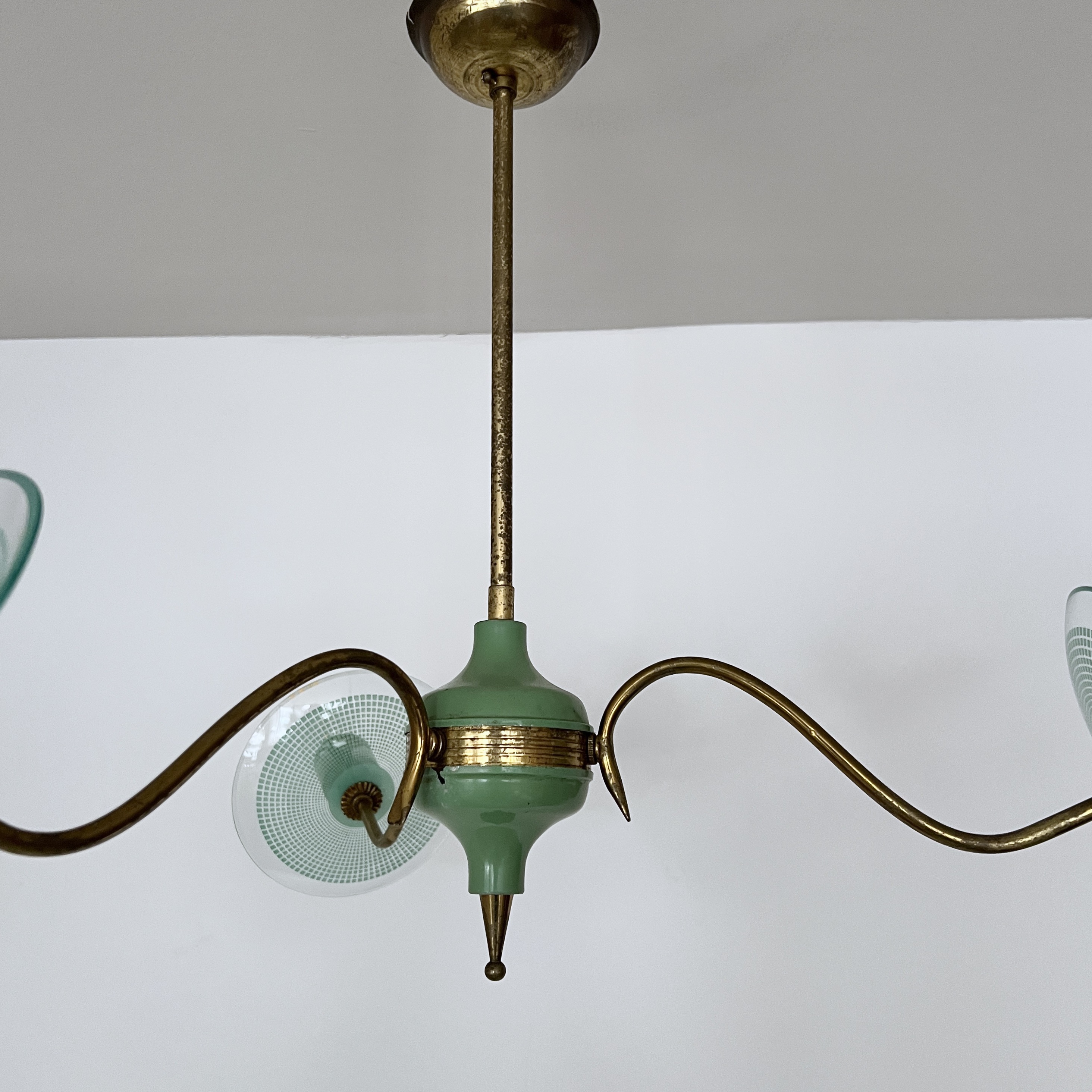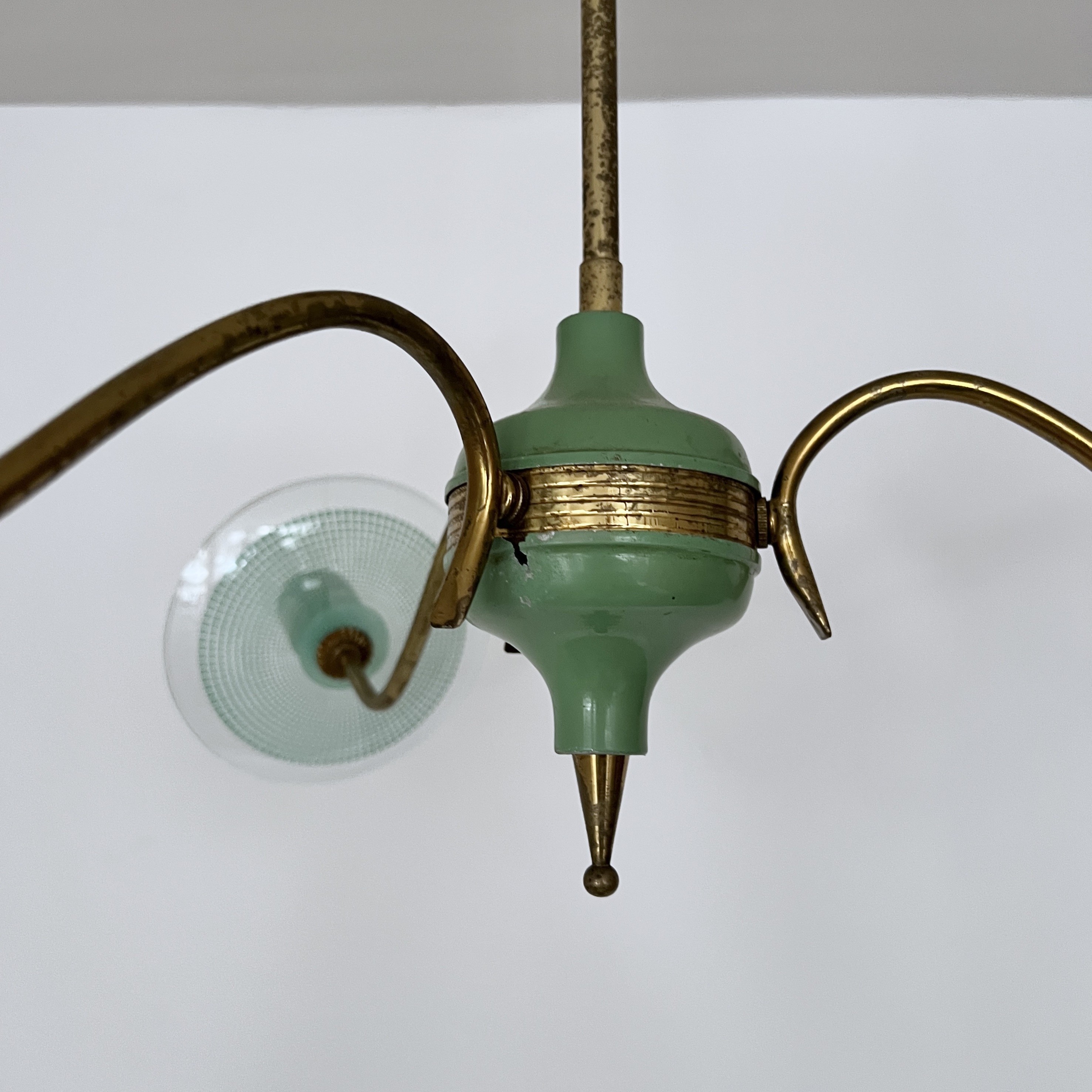 Vintage Italian mid-century modern chandelier from the 1950s, constructed with a brass structure and green painted metal accents. It features curved brass arms extending from a central core. Each light source is complemented by a clear glass disc with a textured pattern. The design is characteristic of Italian lighting manufacturers from that era, such as Stilnovo.
