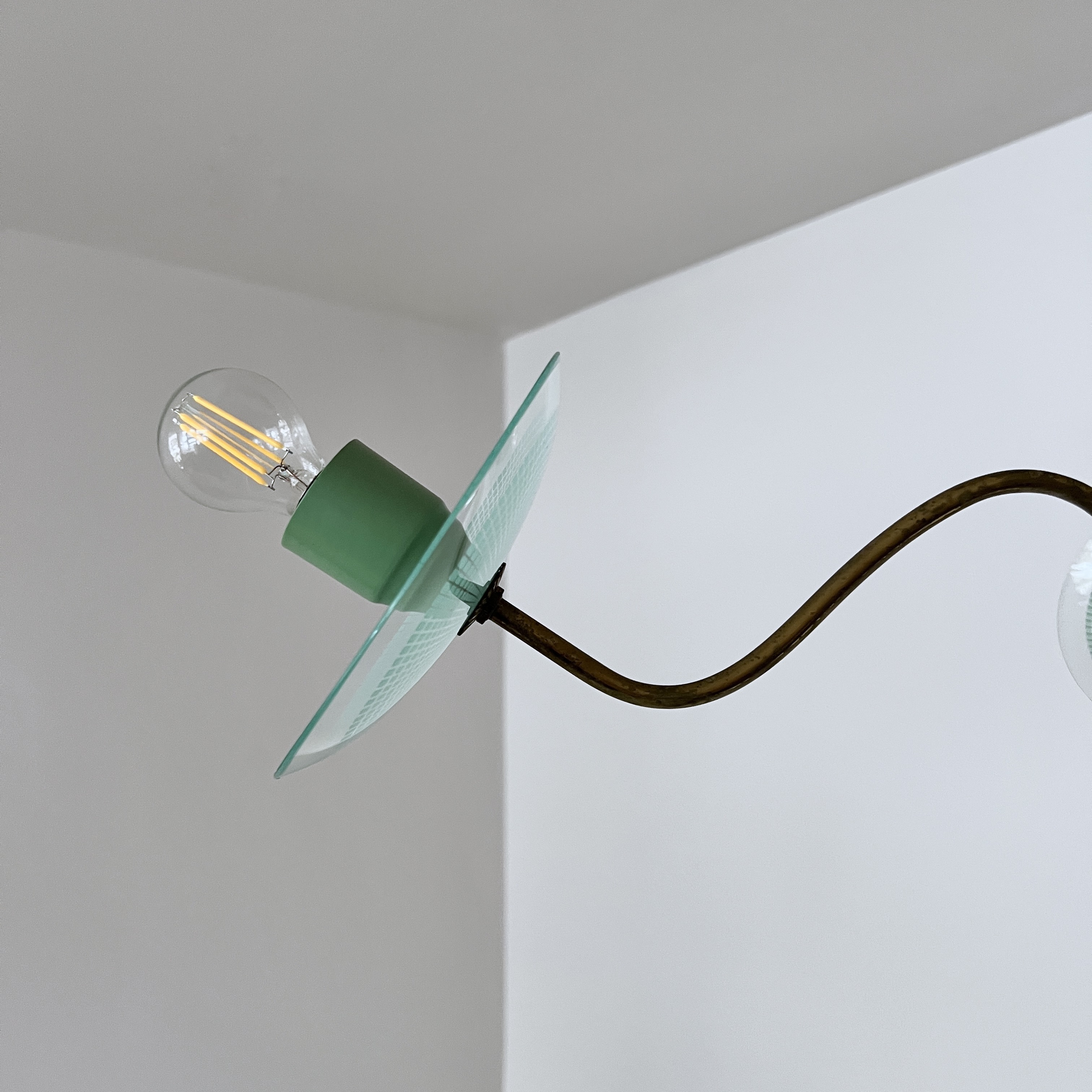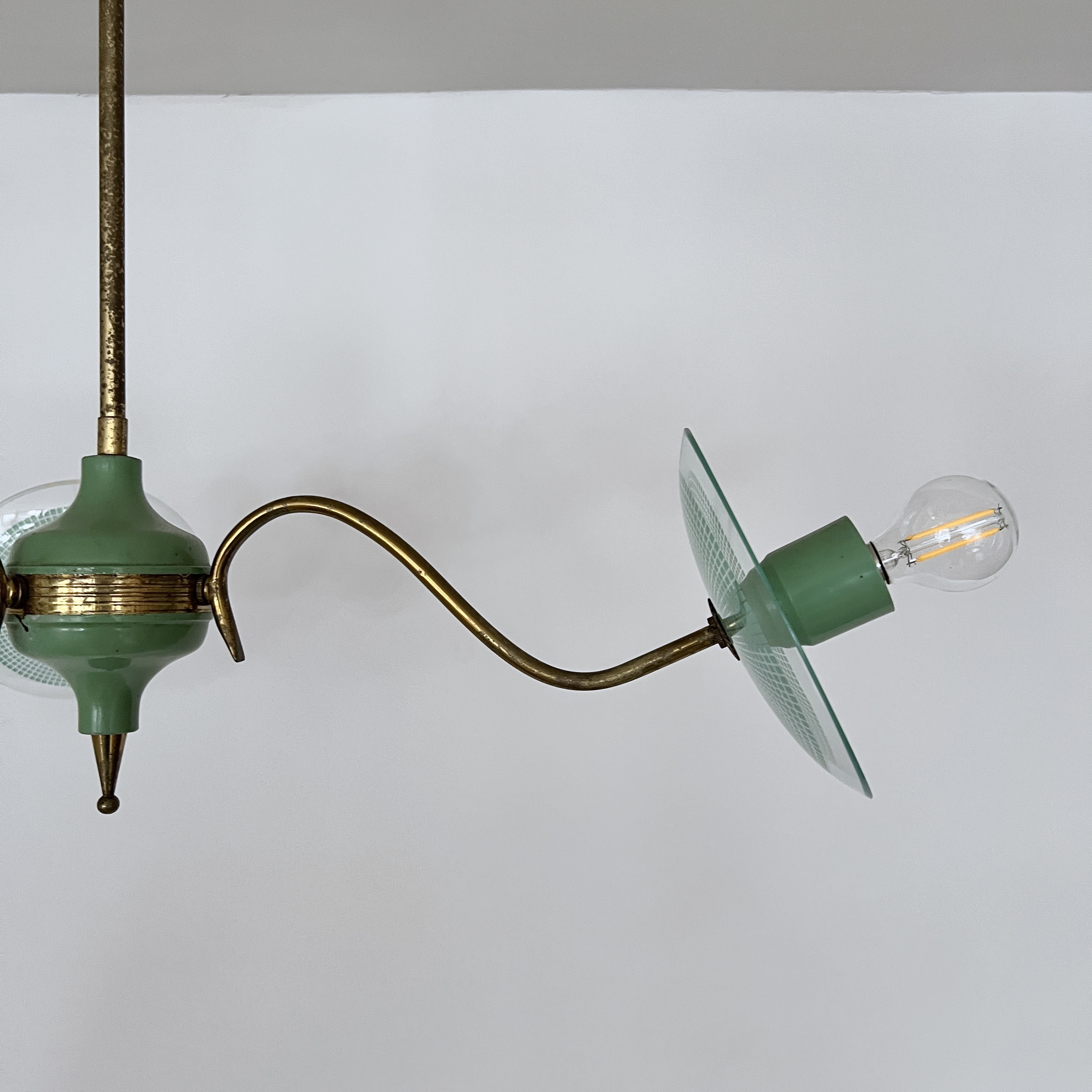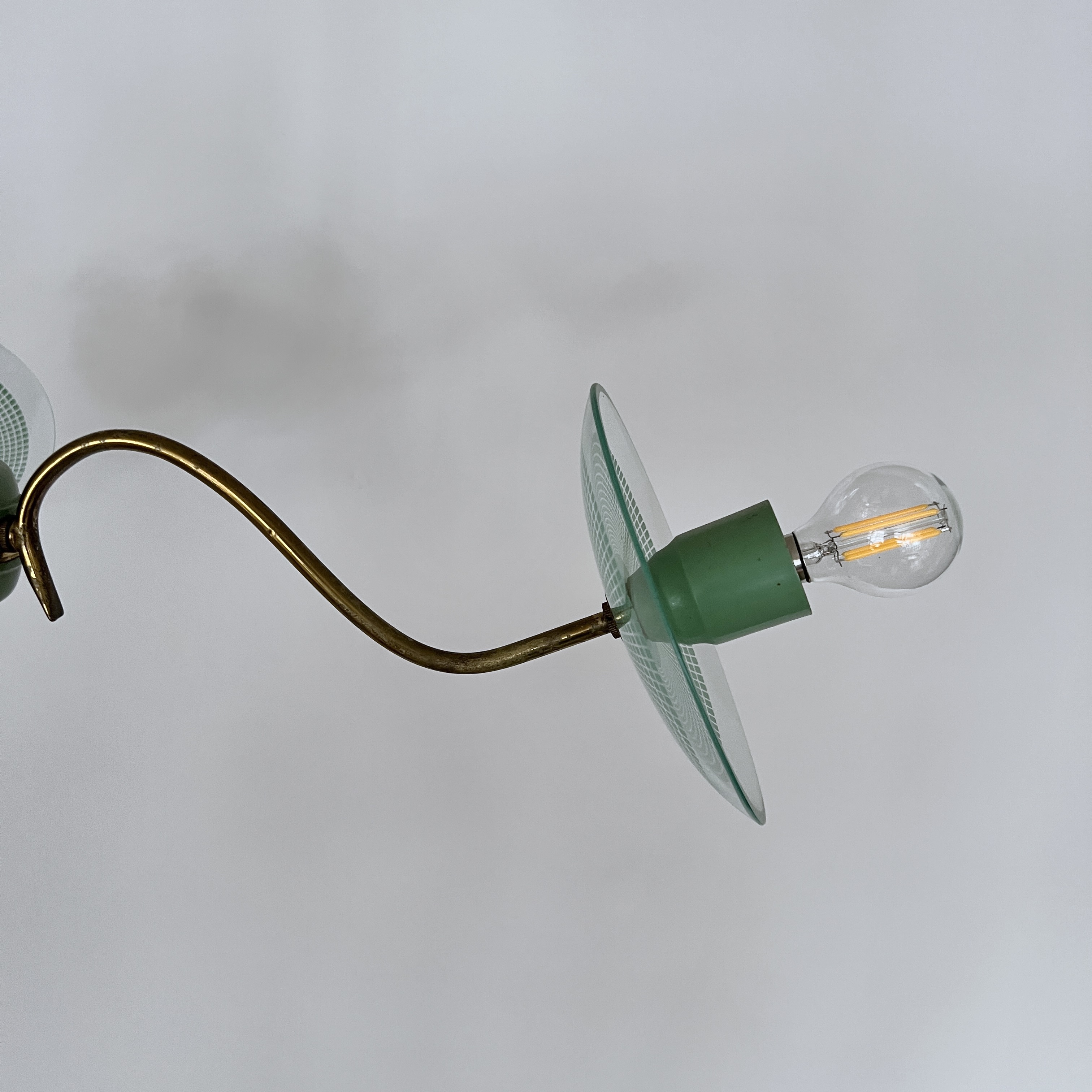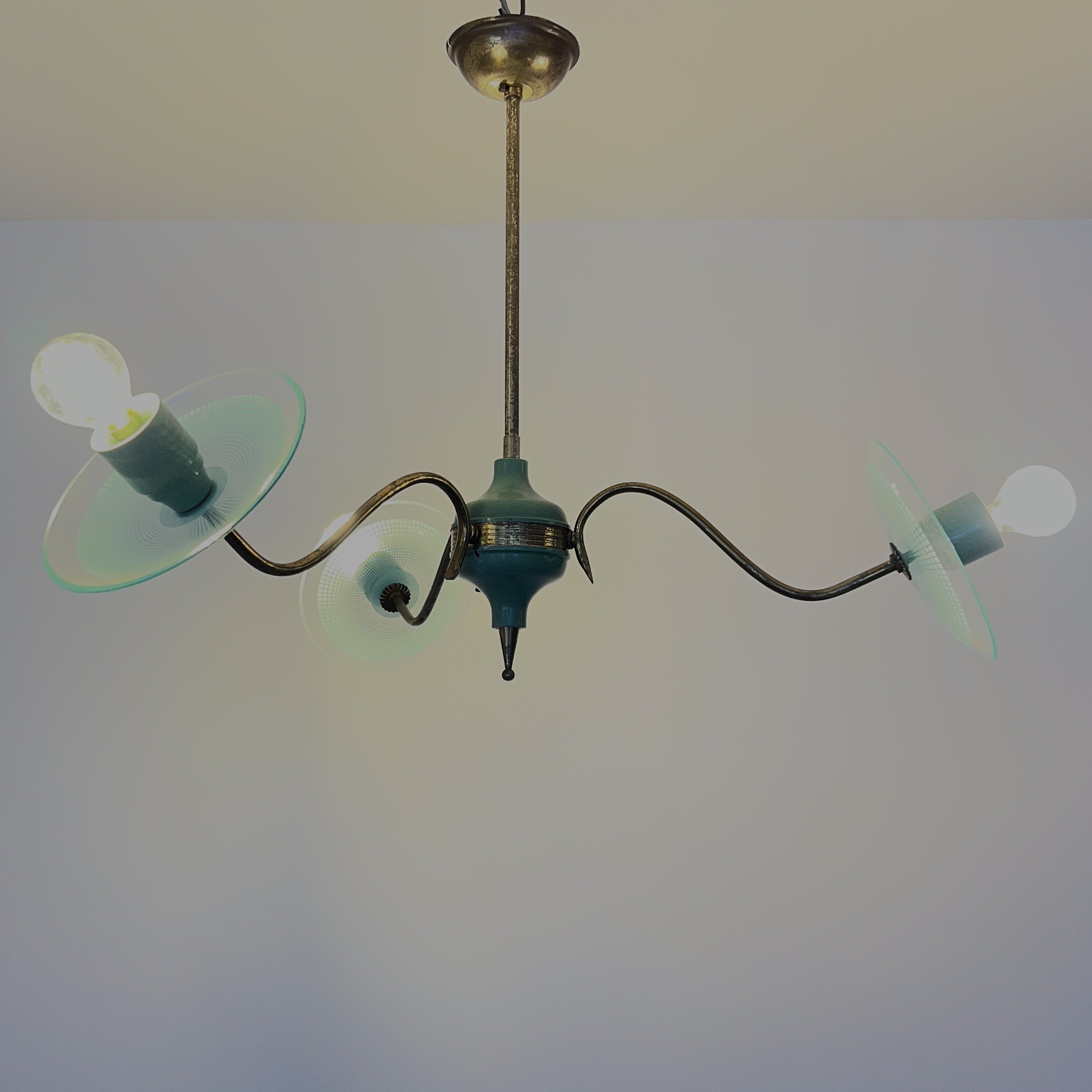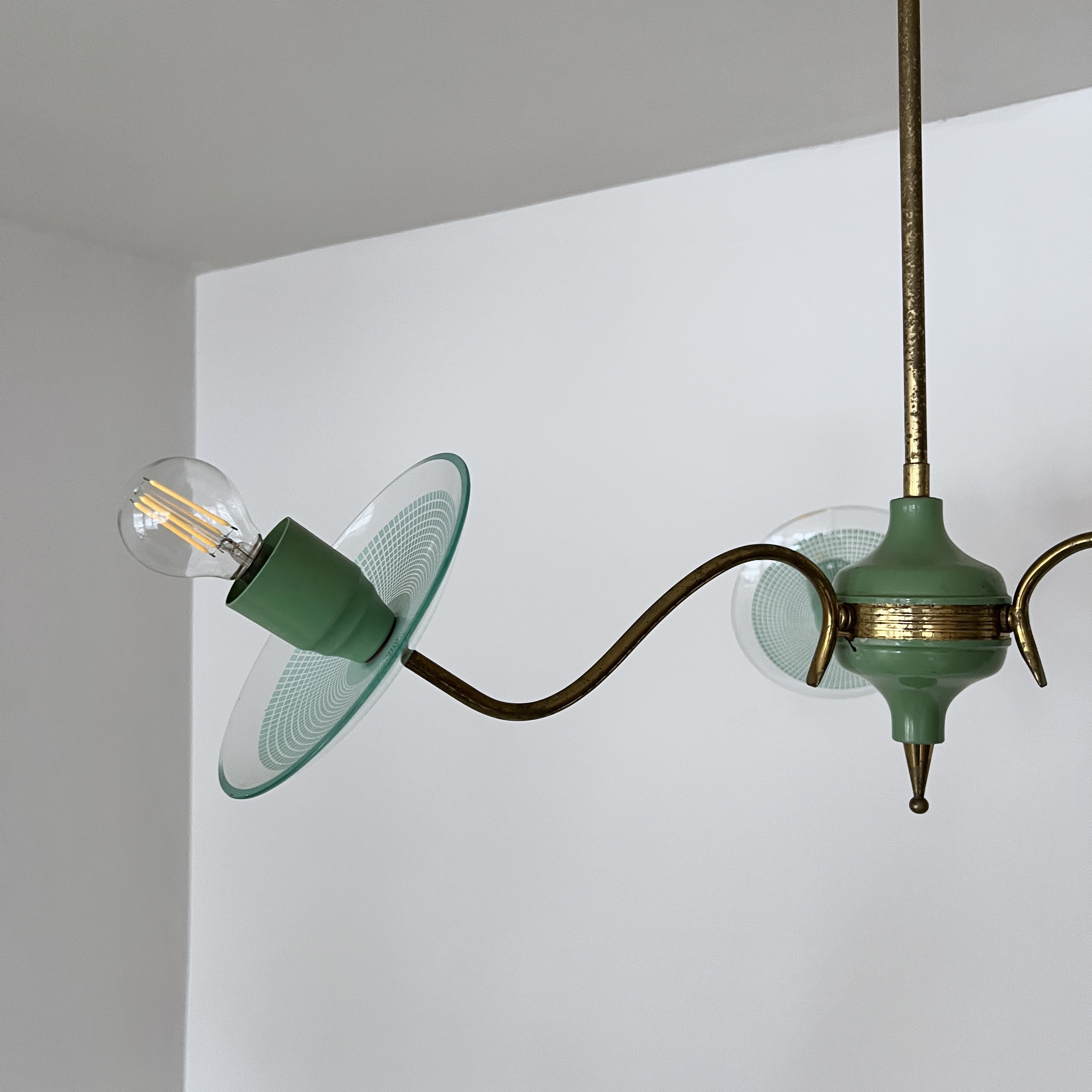 Vintage Italian mid-century modern chandelier from the 1950s, constructed with a brass structure and green painted metal accents. It features curved brass arms extending from a central core. Each light source is complemented by a clear glass disc with a textured pattern. The design is characteristic of Italian lighting manufacturers from that era, such as Stilnovo.