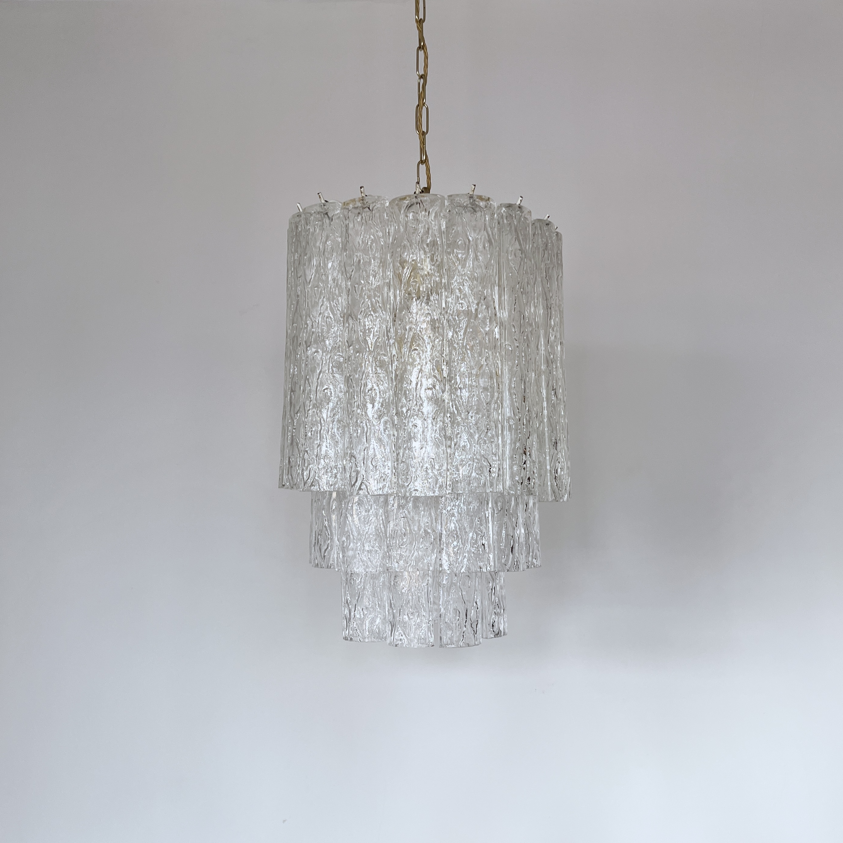 Murano clear glass chandelier made in Italy during the 1960s by the renowned designer Toni Zuccheri for Venini & Co. In very good vintage condition, the glass perfect with the frame showing some minor signs of wear that add character to its history. The piece comprises 36 individual glass tubular shades and requires six SES lamps. These are not included, but can be supplied.