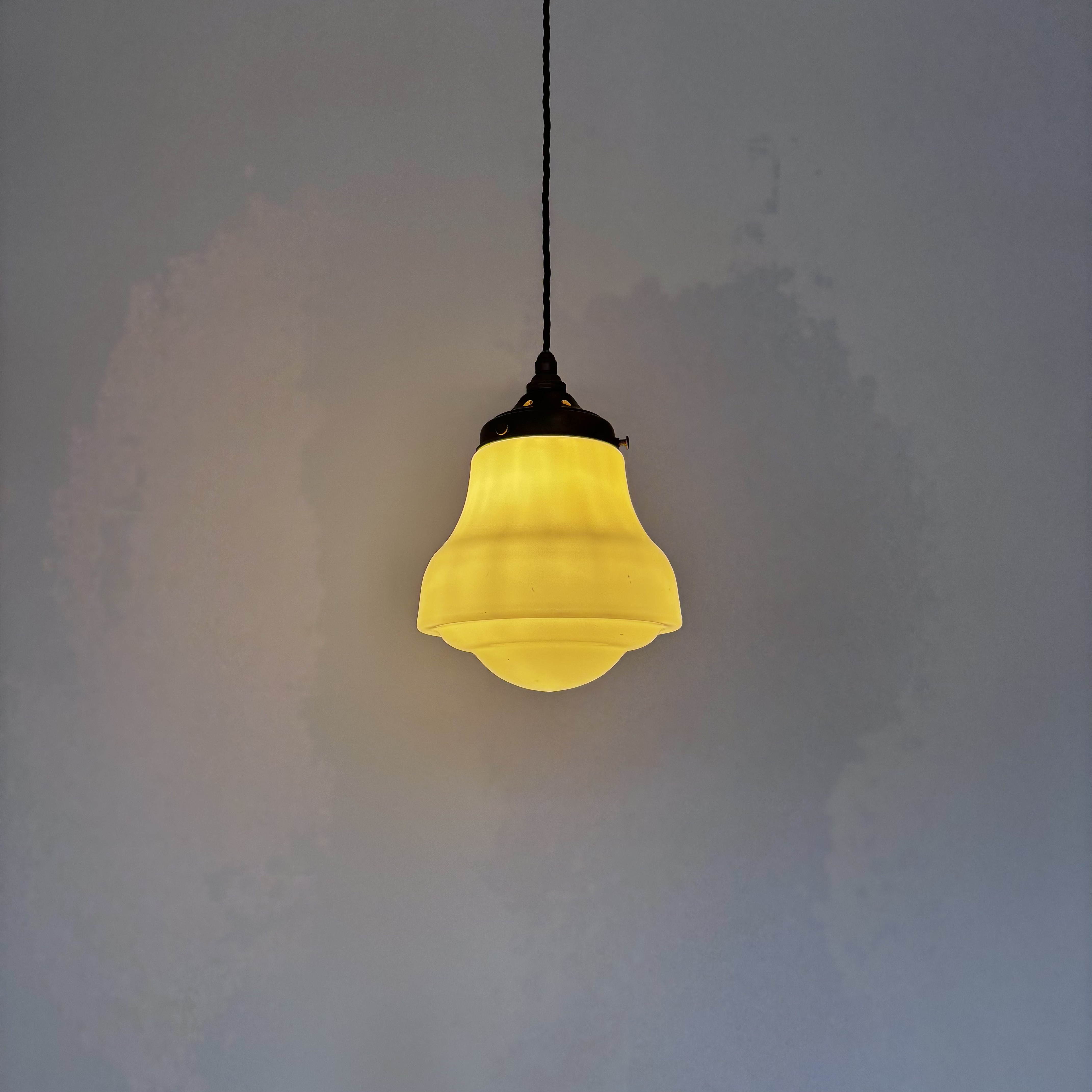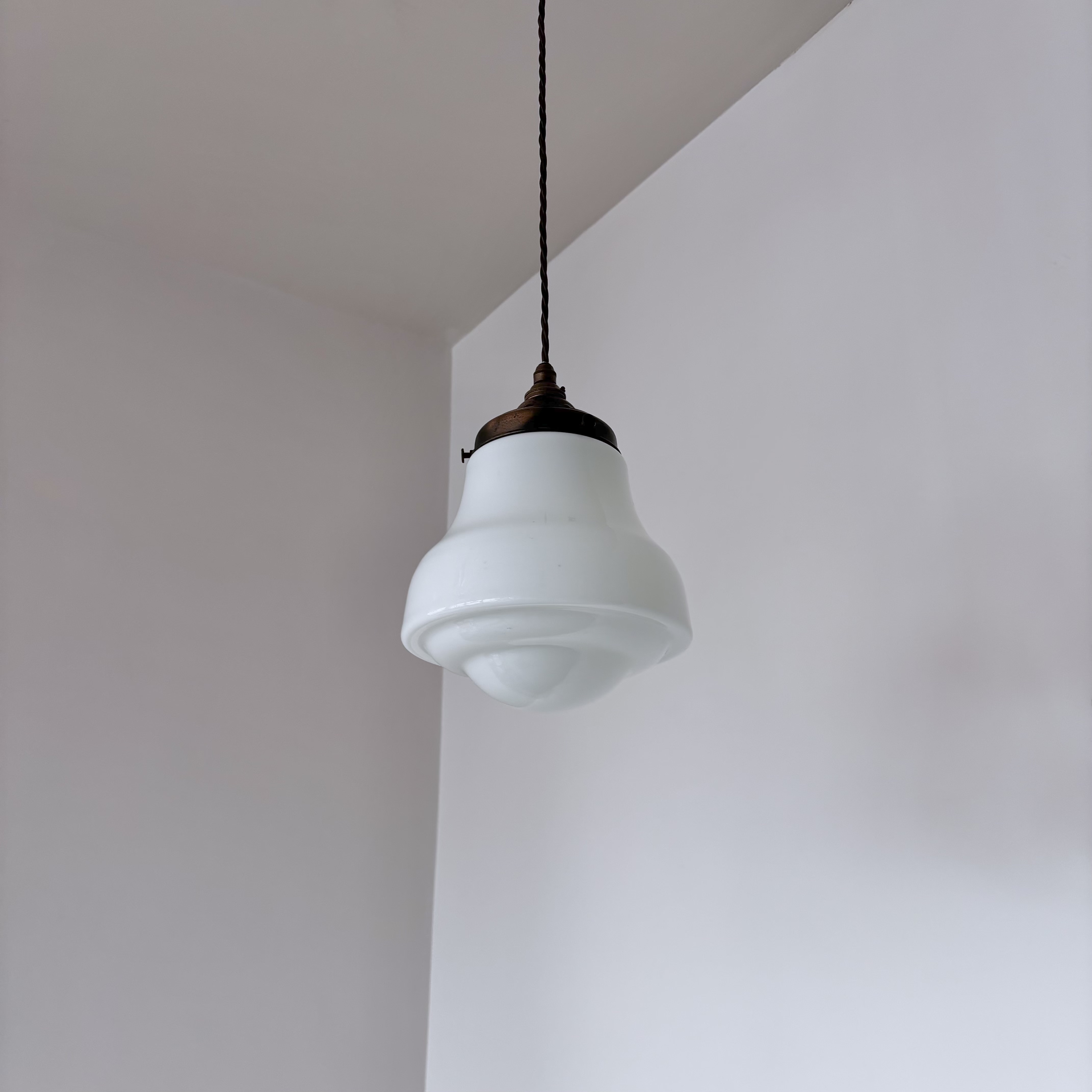 Moulded enclosed milk glass shade. Rewired with an antique brass finish fitting and Lead blue braided flex. This shade requires one B22 lamp this is not included but can be supplied. The coloured flex can be changed to your preference and a matching ceiling fitting is supplied.
