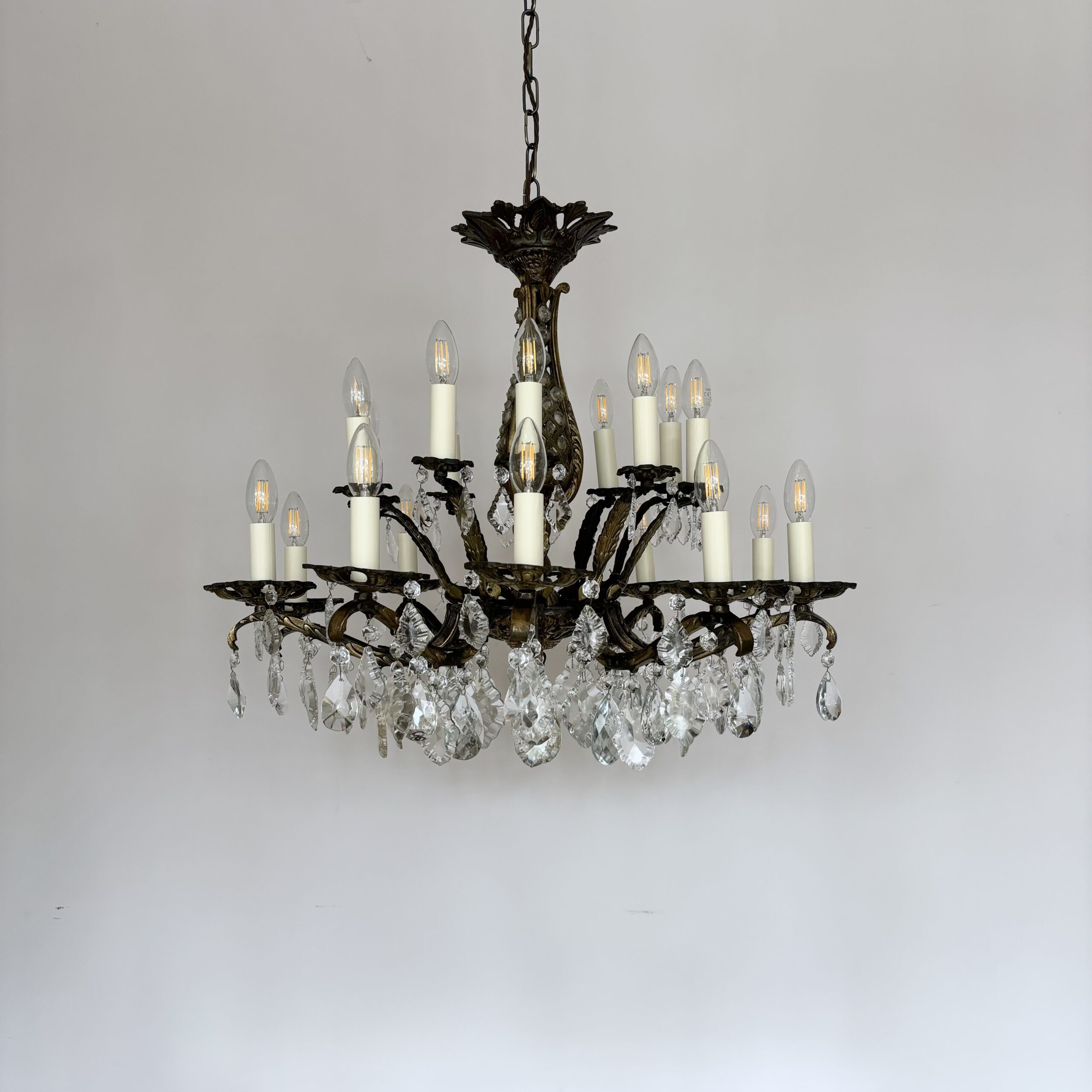 This chandelier originates from early 20th century France. Dressed in cut glass pear drops and mixed flat leaf drops it is an ornate centre piece. The chandelier frame is heavily oxidised and holds twenty lamps in total. The ornate top crowns are in the shape of leaves. The chandelier comes supplied with braided flex, chain, a ceiling rose and a chandelier hook plate. Chandelier requires SES lamps, these are not included.