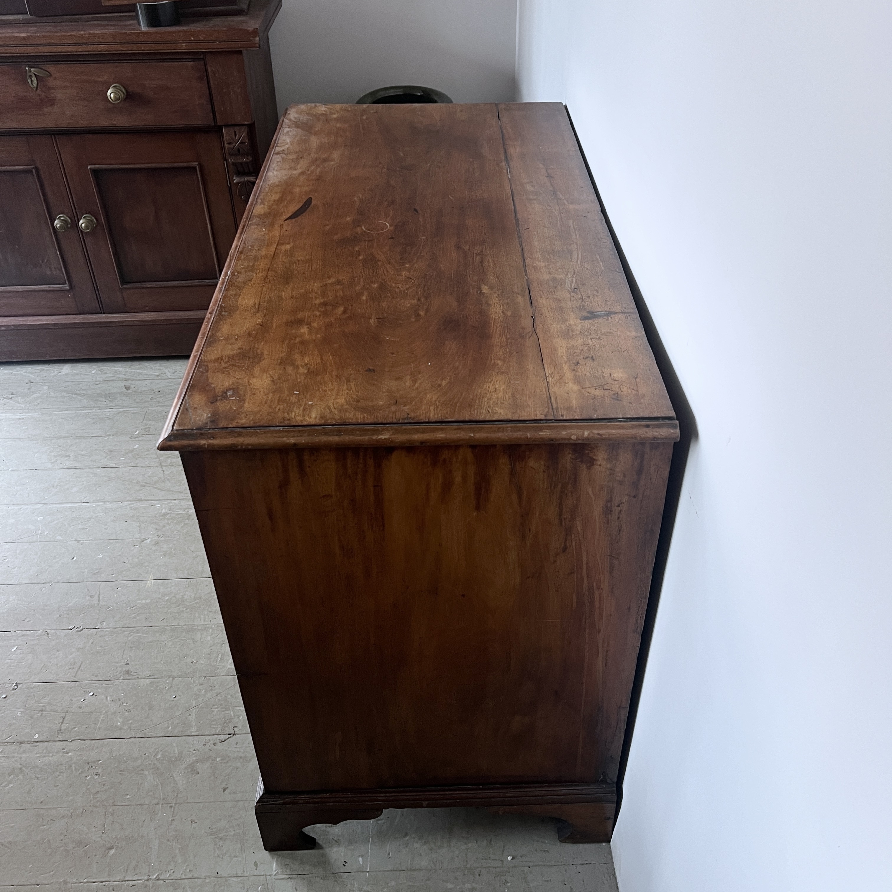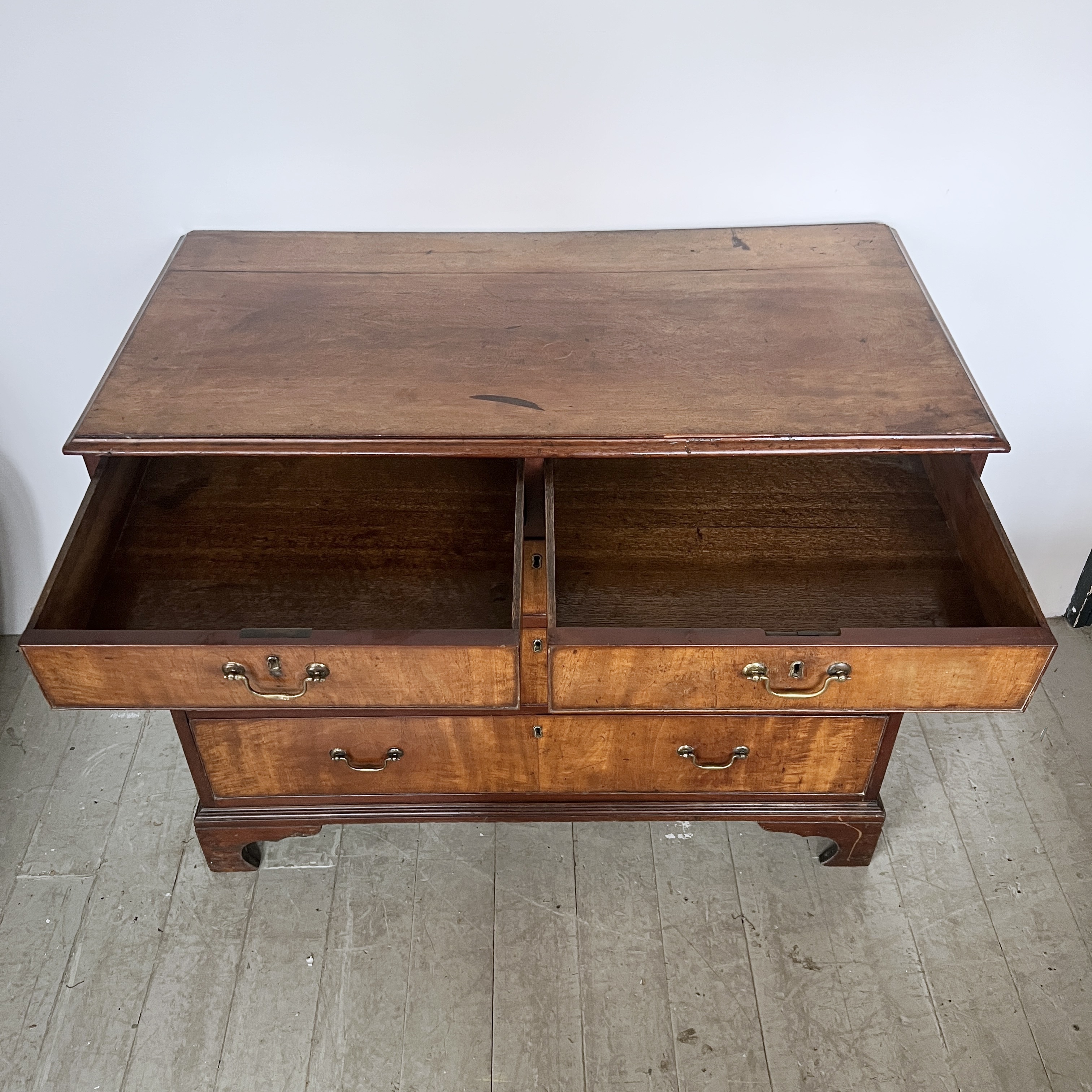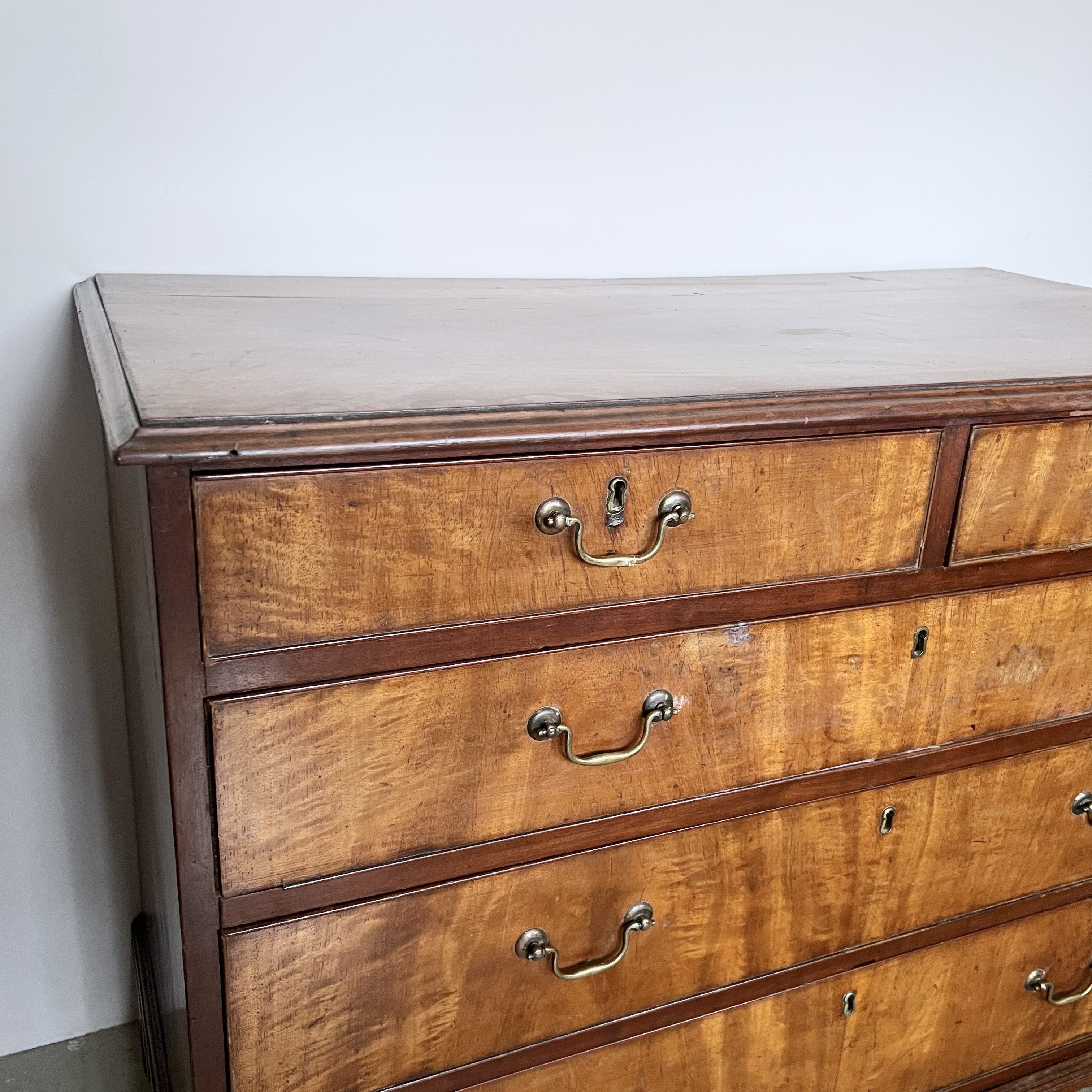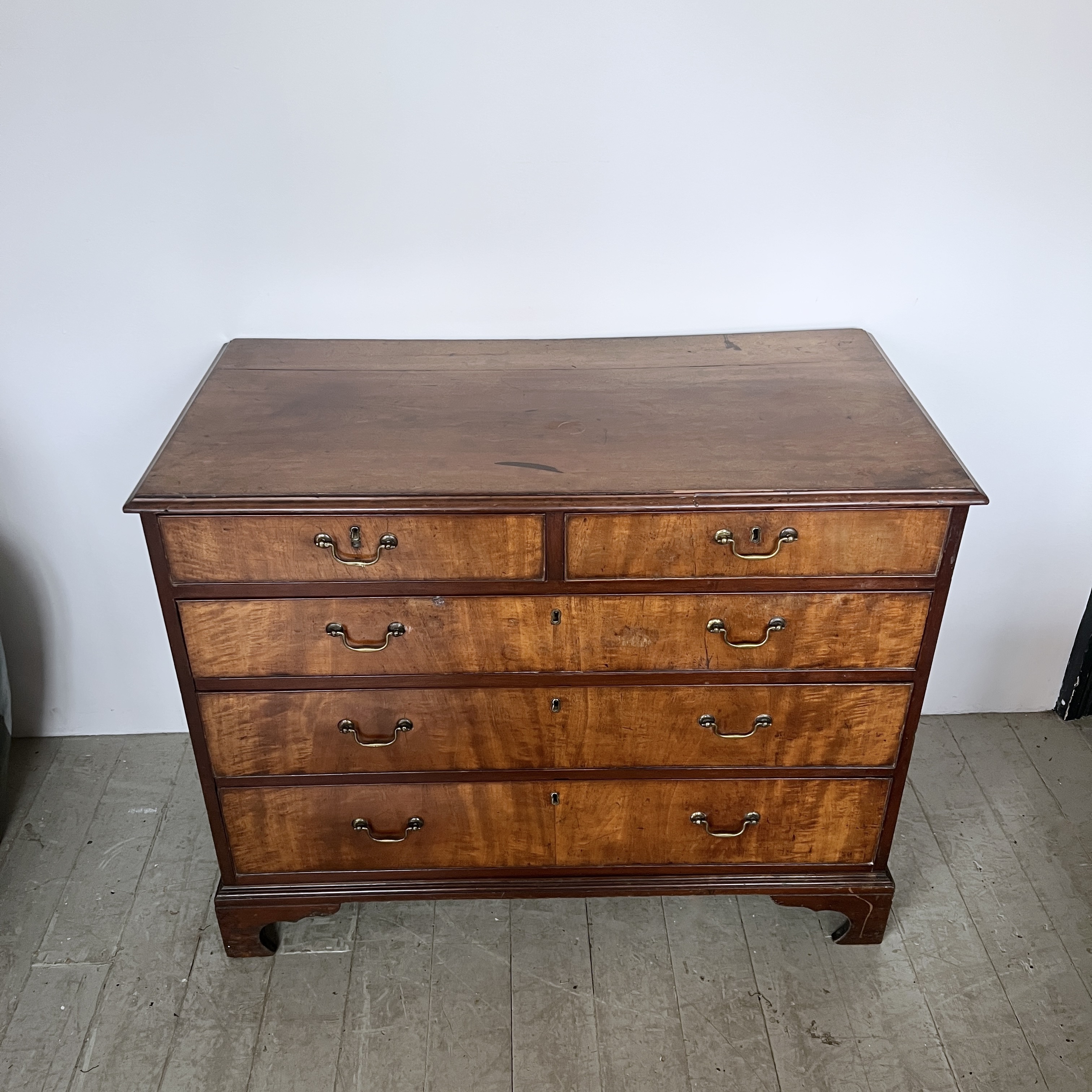 Solid mahogany chest of drawers with original brass handle pulls. Two drawers over three. Top left corner has been repaired.
