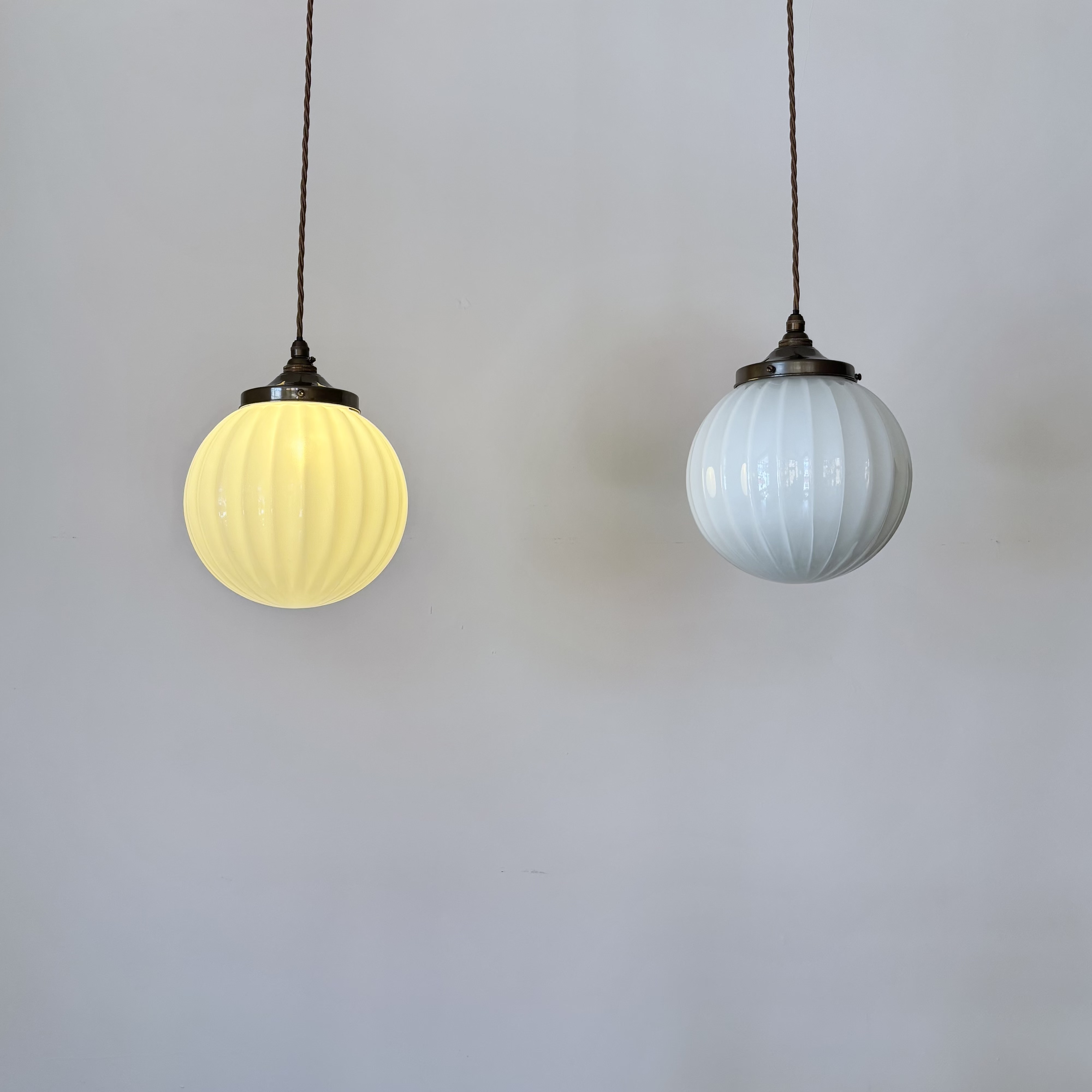 Moulded white globe shade pendant. Rewired with an antique brass finish fitting and light brown braided flex. This shade requires one B22 lamp this is not included but can be supplied. The coloured flex can be changed to your preference and a matching ceiling fitting is supplied.