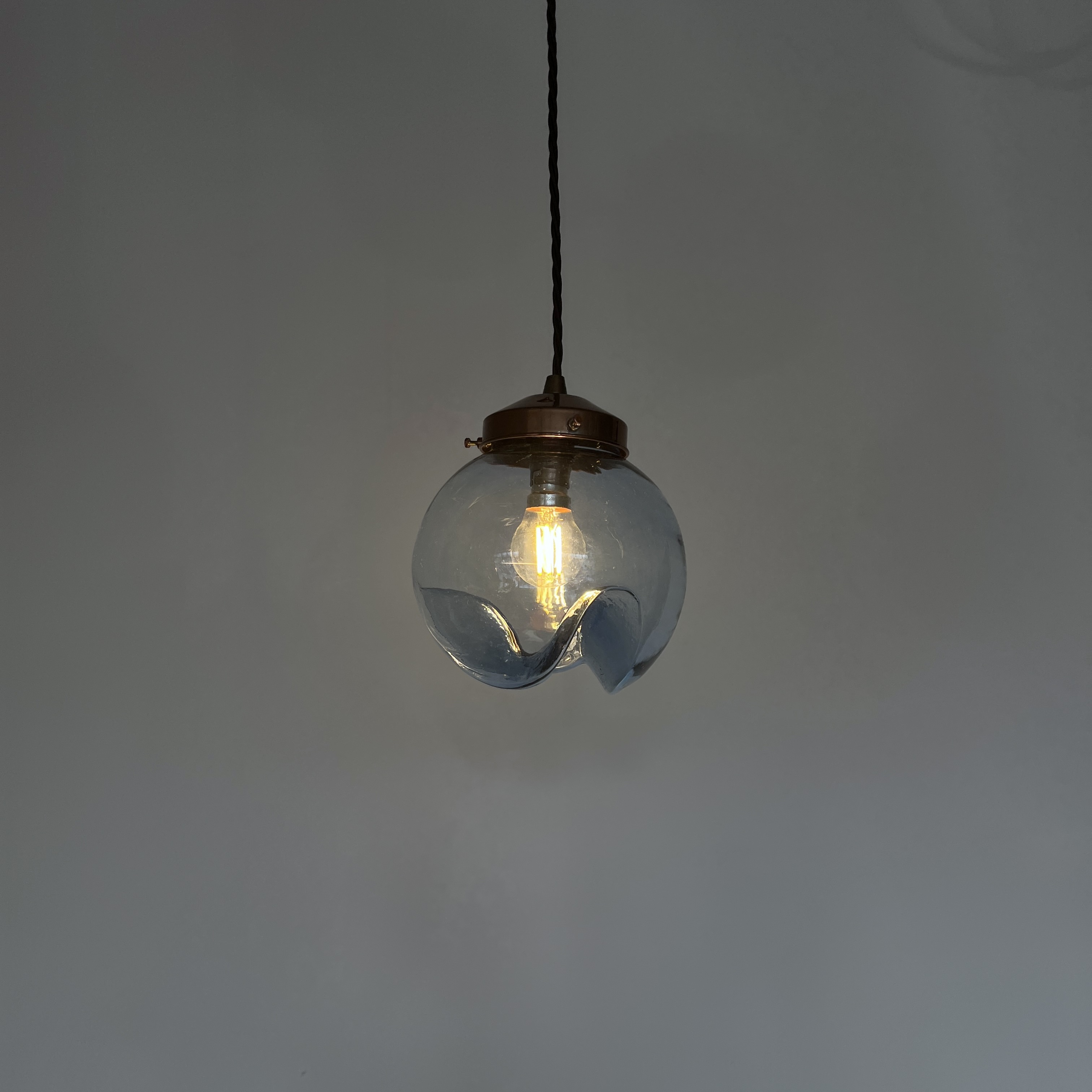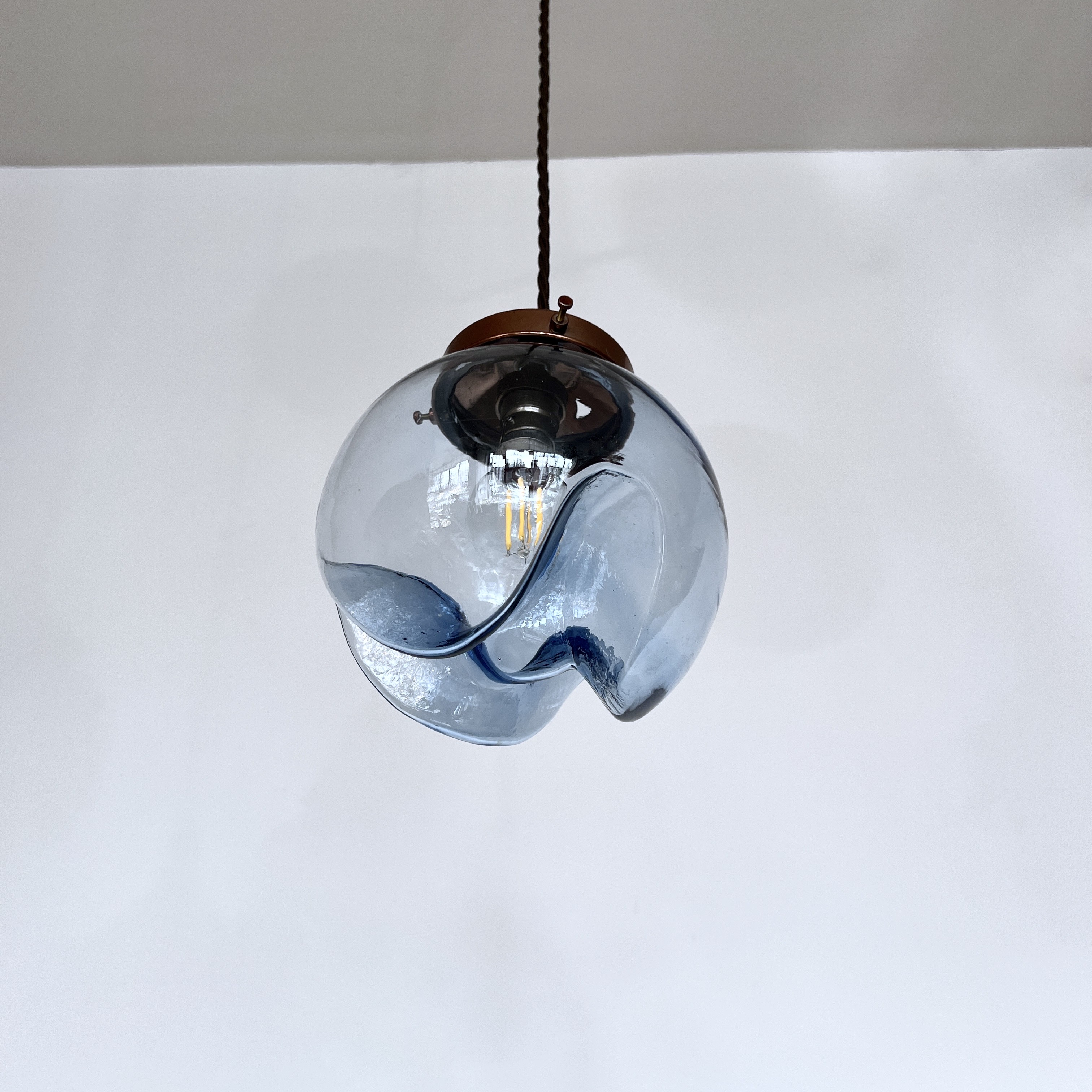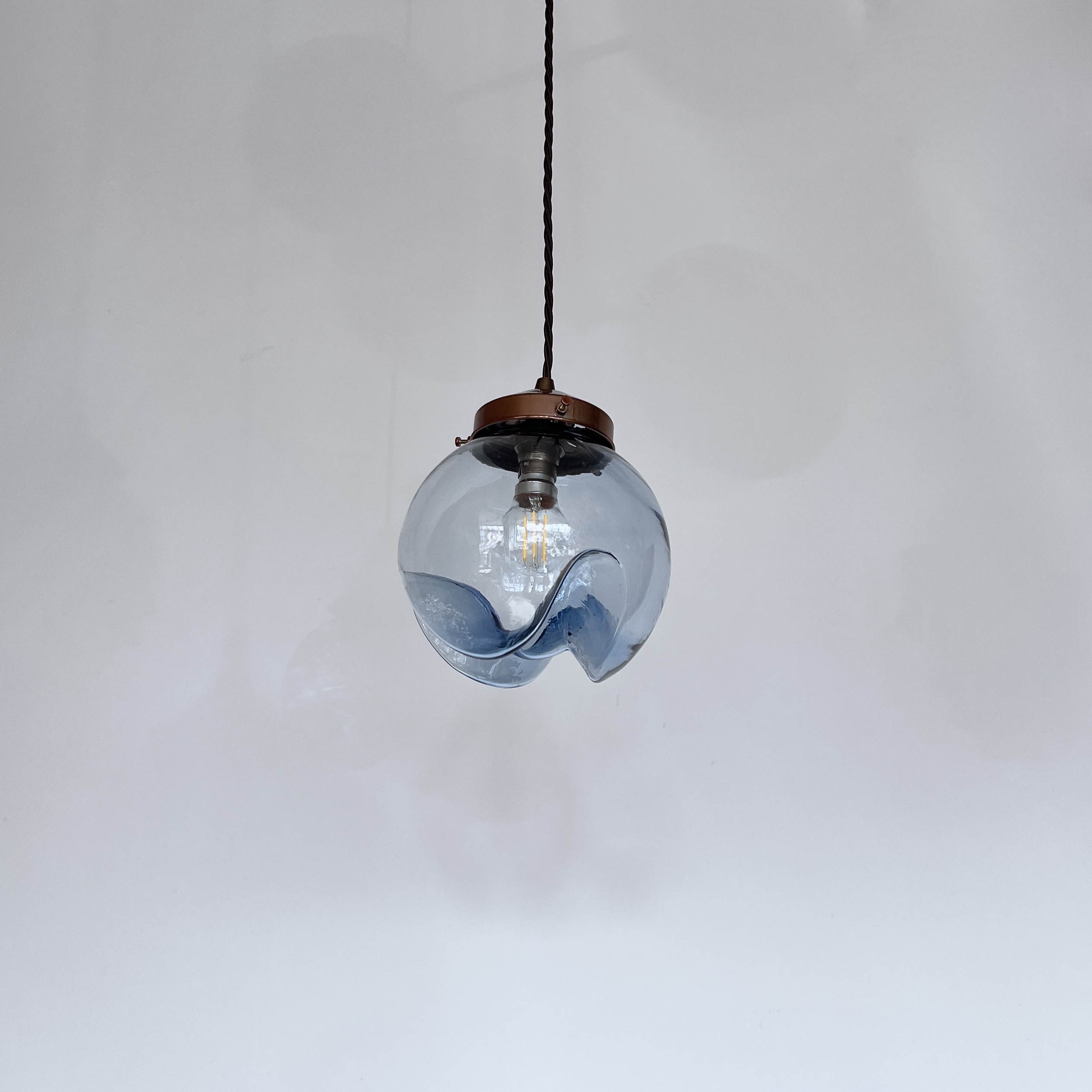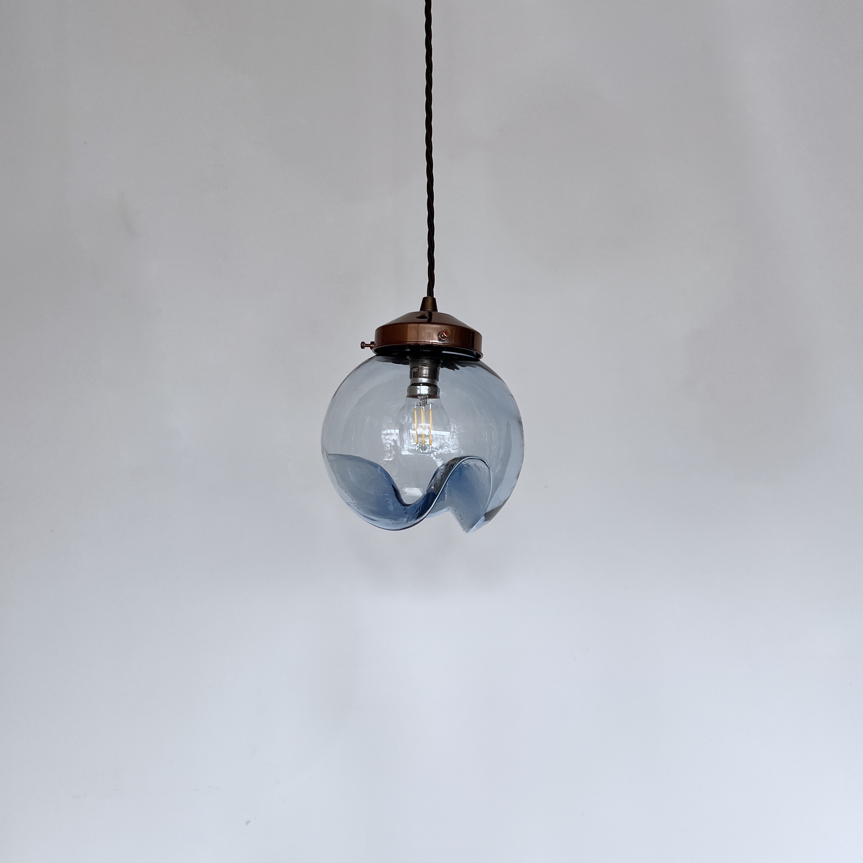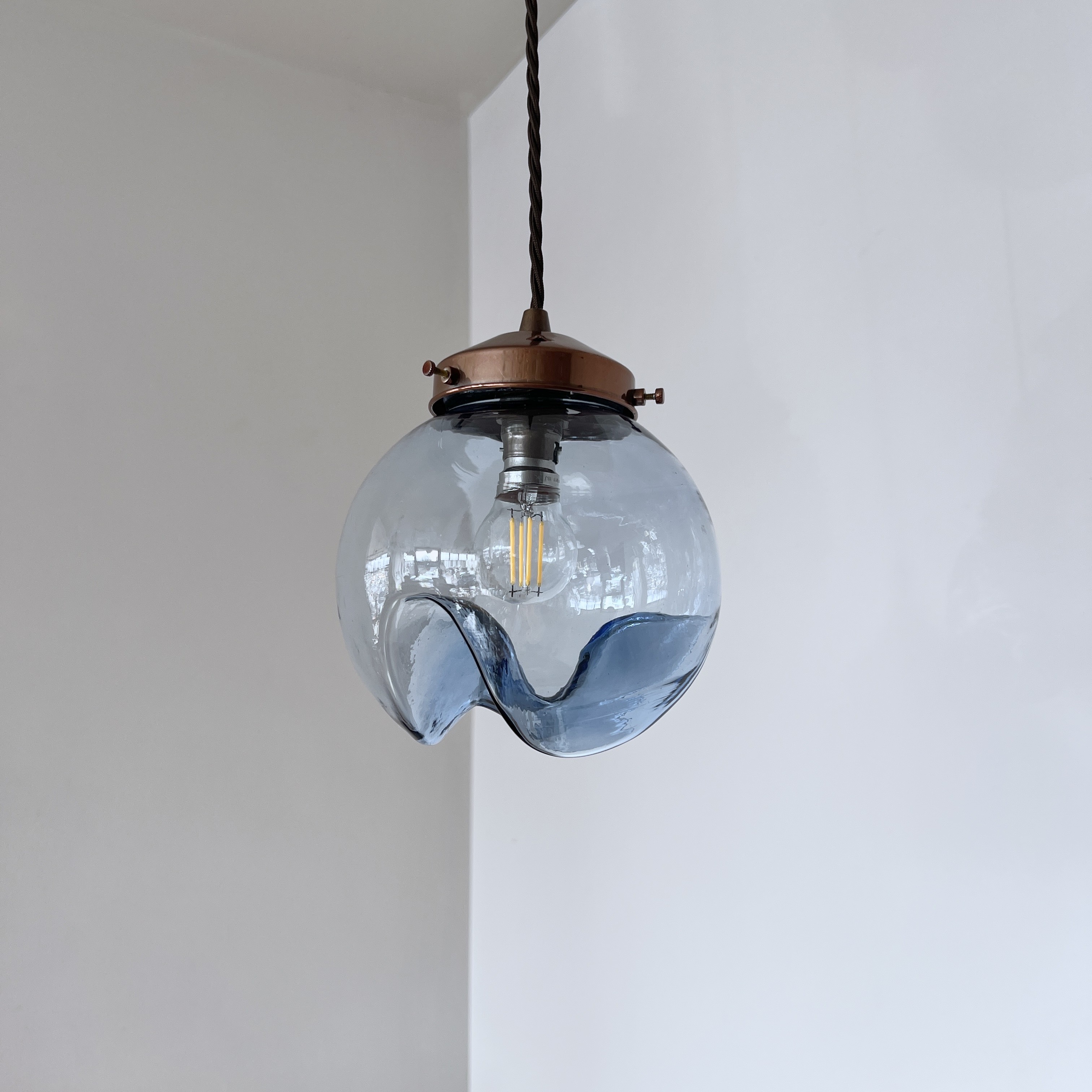 Murano for Mazzega globe blue glass shade. Rewired with a copper finish fitting and dark brown braided flex. This shade requires one B22 lamp this is not included but can be supplied. The braided flex can be changed to your preference and a matching ceiling fitting is supplied.