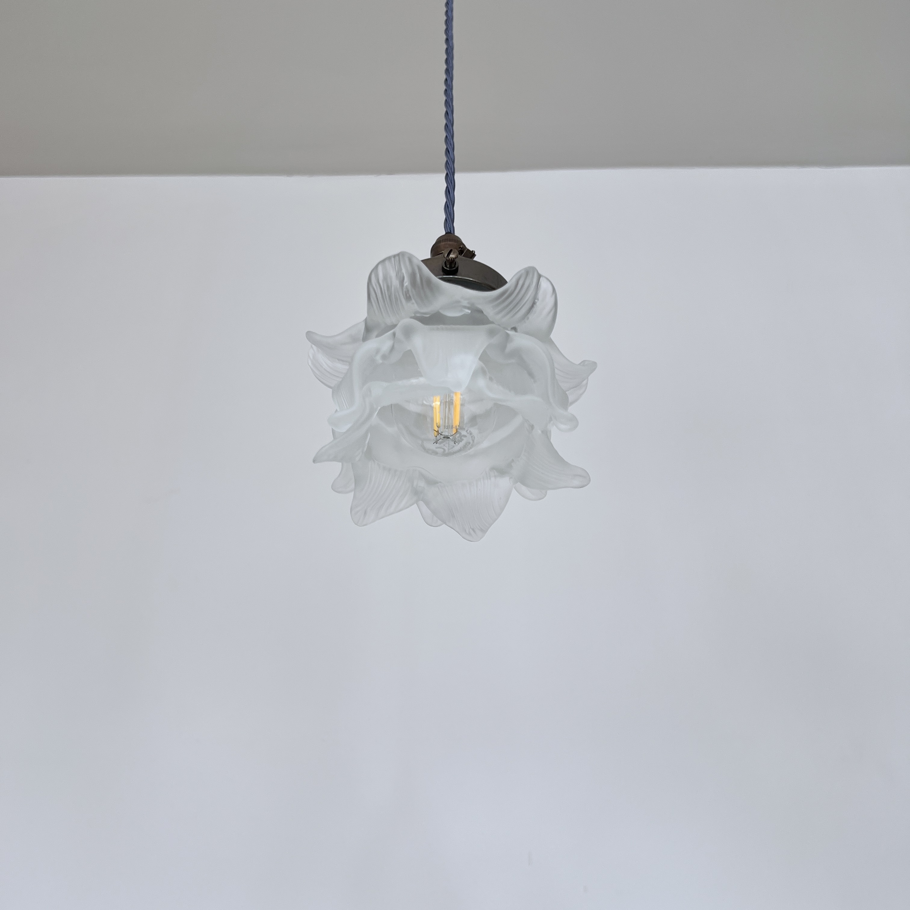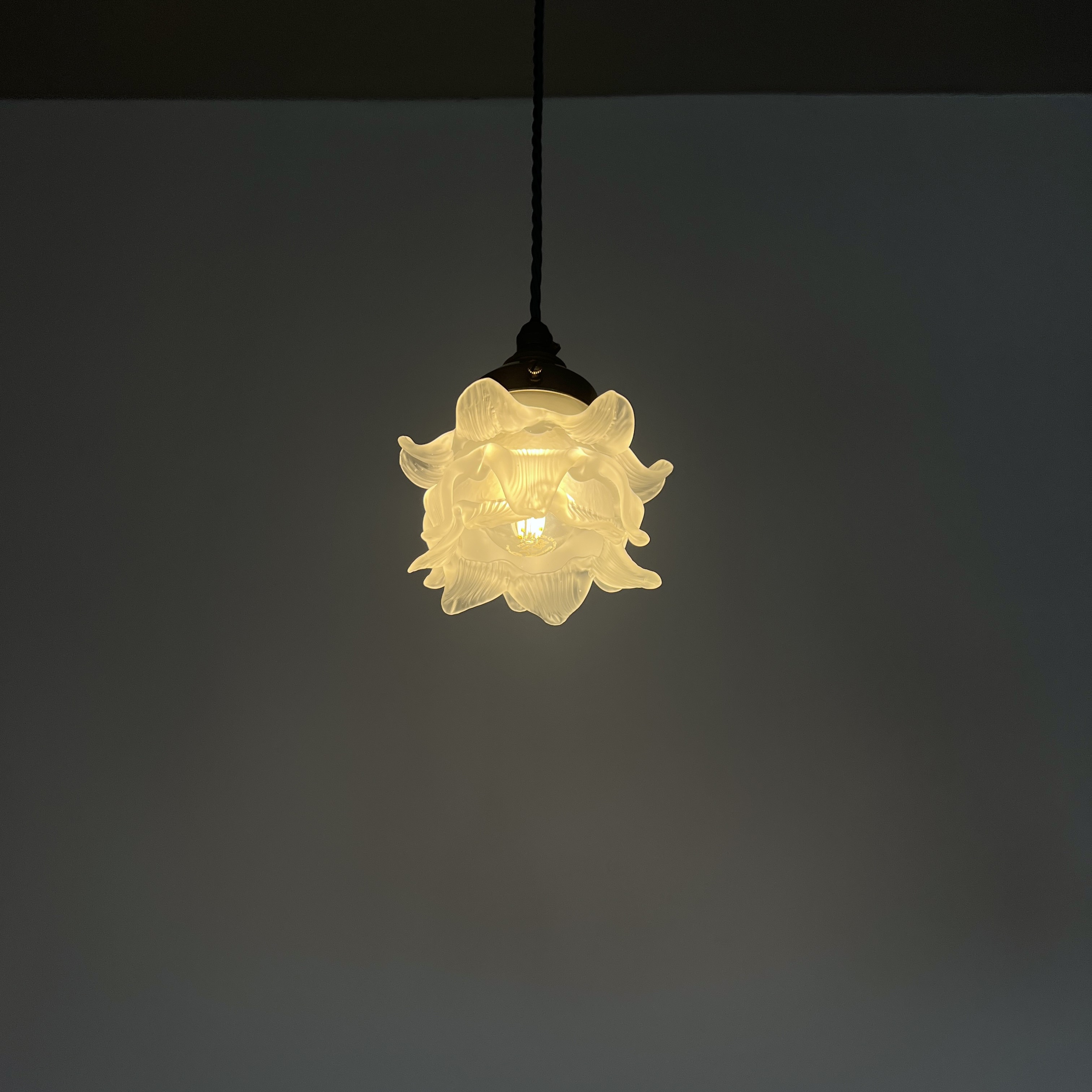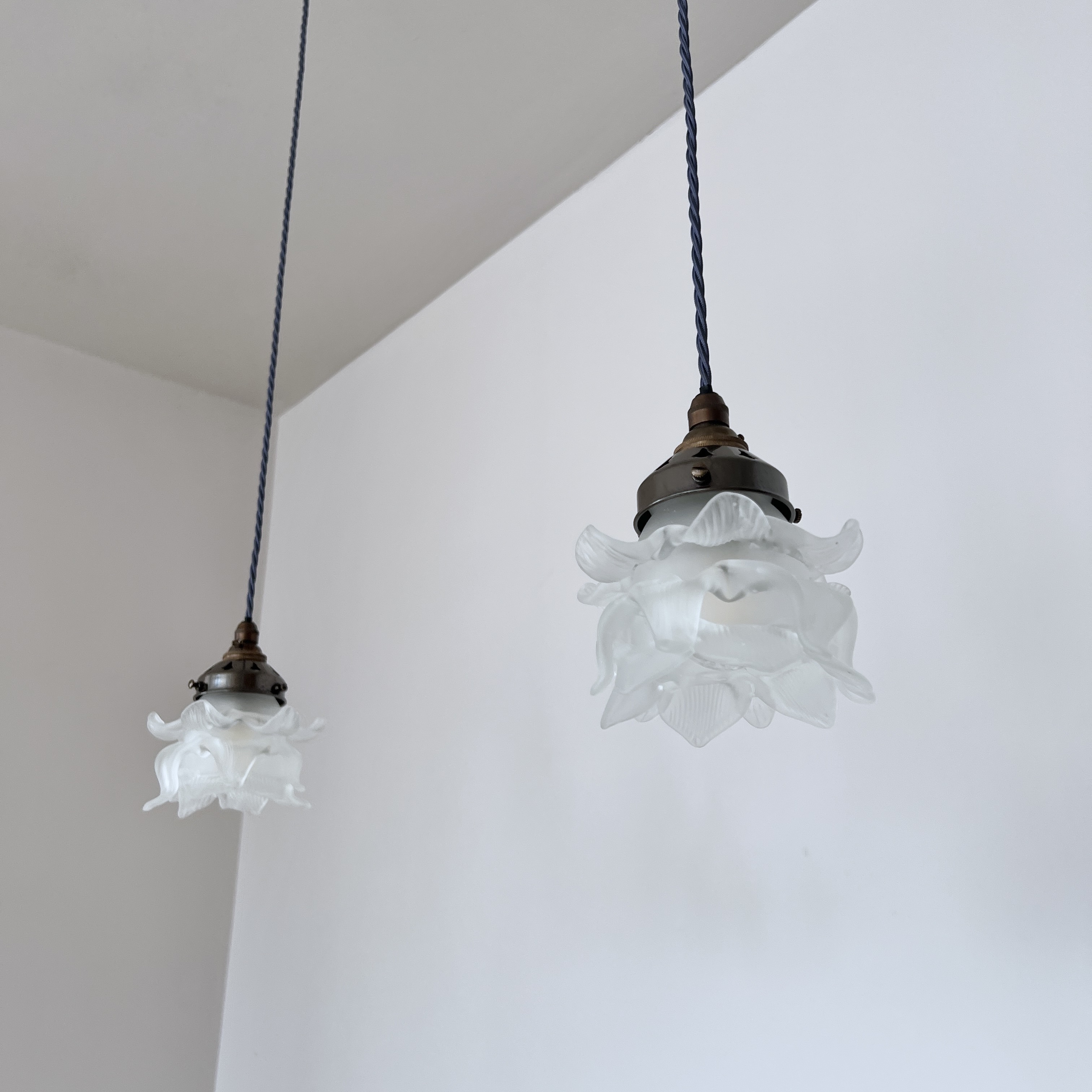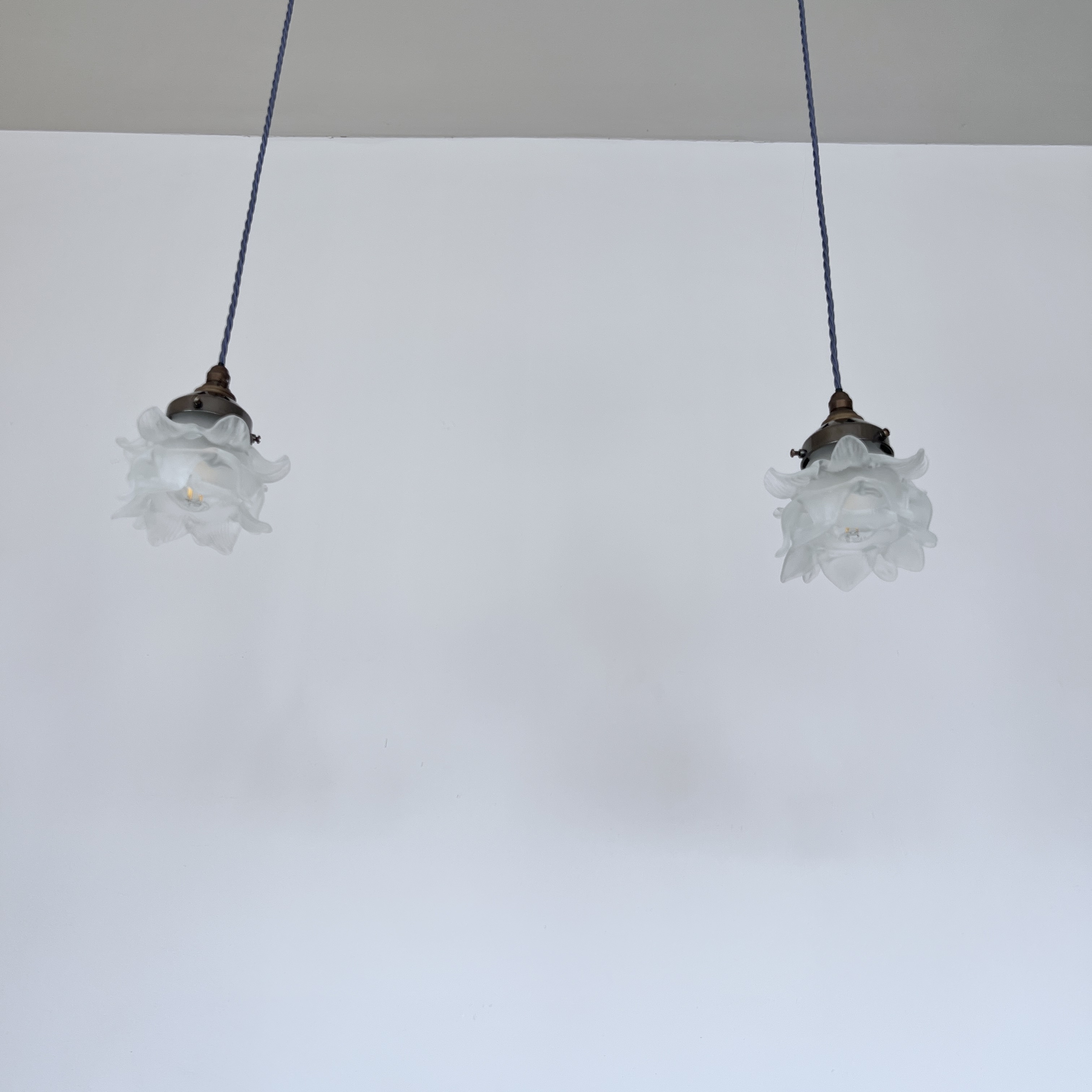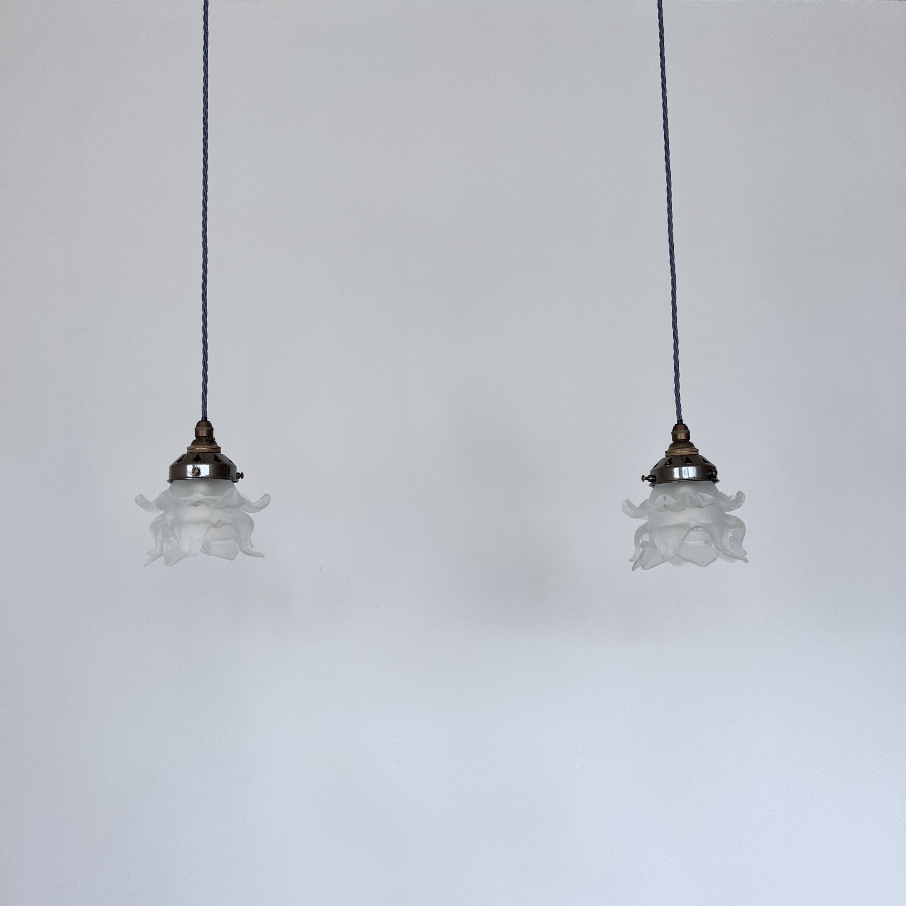 Pair of early 20th century moulded floral frosted glass shades. Rewired with an antique brass finish lamp fitting and lead blue braided flex. Each shade requires one B22 lamp. These are not included but can be supplied. The coloured flex can be changed to your preference and a matching ceiling fitting is supplied.