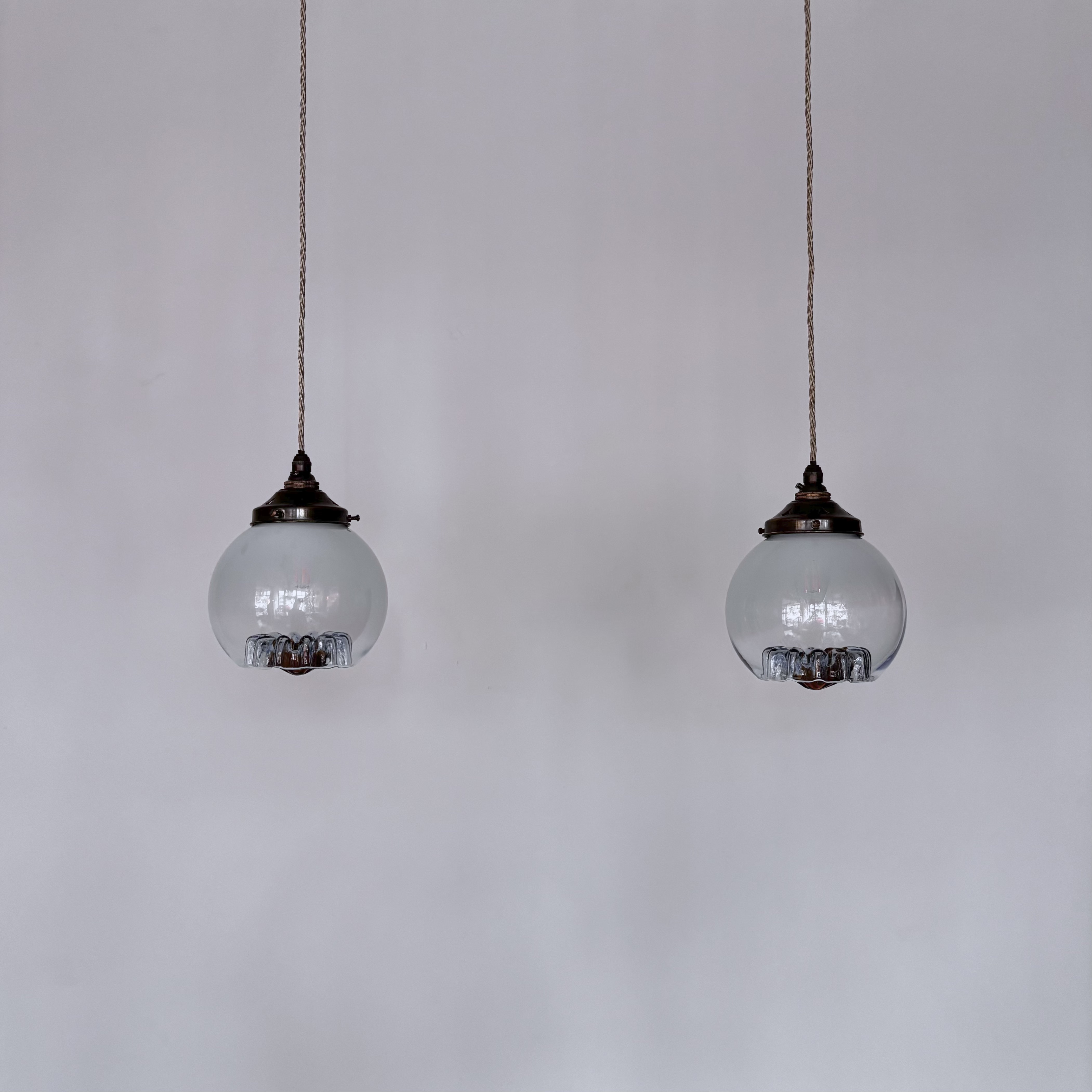 These shades have been fully rewired here, in Stockport, near Manchester by our small team of experts and are now ready to be installed. We recommend that they are installed by an electrician into a joist or a supporting noggin. To clean dust the brass components and flex regularly with a soft cloth. The glass shades can then be wiped with a glass wipe or a cloth that has been sprayed with glass cleaner. A final wipe with a paper towel will give a polished finish.