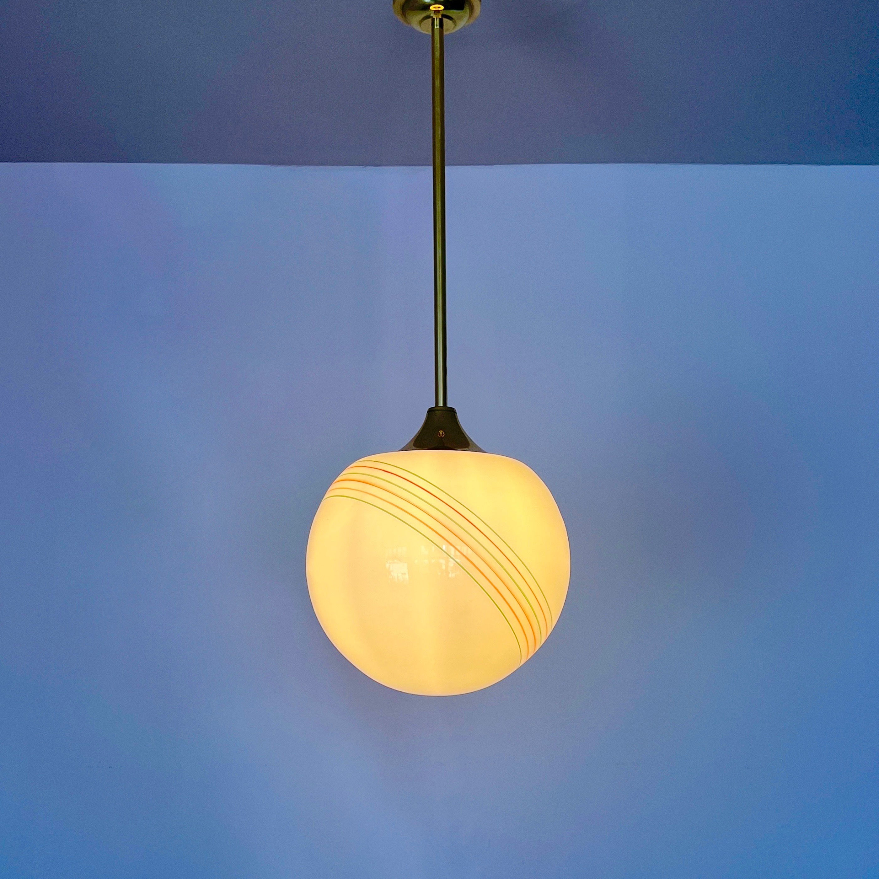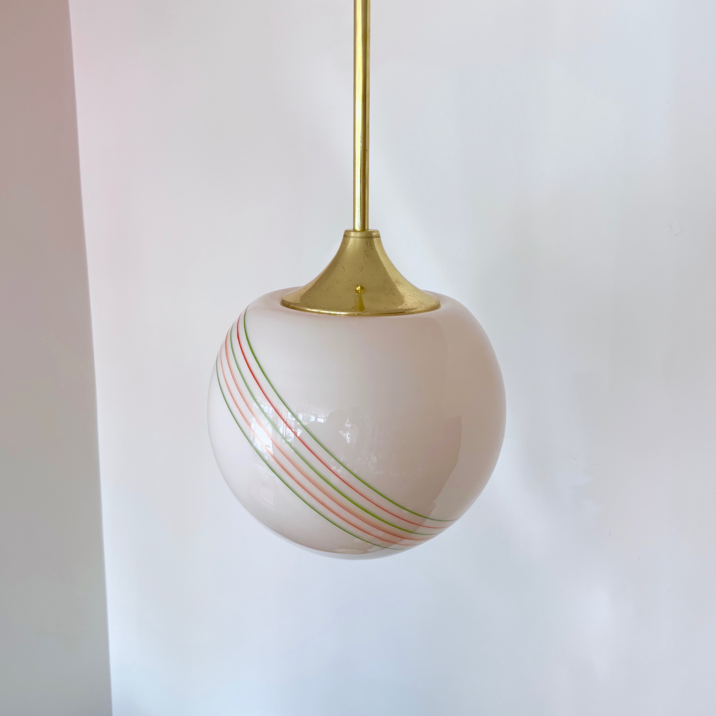 Mid Century pink polished globe shade with red & green band details. Rewired with its original brass fitting rewired with a brass bar and fits straight to the ceiling. This shade requires one B22 lamp.