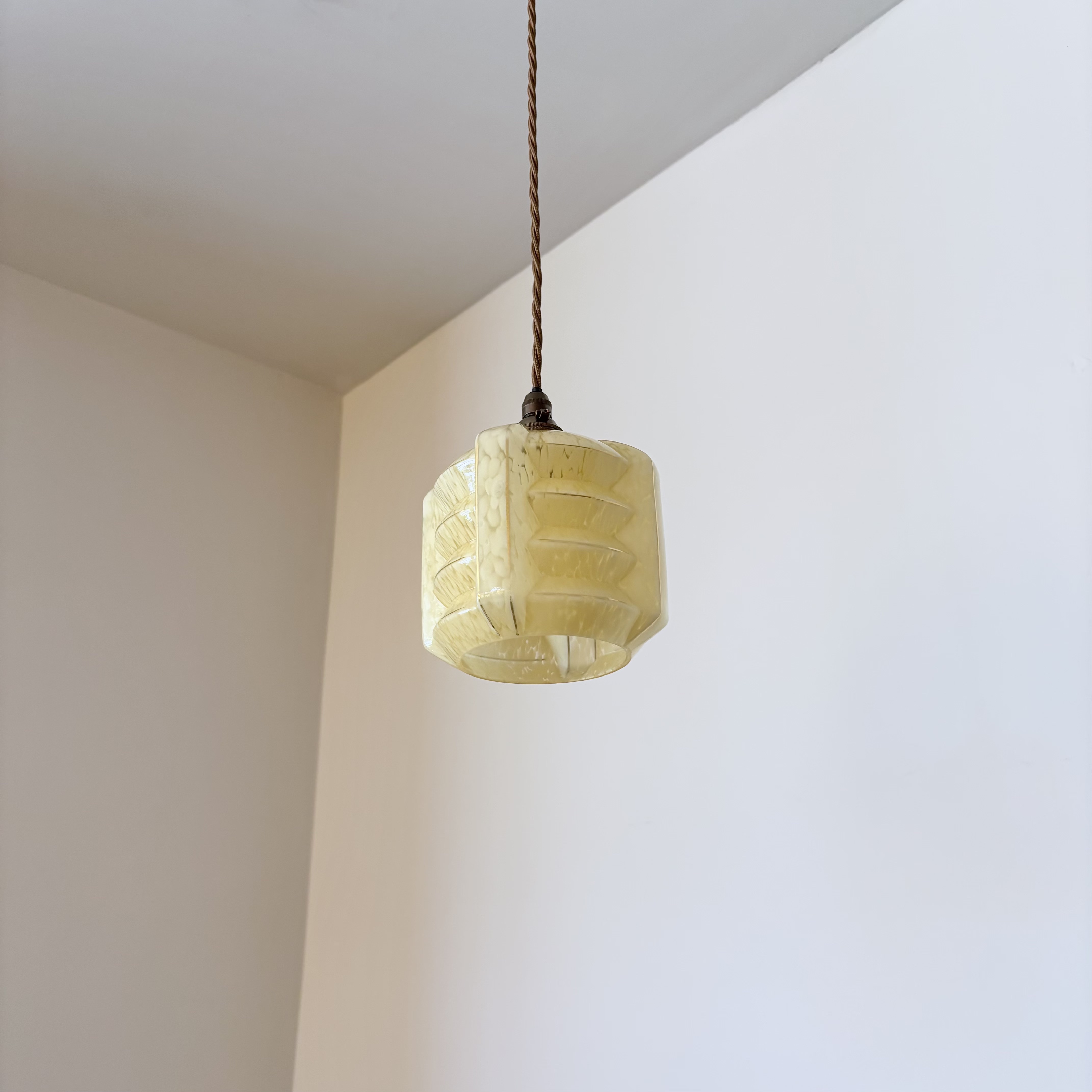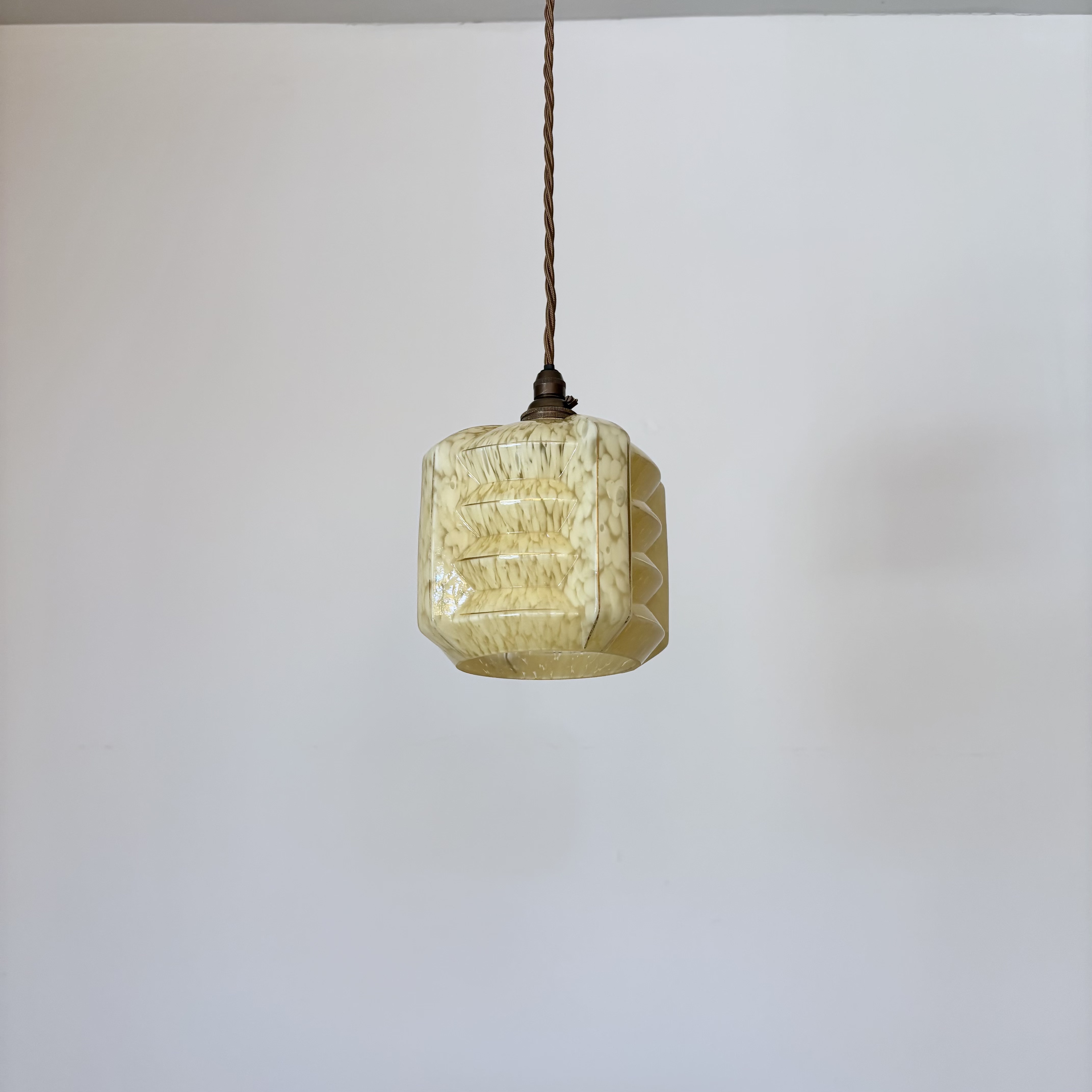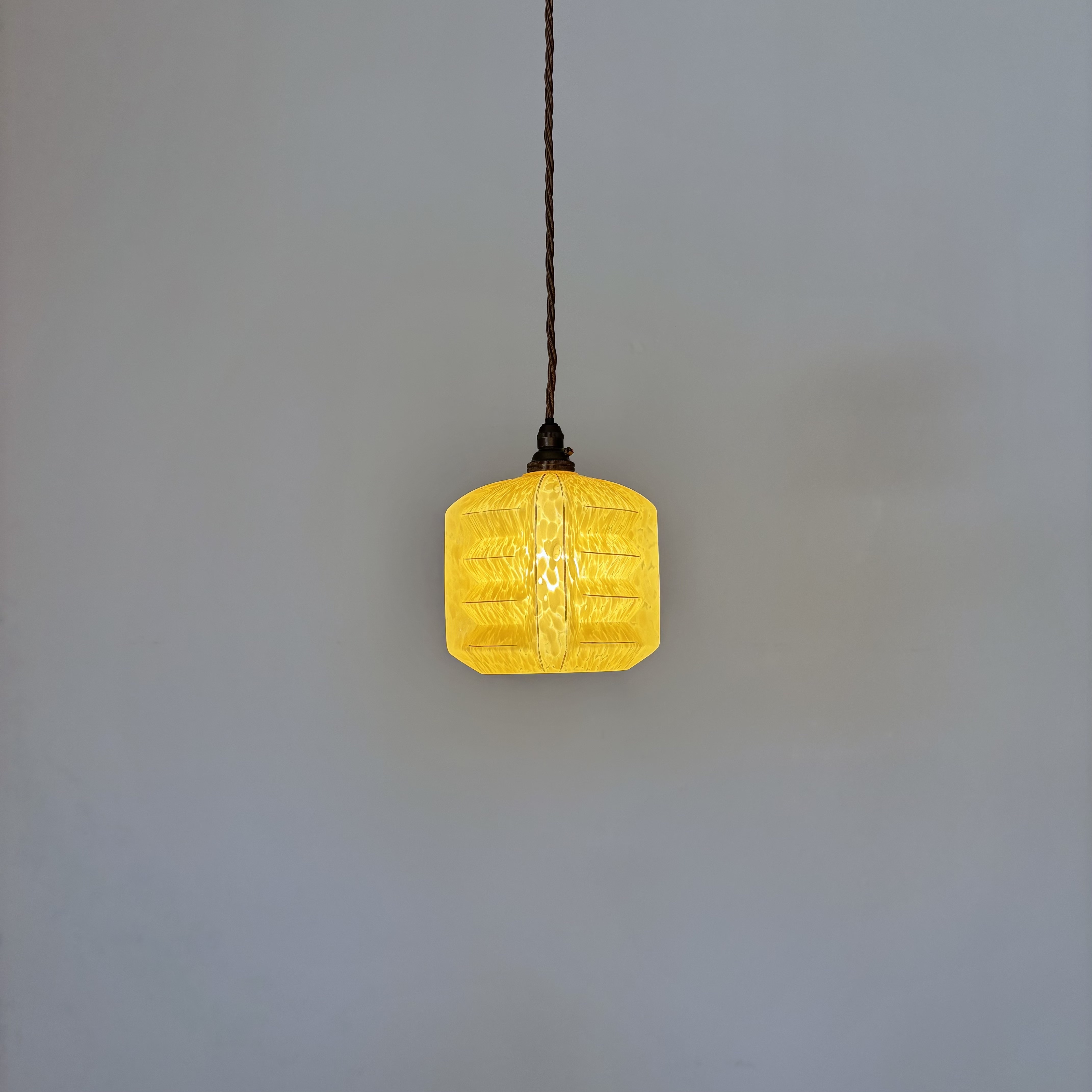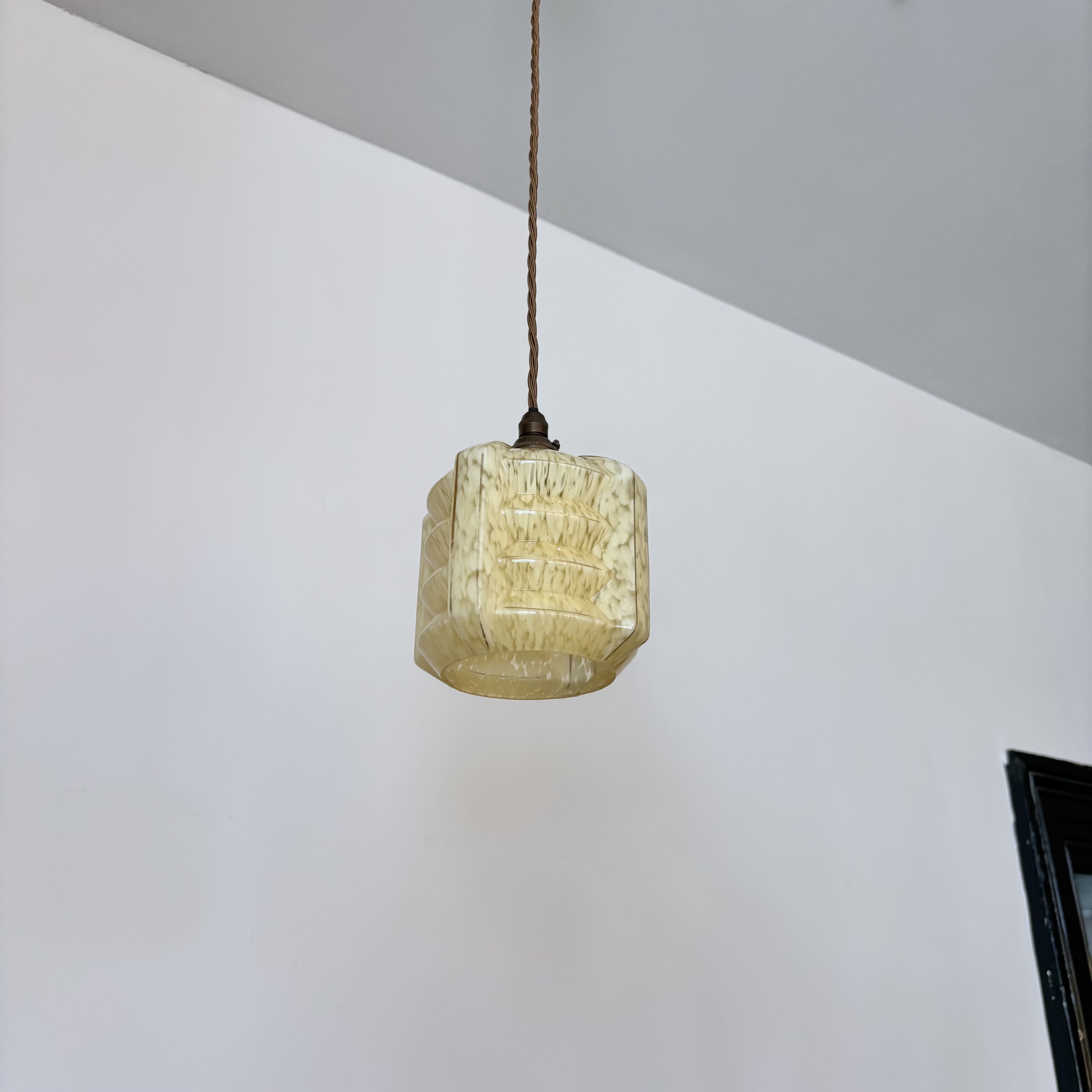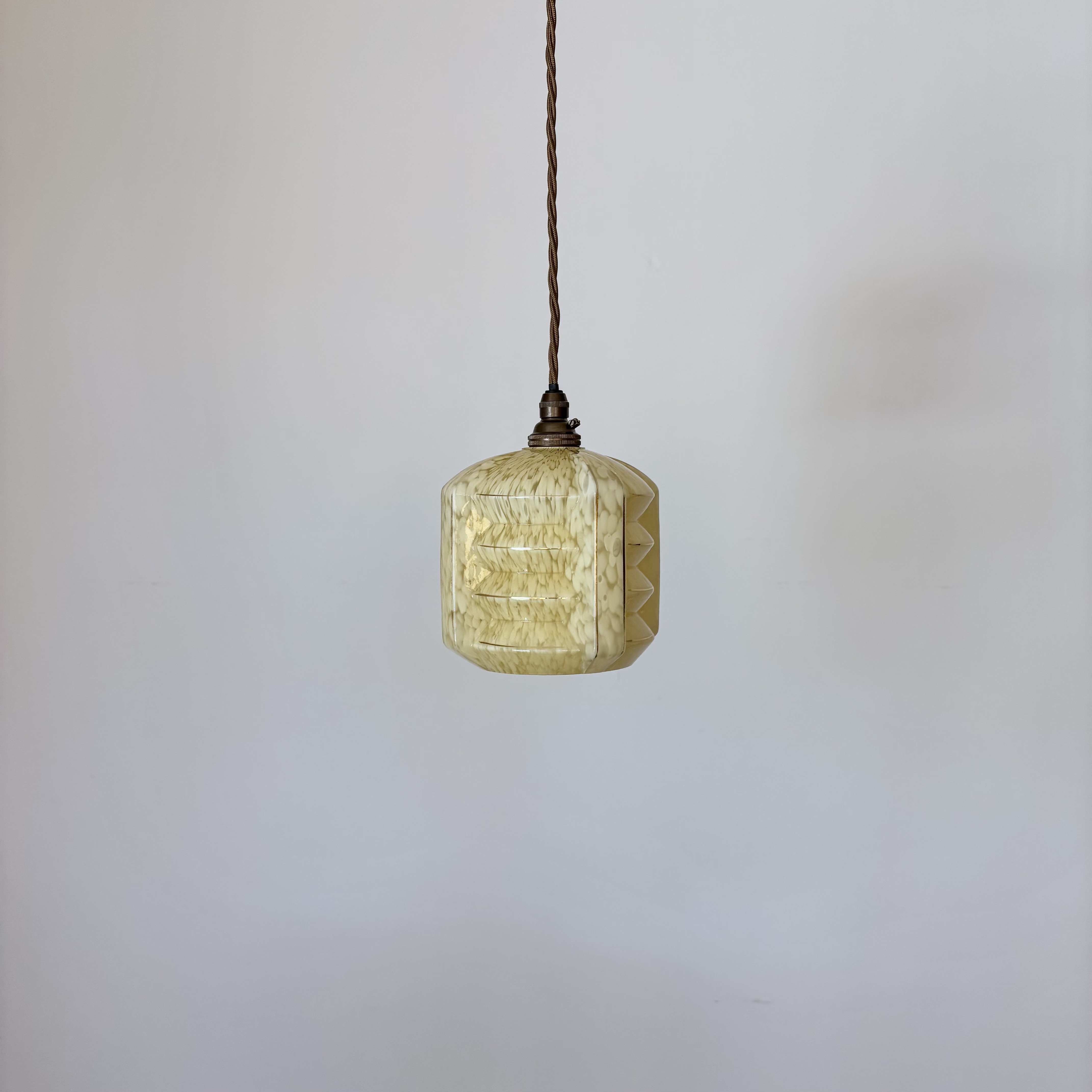 Pale yellow shade with gold bands. Rewired with an antique brass finish fitting and dark brown braided flex. This shade requires one B22 lamp this is not included but can be supplied. The coloured flex can be changed to your preference and a matching ceiling fitting is supplied.
