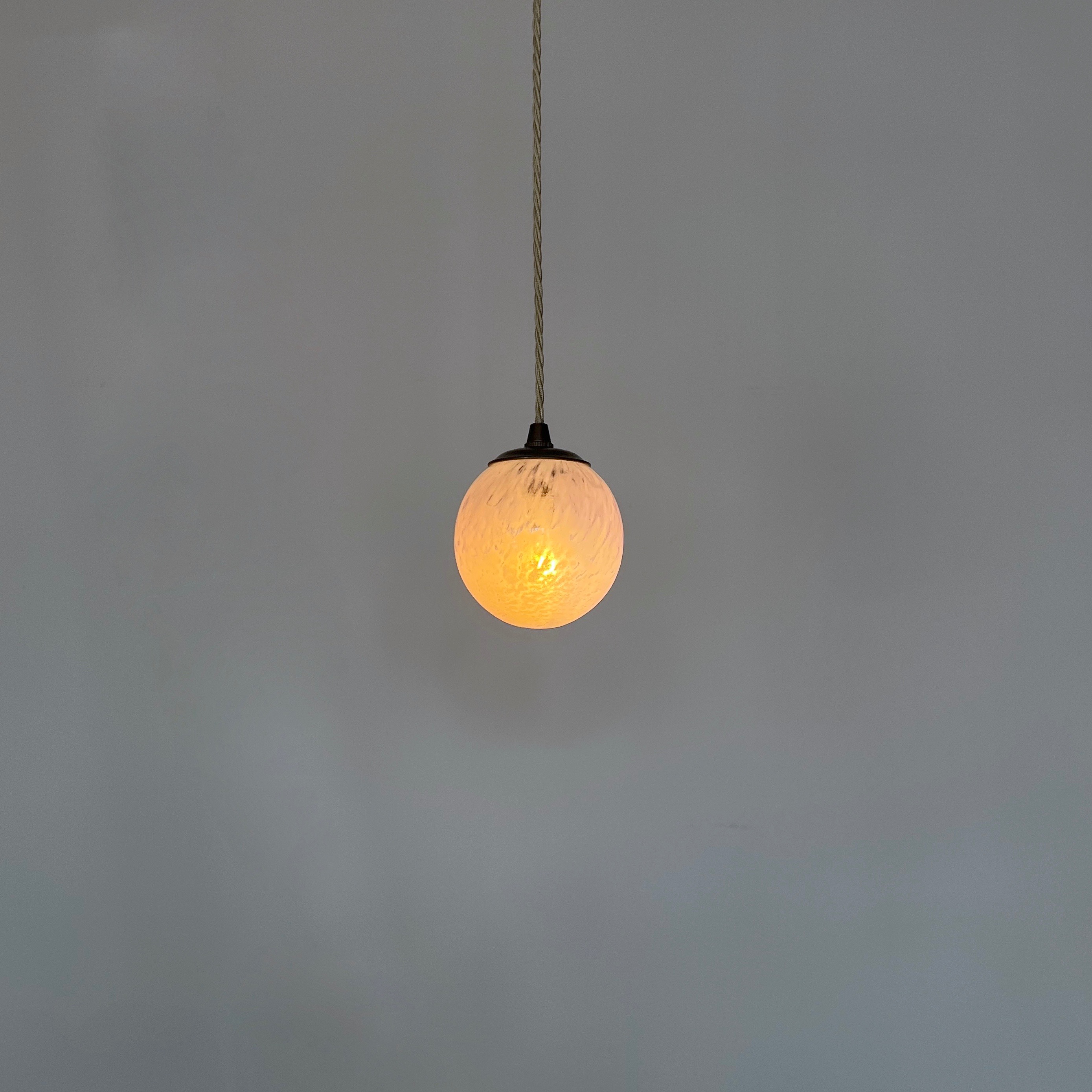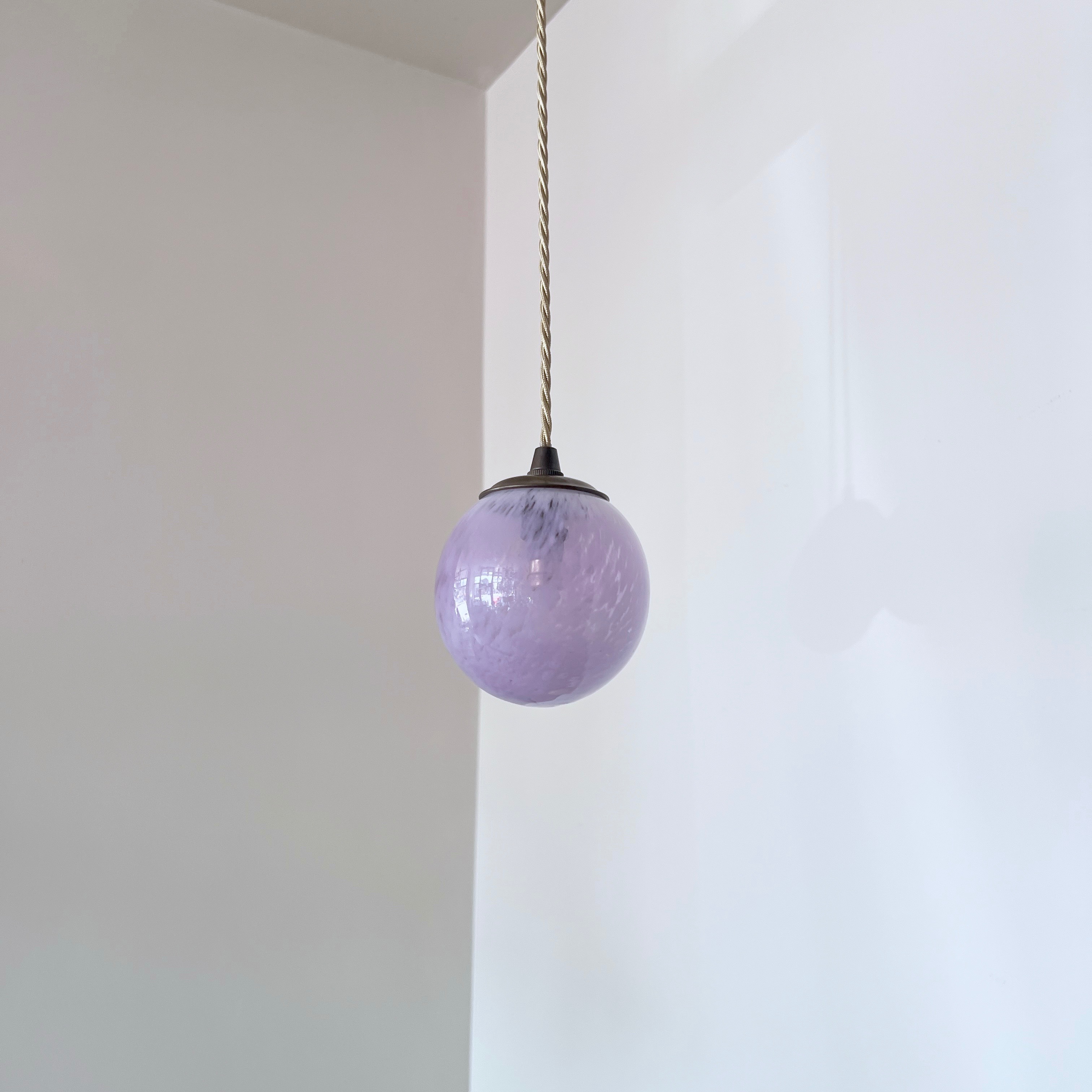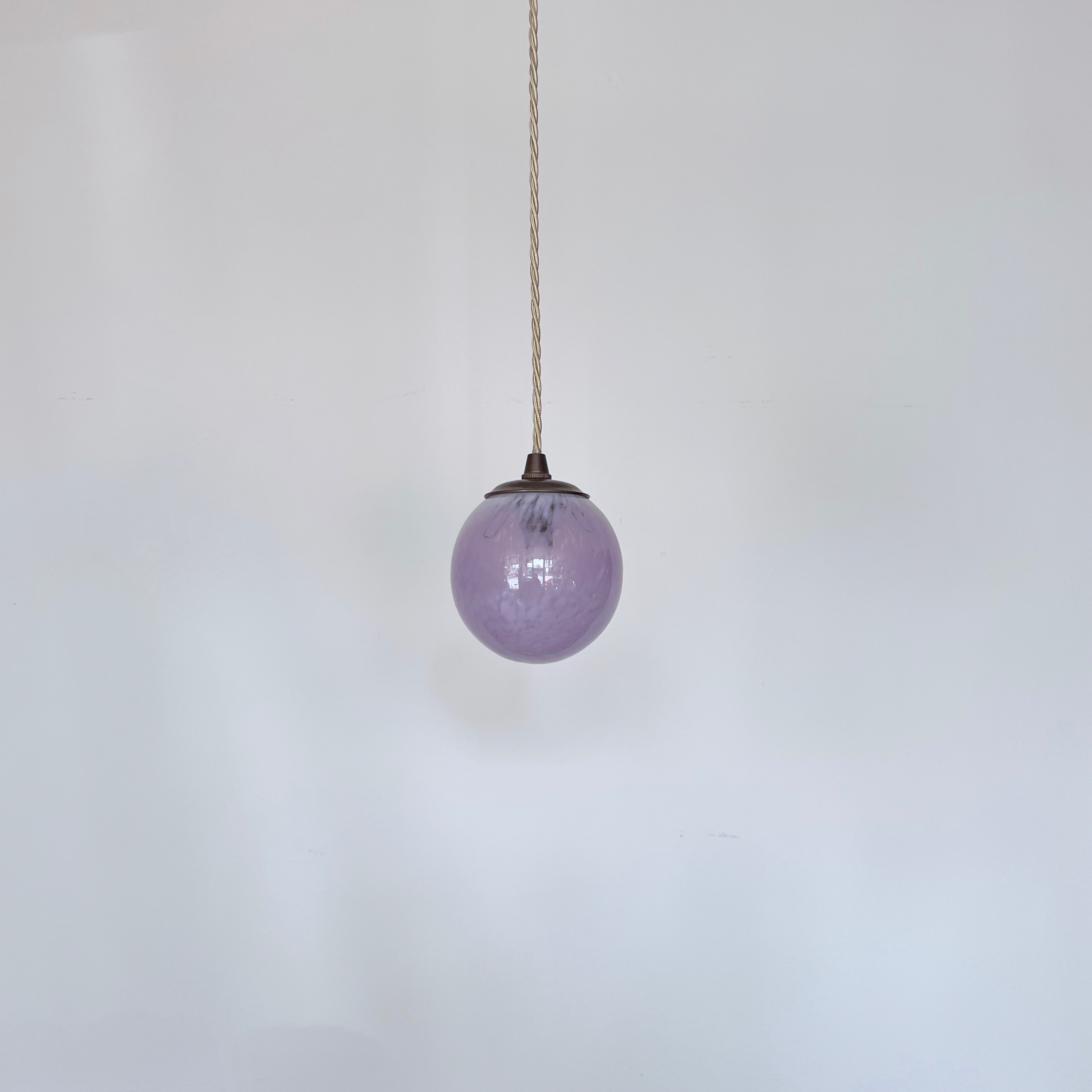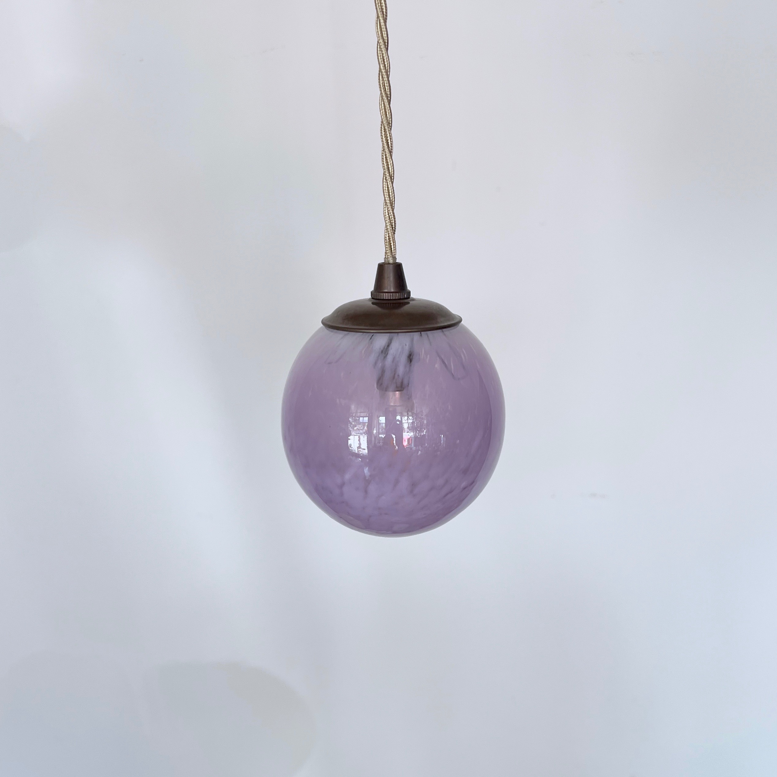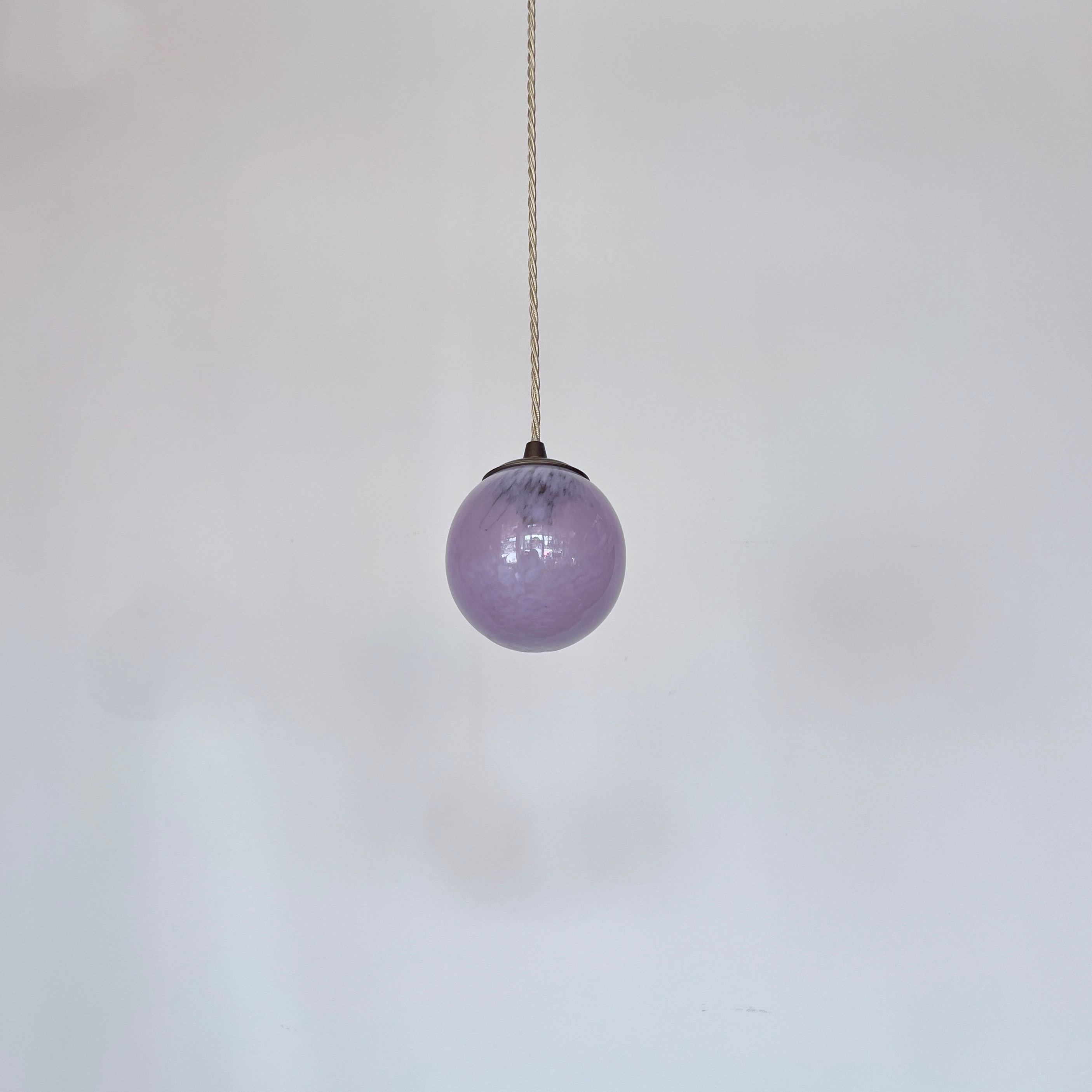 Moulded mottled purple glass globe shade pendant. Rewired with an antique brass finish fitting and beige braided flex. This shade requires one B15 pygmy lamp this is not included but can be supplied. The coloured flex can be changed to your preference and a matching ceiling fitting is supplied.