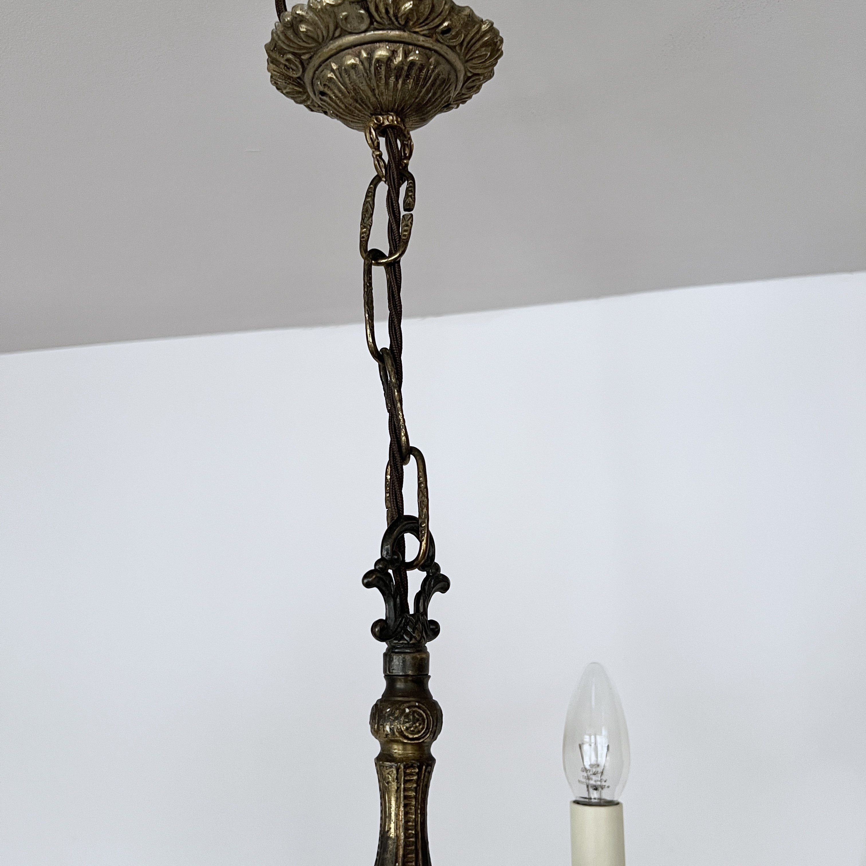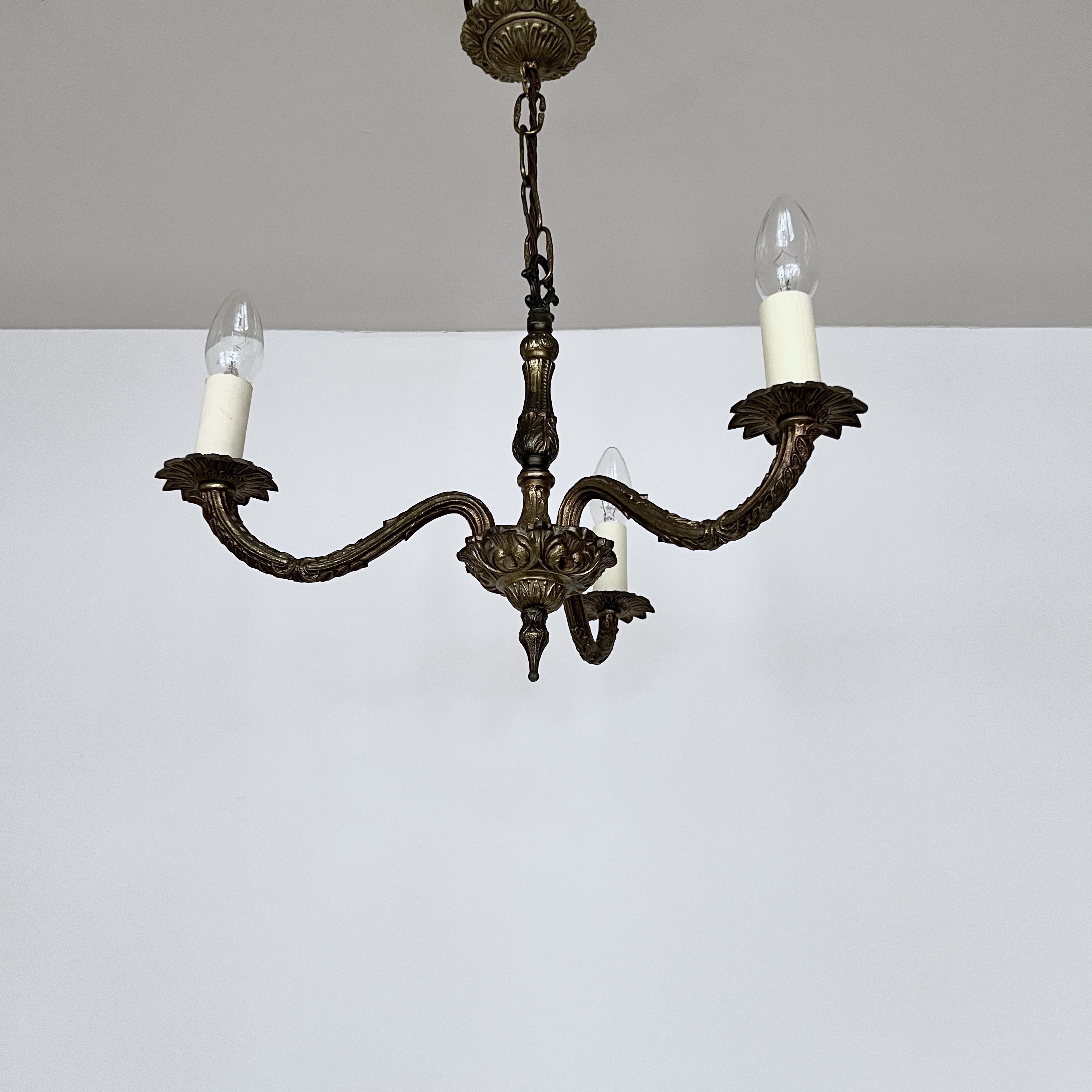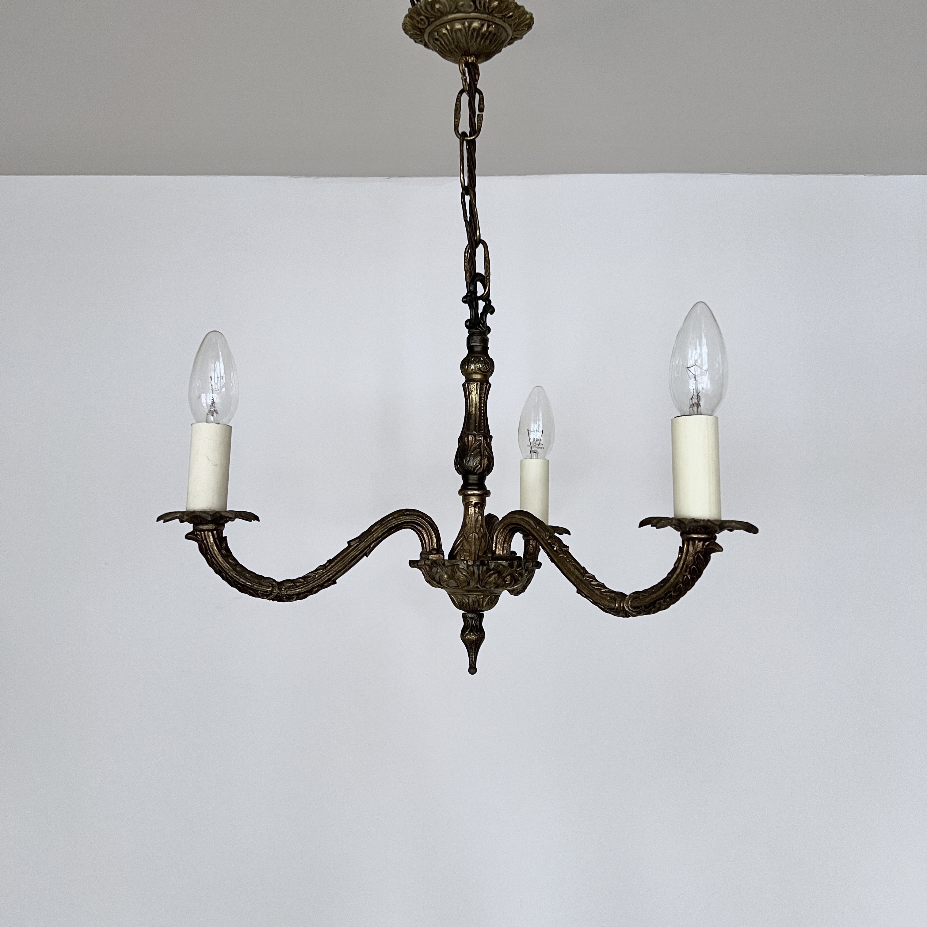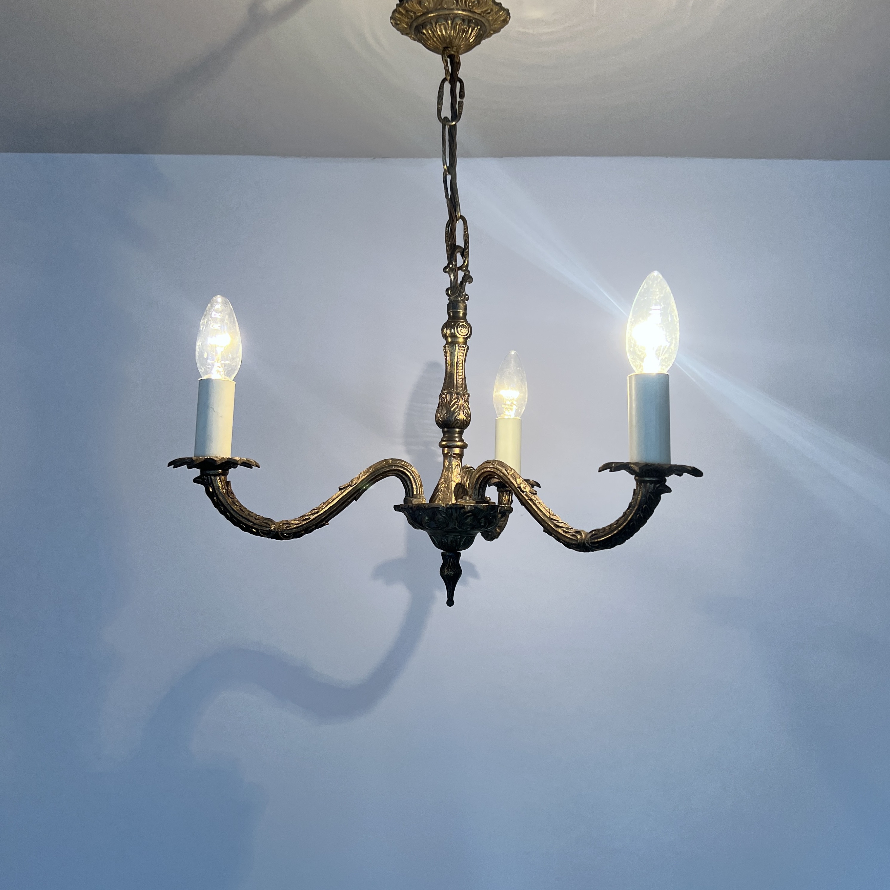 Ornate cast brass chandelier three brass decorative arms. The chandelier comes supplied with braided flex, chain and a ceiling rose. Chandelier requires SES lamps, these are not included but can be supplied.