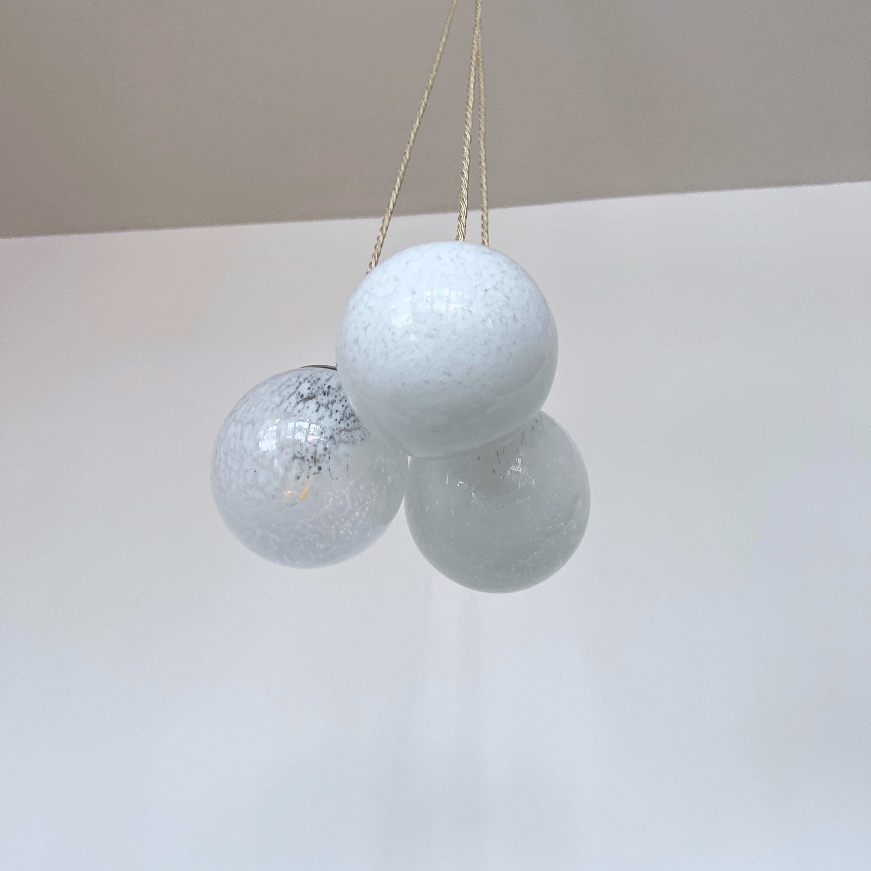 Three moulded mottled white glass globe shade pendants. Rewired with an antique brass finish fitting and beige braided flex. Each shade is slightly different and each requires one B15 pygmy lamp these is not included but can be supplied. The coloured flex can be changed to your preference and a matching ceiling fitting is supplied.