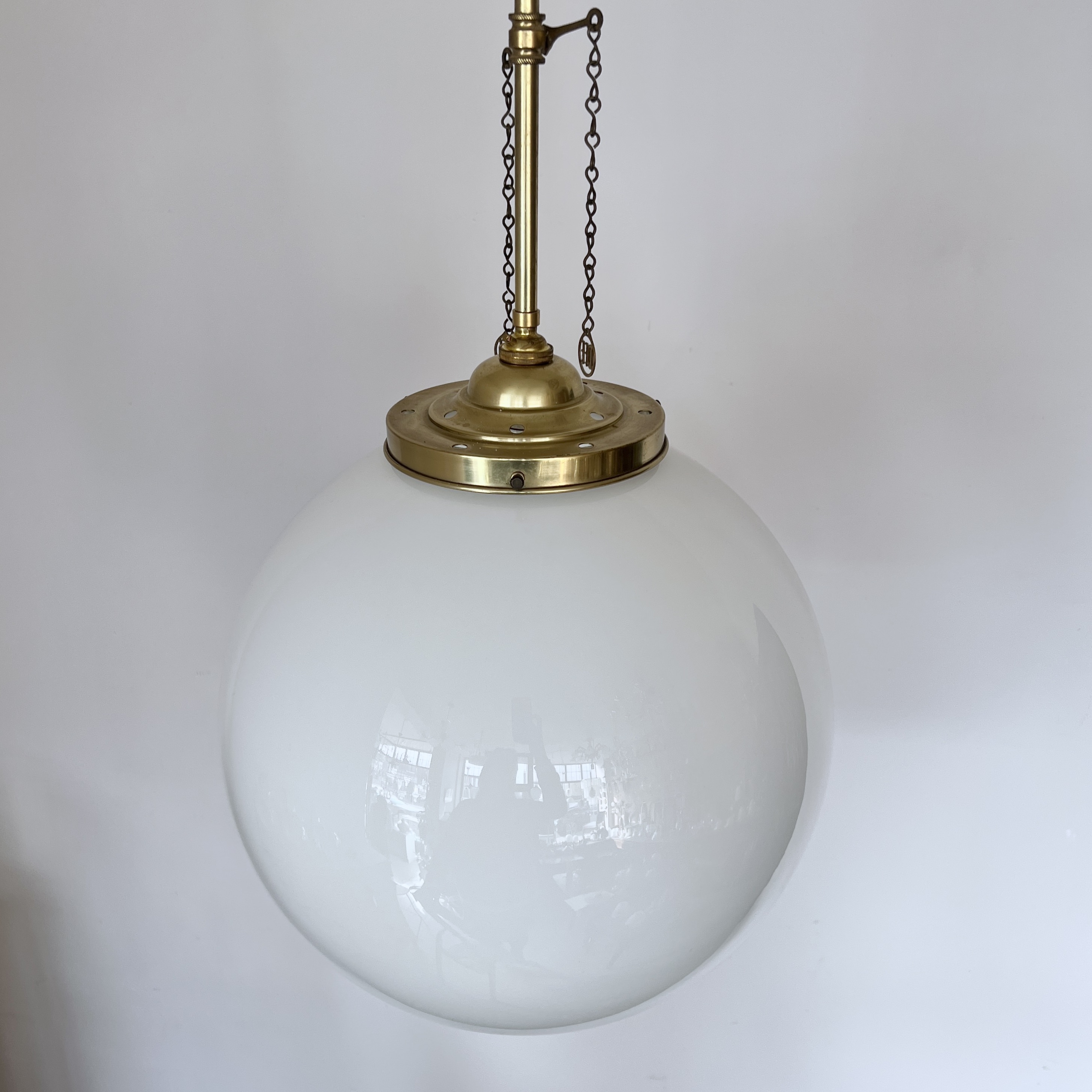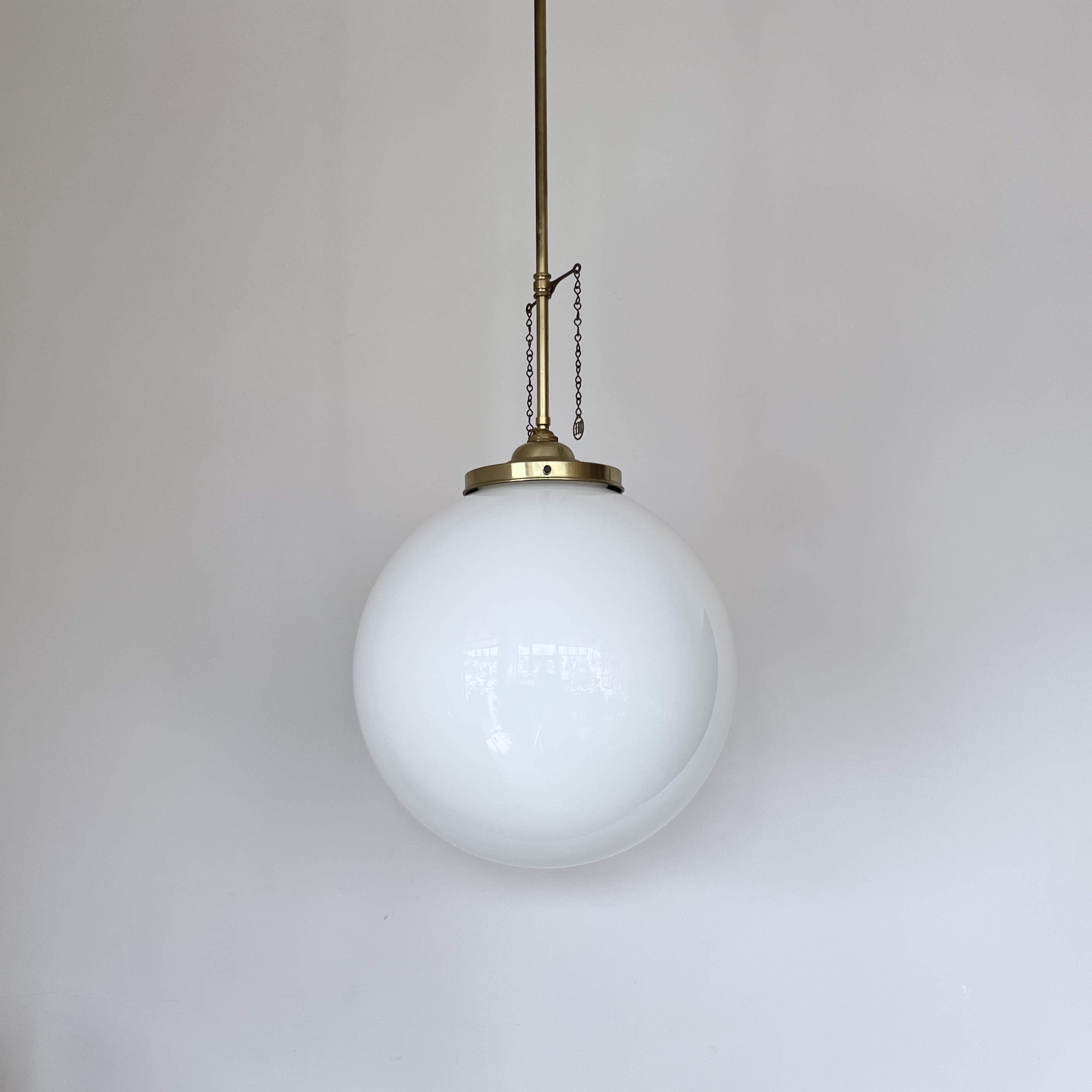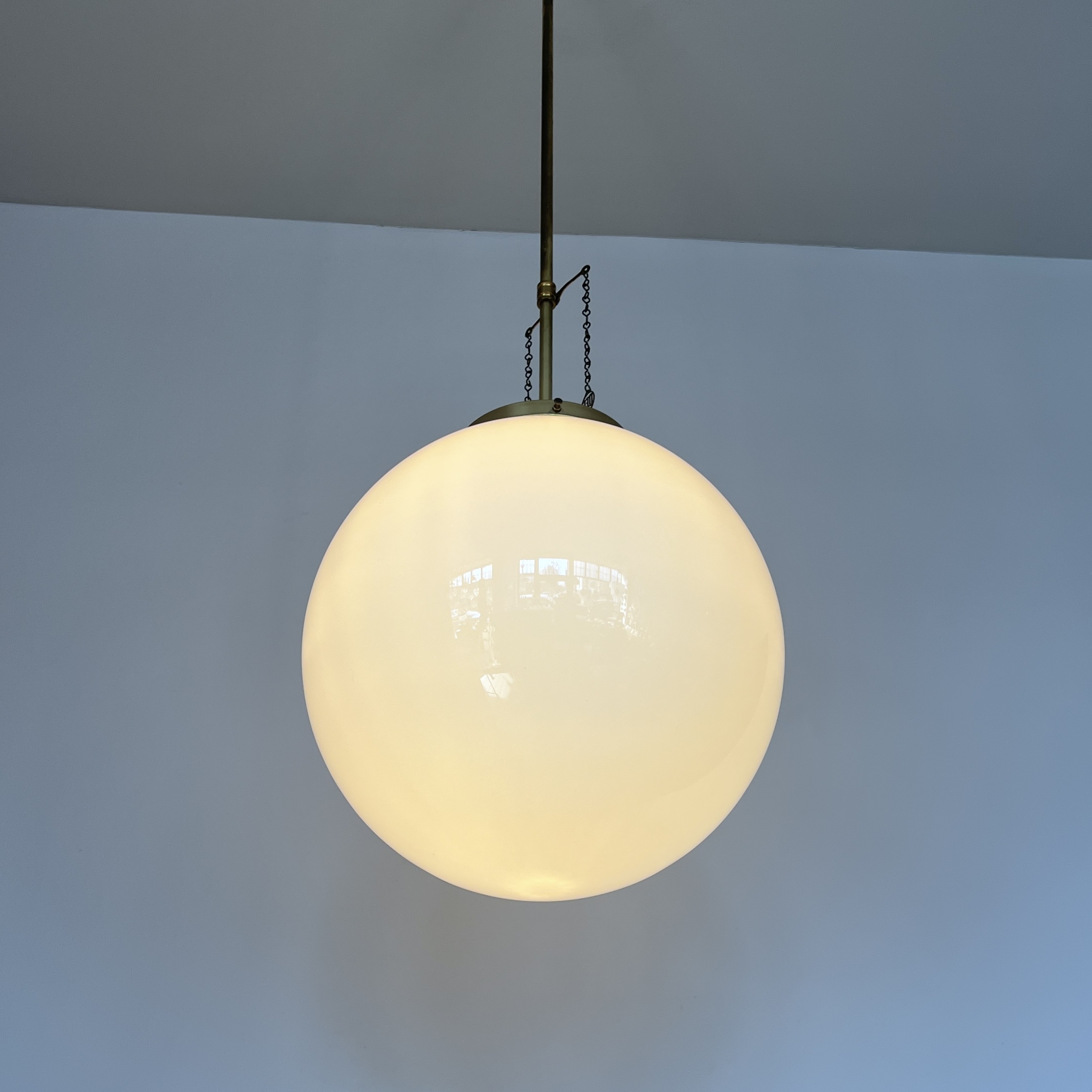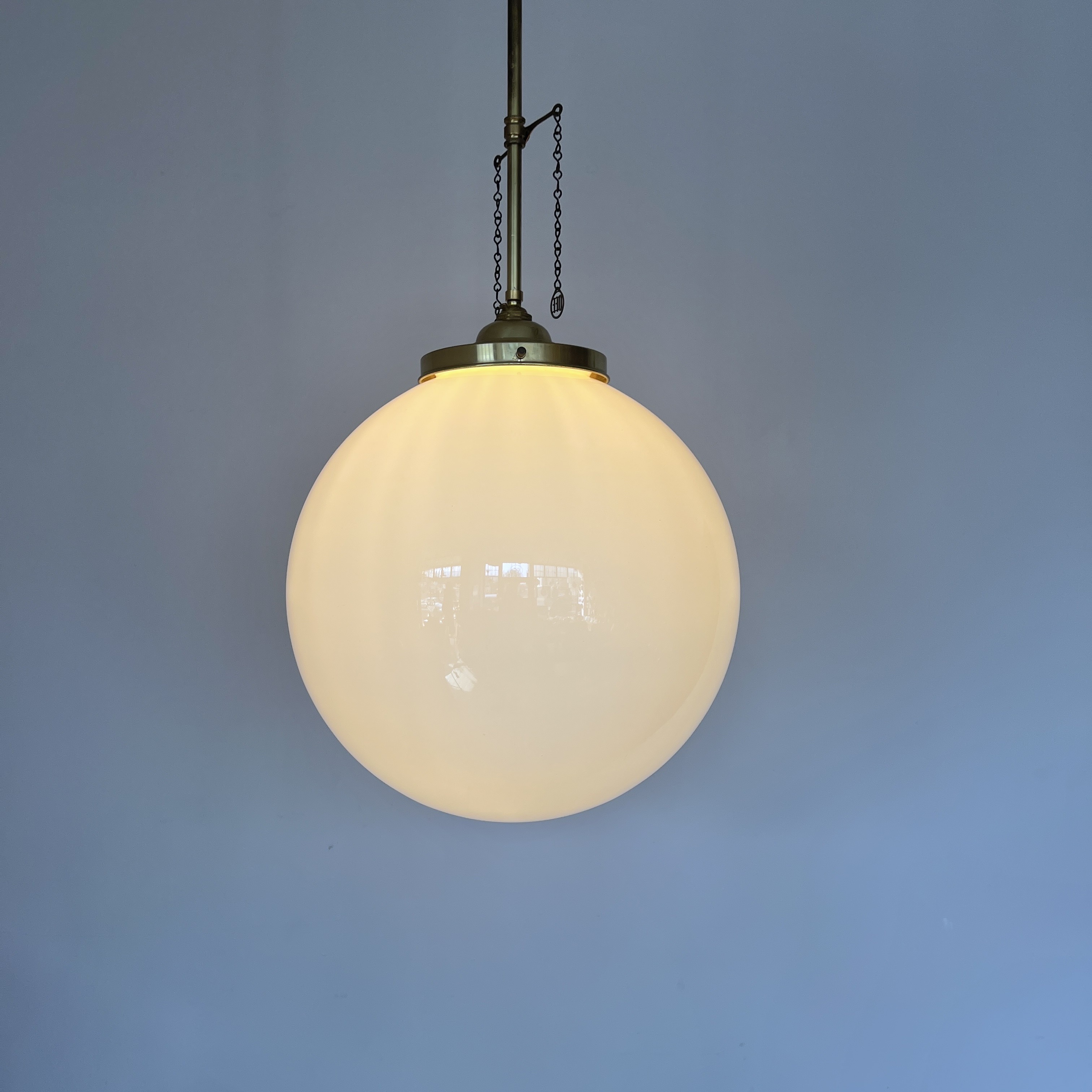 Original Art deco globe shade with brass stem. This piece fits directly to the ceiling. The central bar could be shortened if needed. The pendant requires an E27 bulb, this is not included but could be supplied.